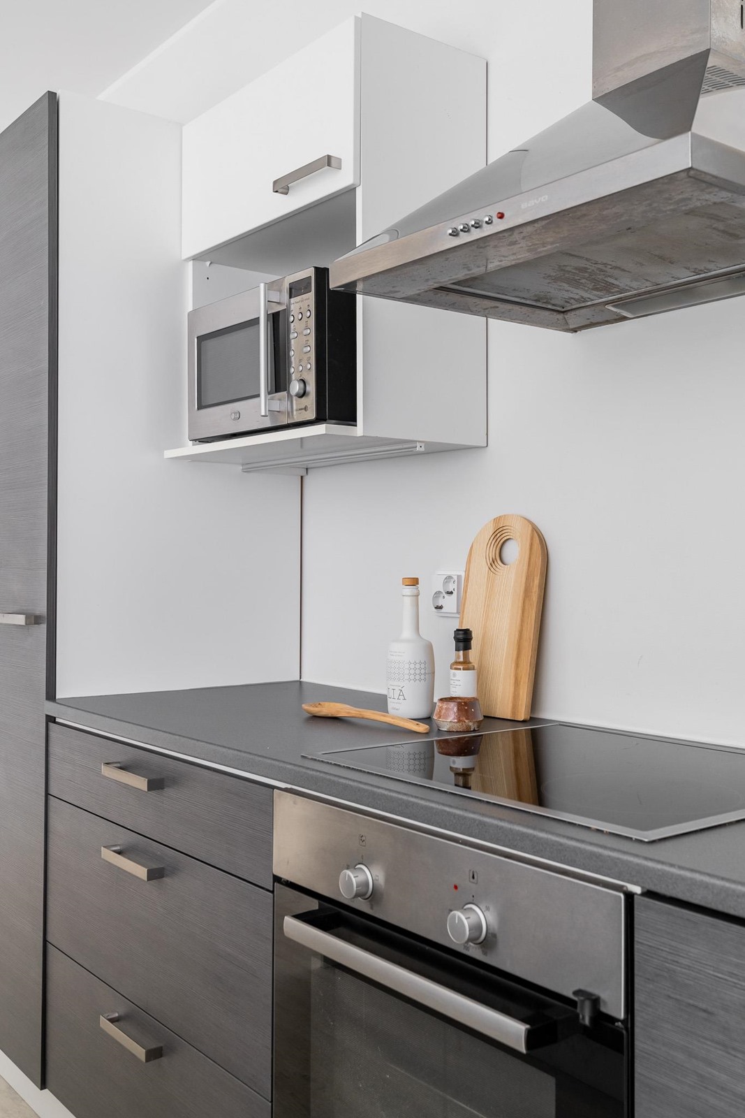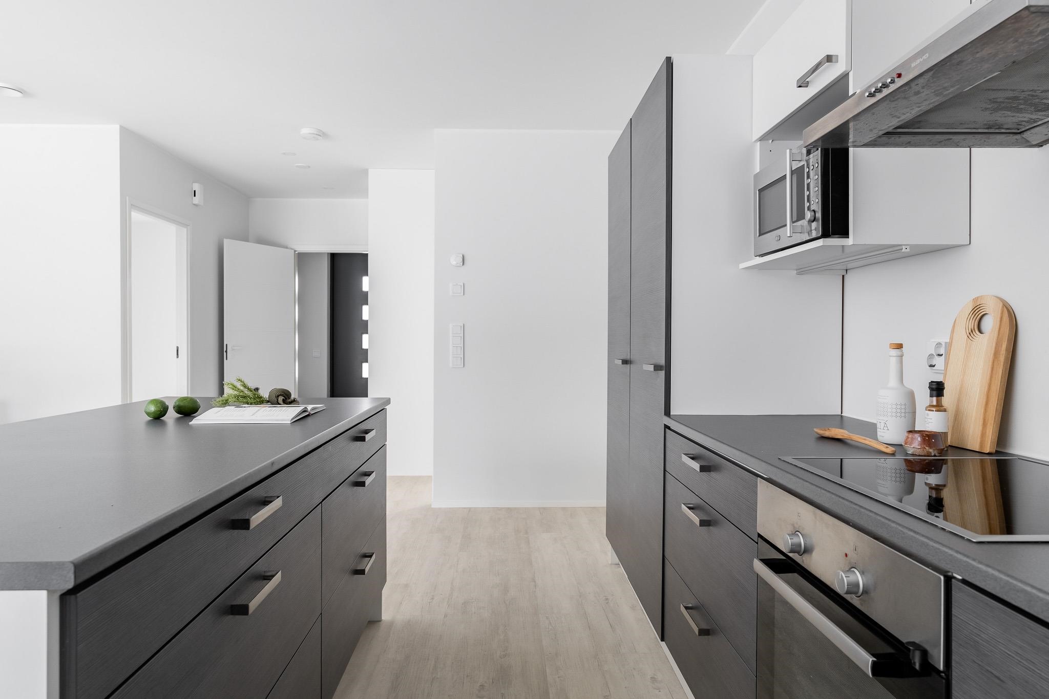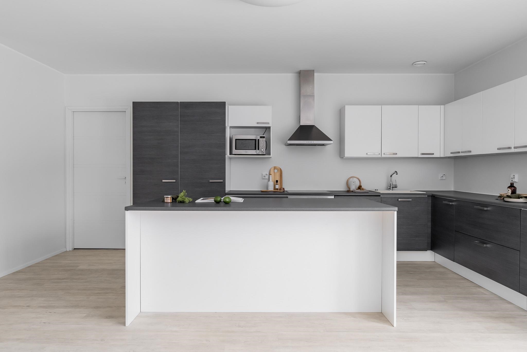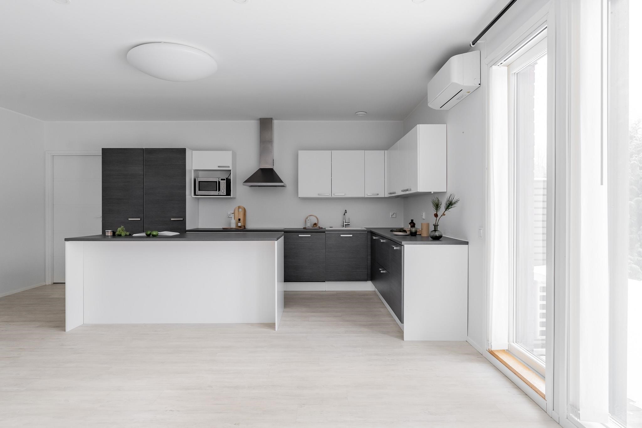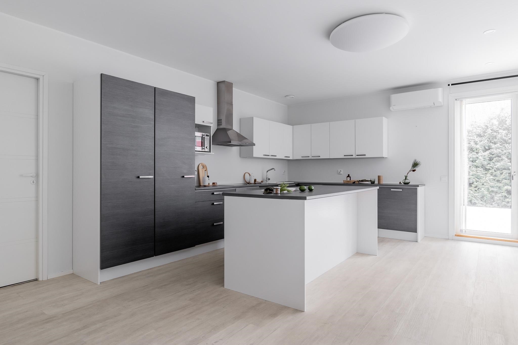 - Asunnon keittiössä on jääkaappi, pakastekaappi, erillisuuni, liesitaso (keraaminen), liesituuletin, astianpesukone, kaapistot ja irrallinen saareke.