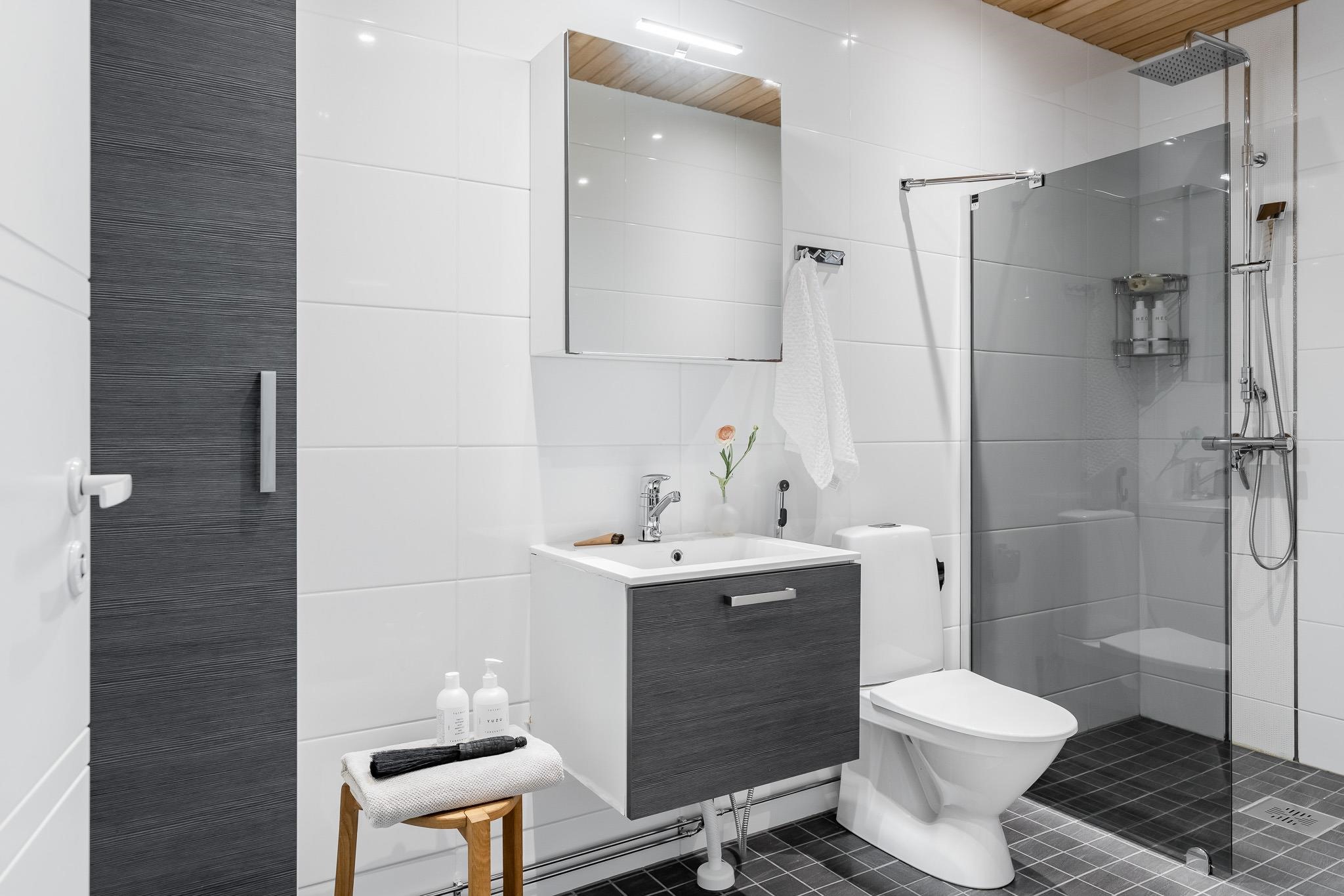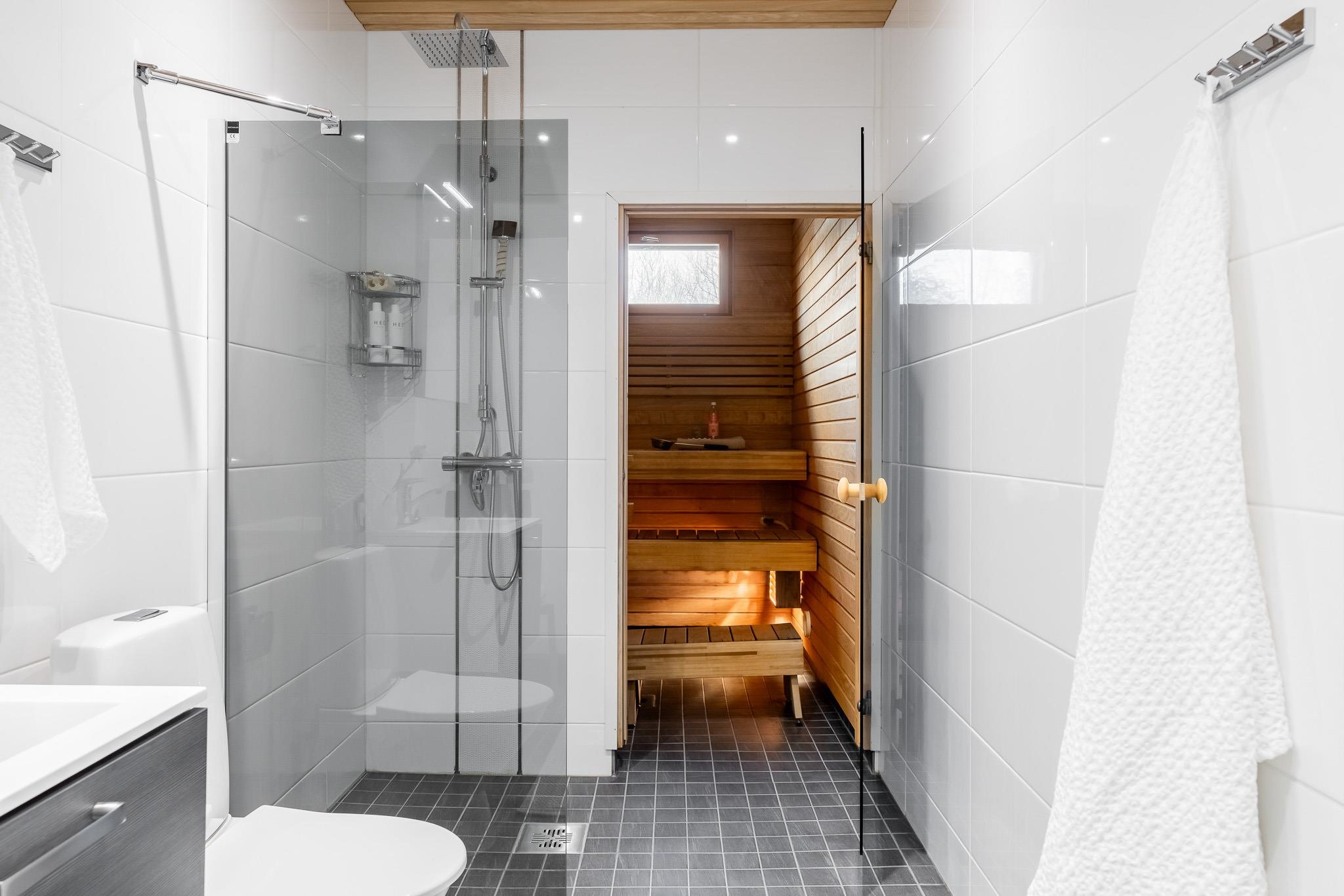 - Kylpyhuoneessa on suihku, suihkuseinä, wc-istuin, käsienpesuallas, allaskaappi, peilikaappi ja erillinen kaappi. Kylpyhuoneesta on käynti asunnon saunaan, jossa on sähkökiuas. Kylpyhuoneessa on lattialämmitys.