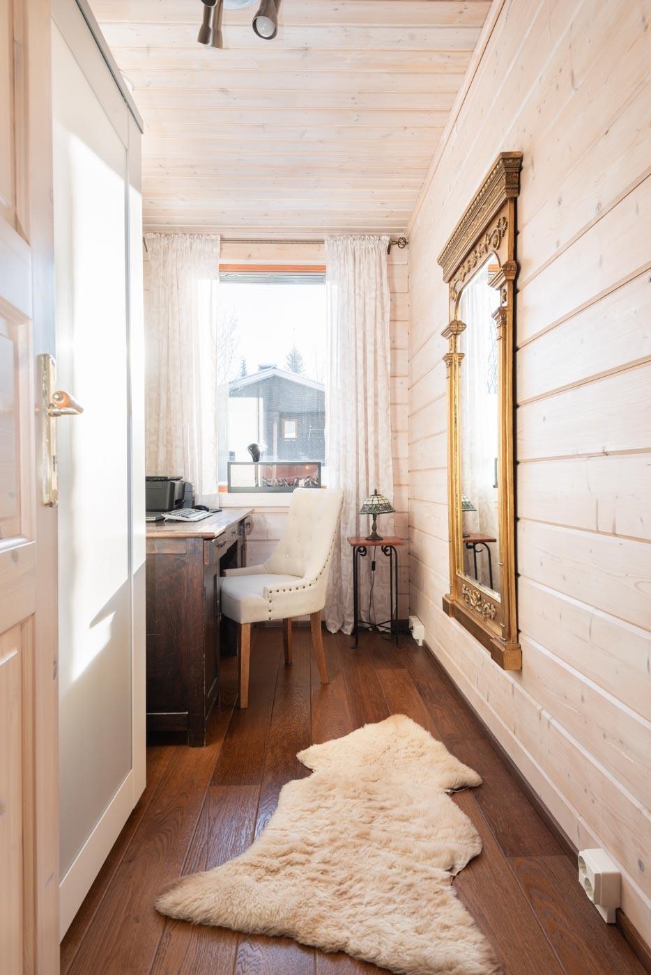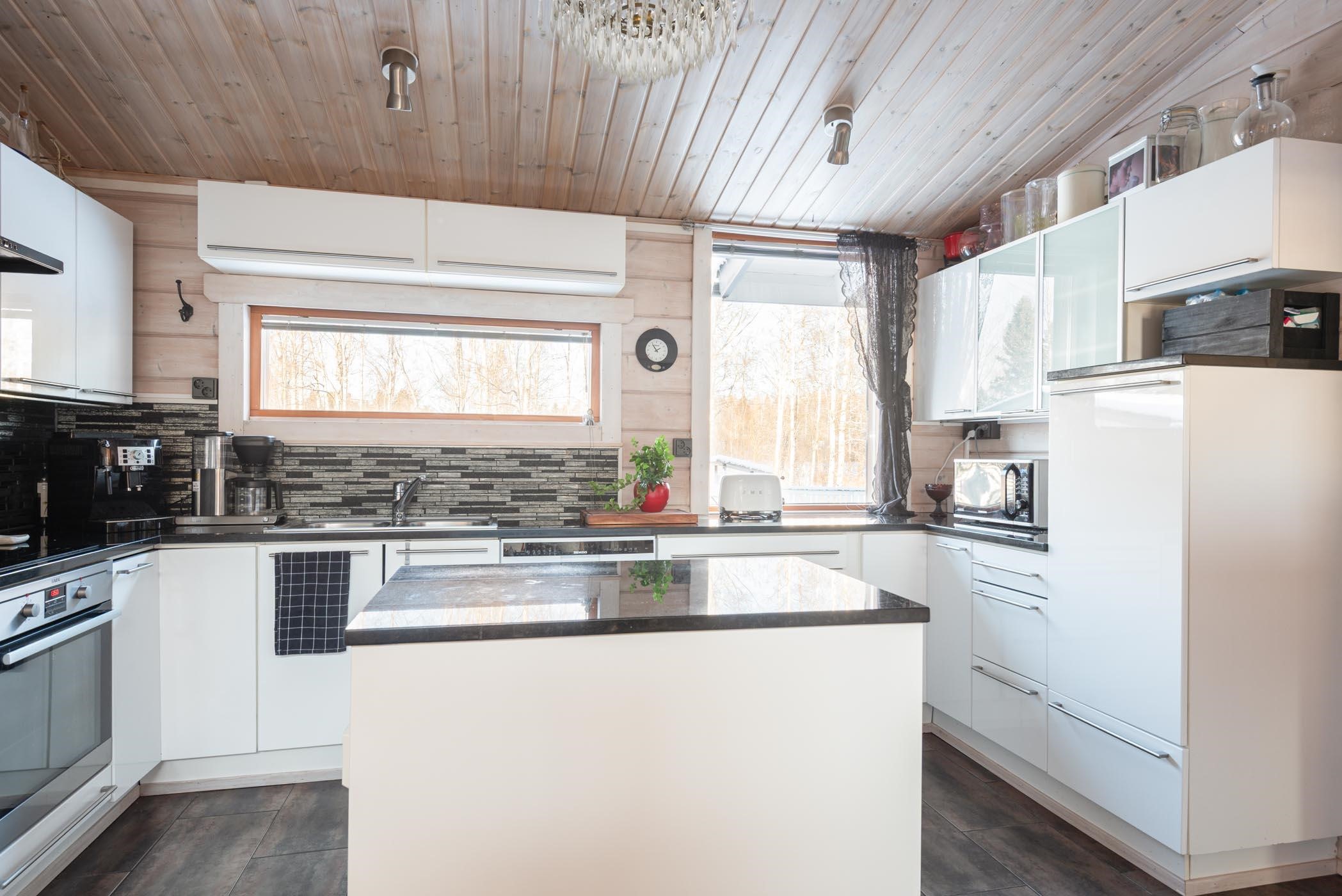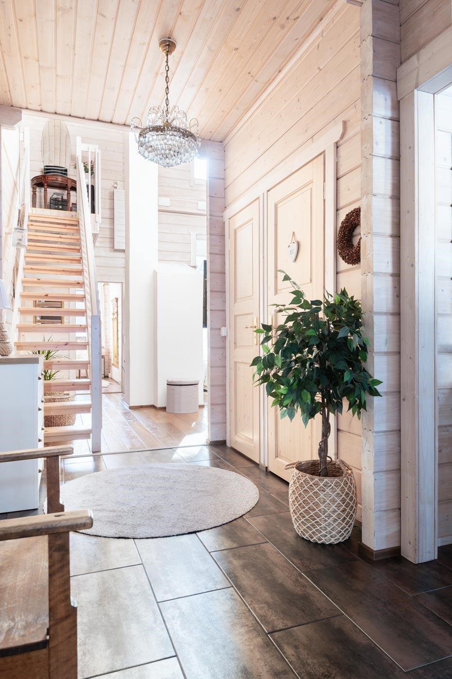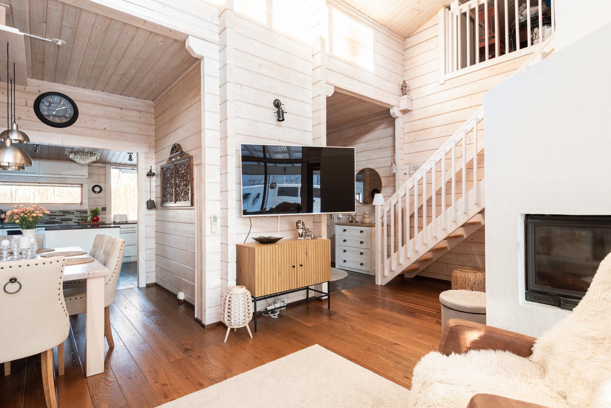 Asunnon pohjaratkaisu on suunniteltu arjen sujuvuutta silmällä pitäen. Neljä makuuhuonetta ja parvi, iso keittiö ja ruokailutila, kaksi wc:tä, vaatehuone, kodinhoitohuone ja sauna tarjoavat monipuoliset tilat niin perheen yhteisiin hetkiin kuin omaan rauhaan. Materiaalivalinnat ovat laadukkaat : keittiössä kivitasot, parketti ja laattalattiaa, hirsiseinät sekä makuuhuoneissa seinien osalta tyylikkäät yhdistelmät kiveä ja hirttä. Säilytystilaa löytyy runsaasti kaappitilojen, vaatehuoneen ja varastojen myötä. Talo lämpiää sähkötoimisella lattialämmityksellä, ilmalämpöpumpulla ja olohuoneessa sijaitsevalla takalla.