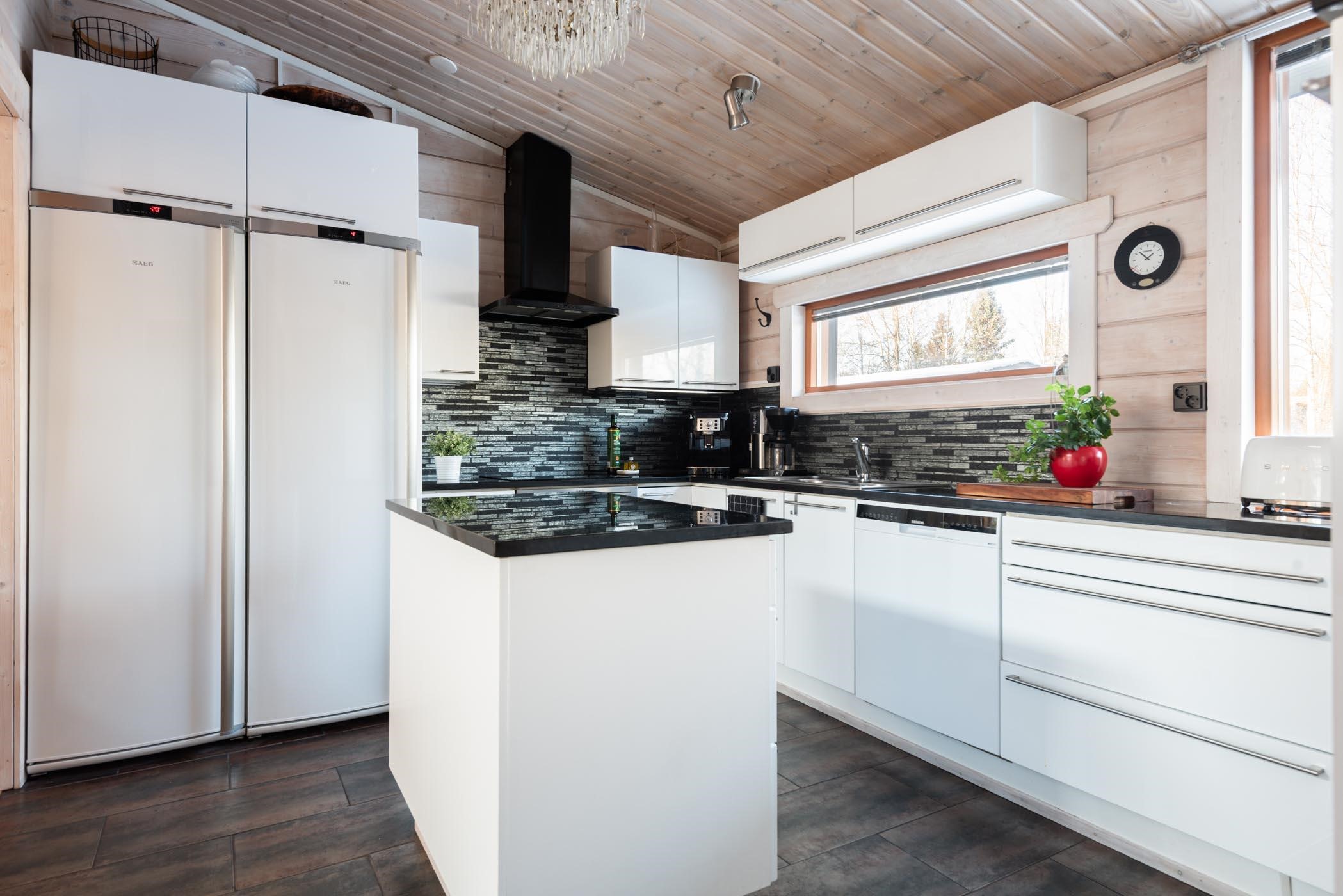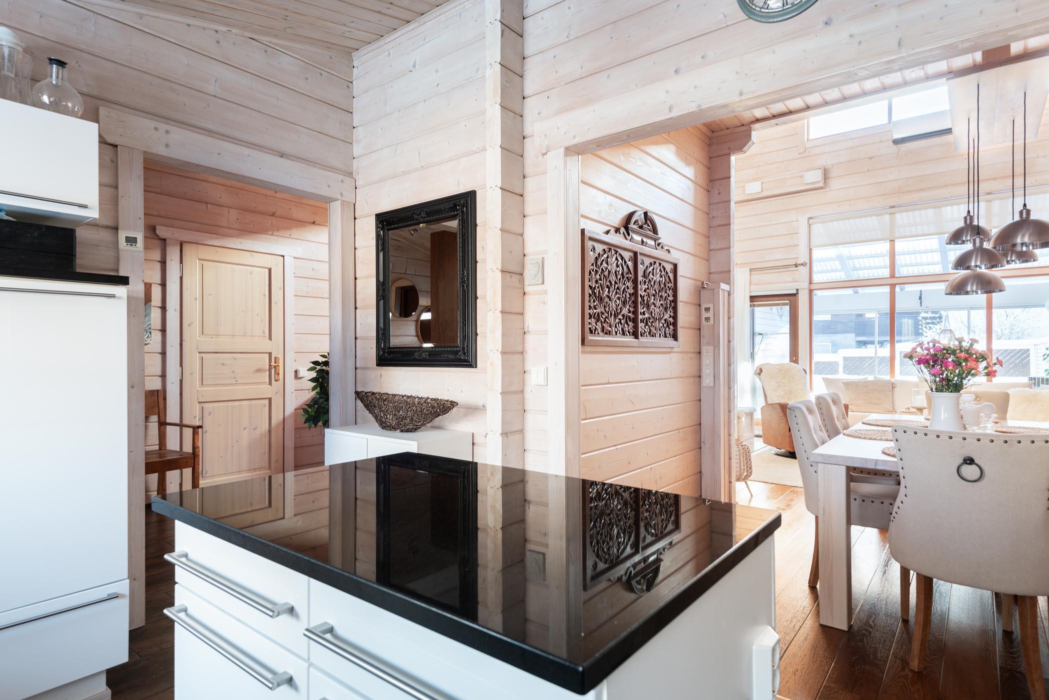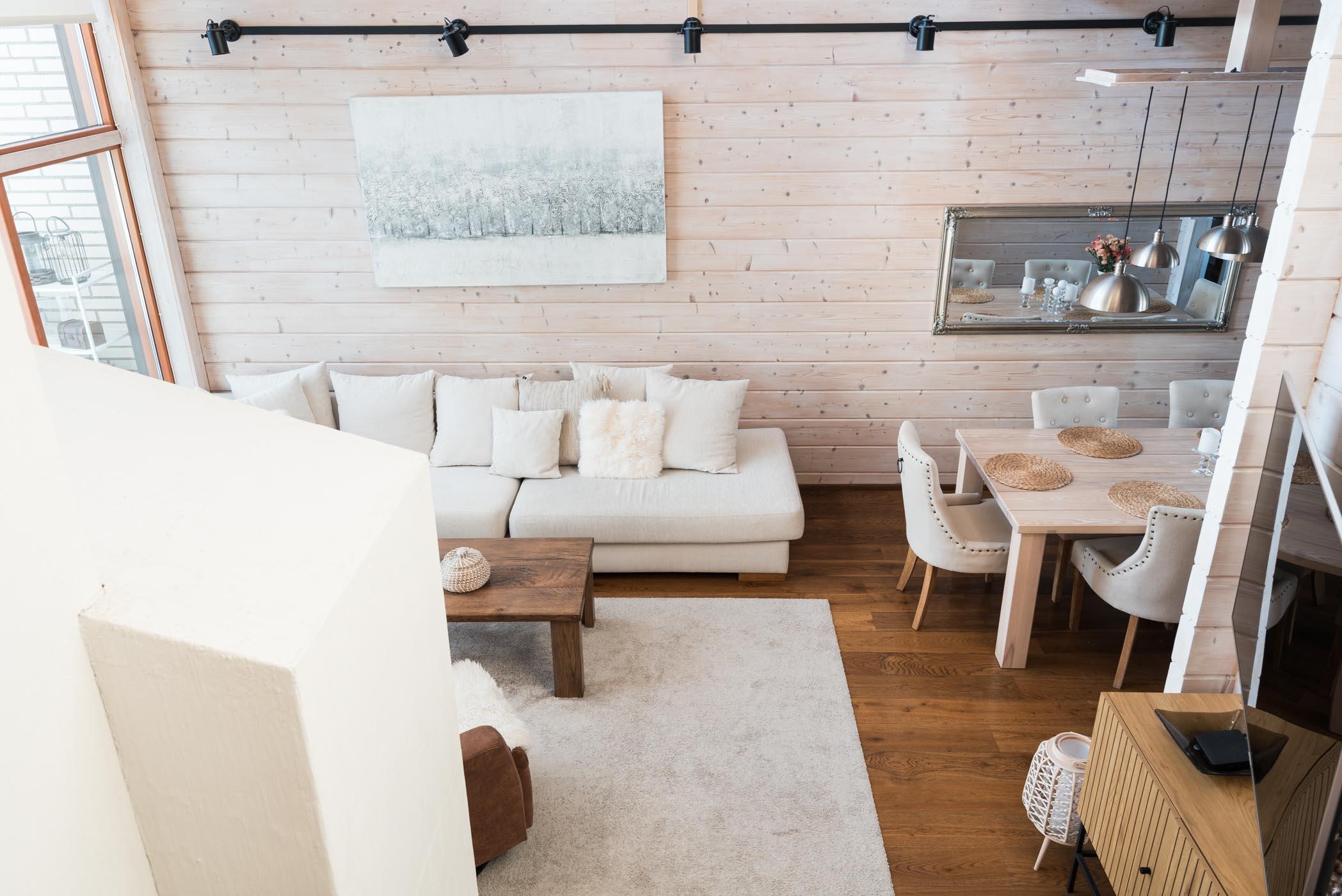Asunnon pohjaratkaisu on suunniteltu arjen sujuvuutta silmällä pitäen. Neljä makuuhuonetta ja parvi, iso keittiö ja ruokailutila, kaksi wc:tä, vaatehuone, kodinhoitohuone ja sauna tarjoavat monipuoliset tilat niin perheen yhteisiin hetkiin kuin omaan rauhaan. Materiaalivalinnat ovat laadukkaat : keittiössä kivitasot, parketti ja laattalattiaa, hirsiseinät sekä makuuhuoneissa seinien osalta tyylikkäät yhdistelmät kiveä ja hirttä. Säilytystilaa löytyy runsaasti kaappitilojen, vaatehuoneen ja varastojen myötä. Talo lämpiää sähkötoimisella lattialämmityksellä, ilmalämpöpumpulla ja olohuoneessa sijaitsevalla takalla.