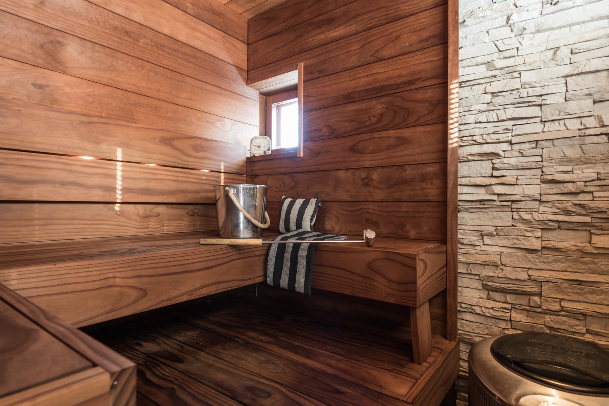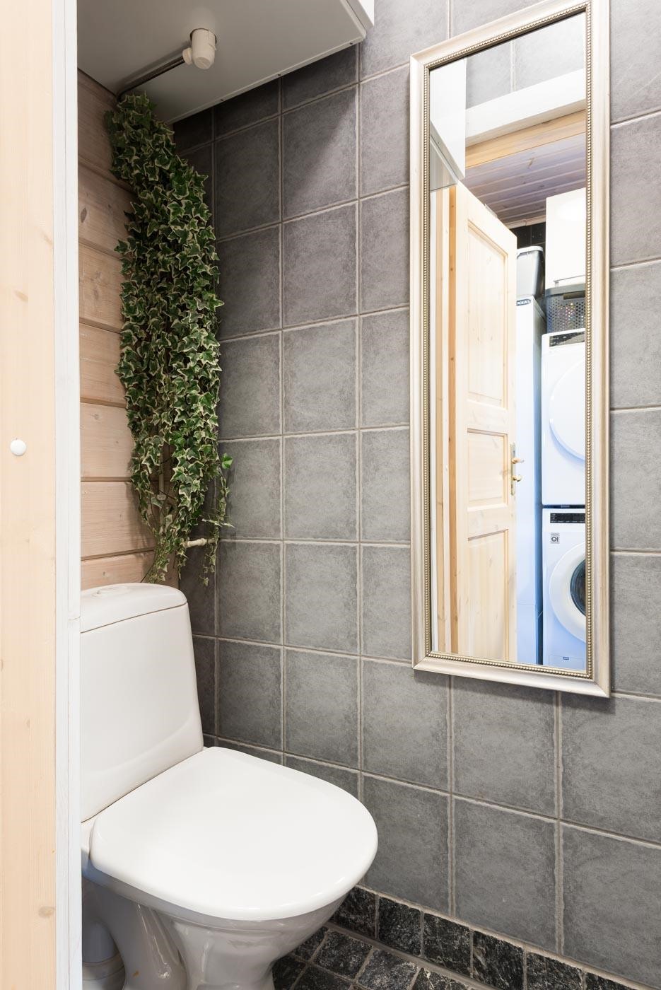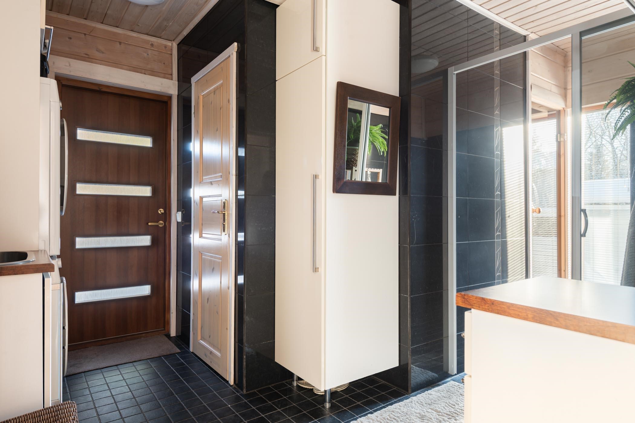 - Kylpyhuoneessa : Suihkut ja suihkuseinä, Sauna ja heti valmis kiuas, WC, pesukoneliitäntä, kodinhoitotilaa ja vesipiste, kaapistot, kiinteät valaisimet ja lattialämmitys. Kylpyhuoneen kautta käynti myös terassille. Erillinen WC : WC, valopeili, allashyllyköt.