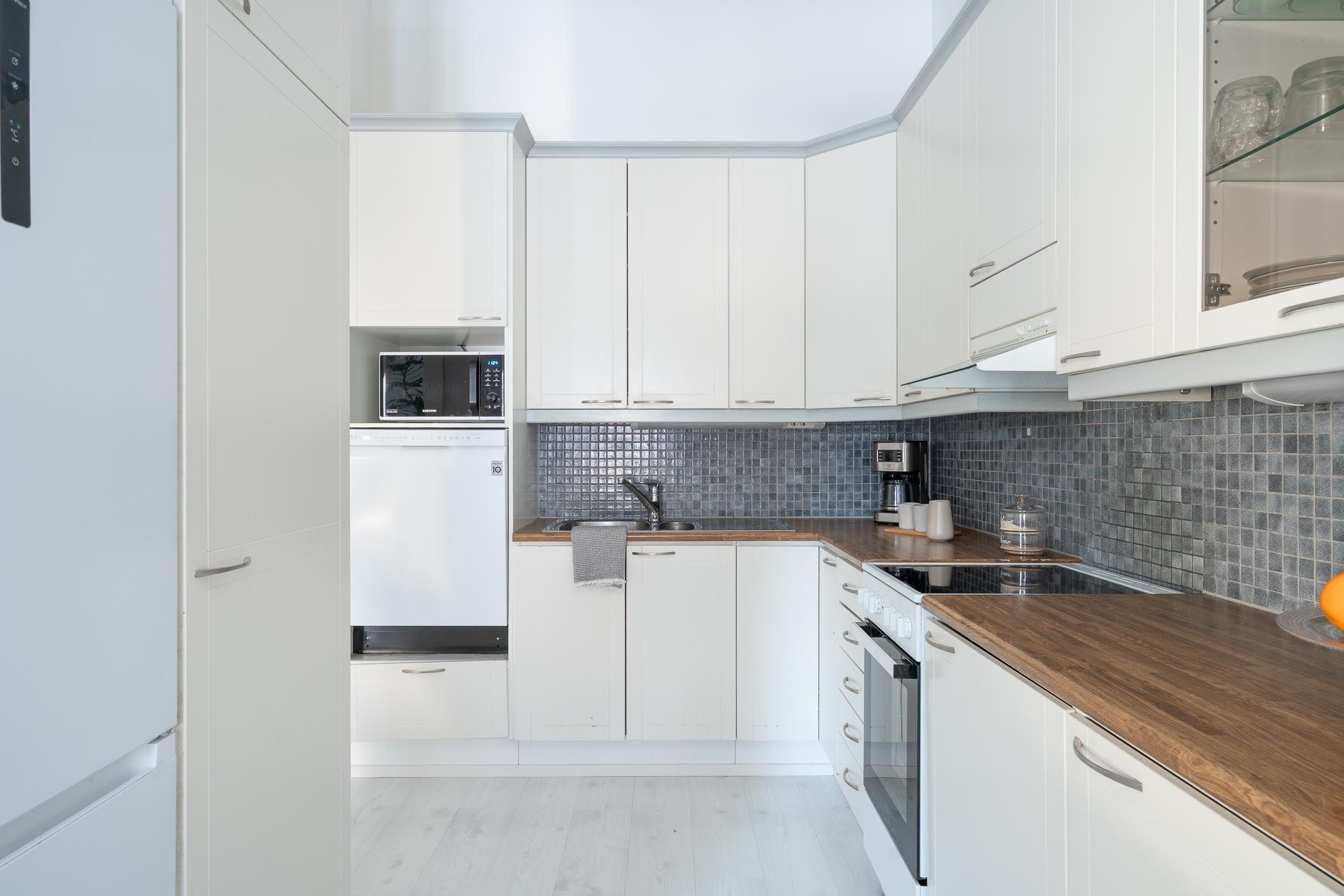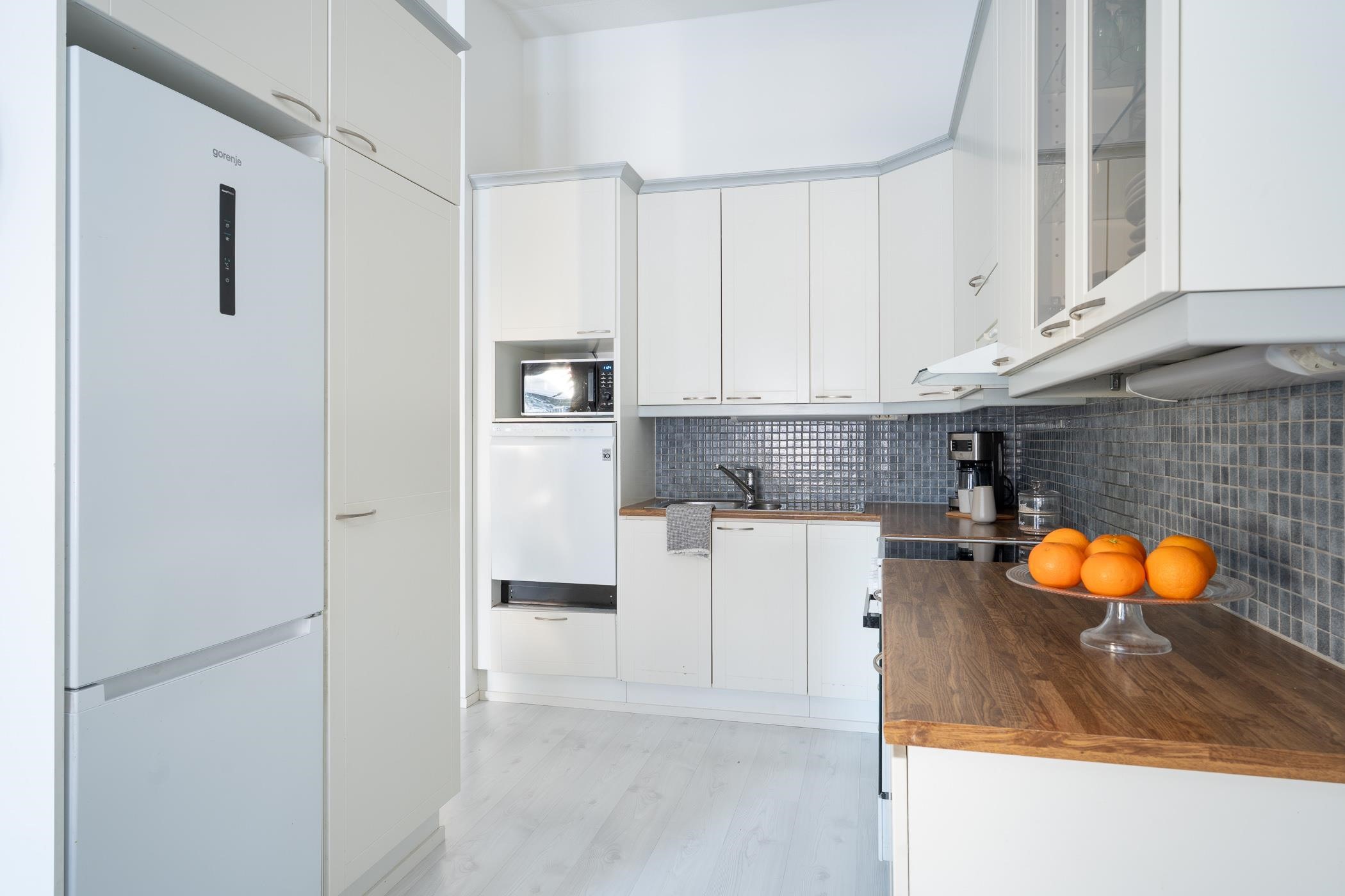 - Keittiössä : Jääkaappipakastin, lattialiesi, liesituuletin, astianpesukone, kaapistot ja kiinteät valaisimet.