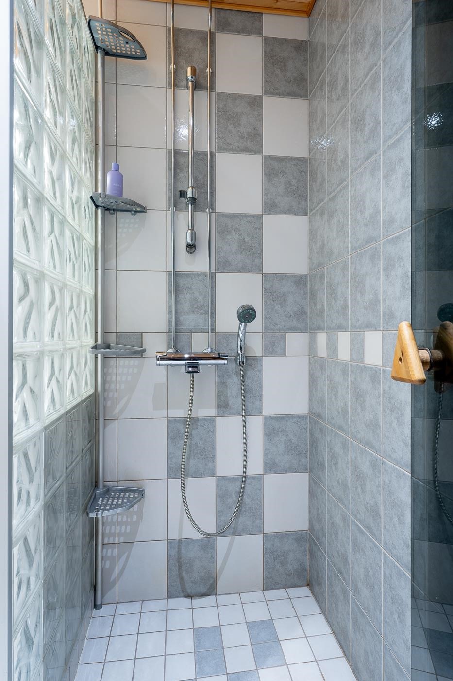 - Kylpyhuoneessa : Suihku, sauna sähkökiukaalla, suihkuseinä, peili, allaskaappi, pesukoneliitäntä, kaapisto, lattialämmitys ja kiinteät valaisimet. Erillinen WC : WC, Peilikaappi, allaskaappi, lattialämmitys ja kiinteät valaisimet.