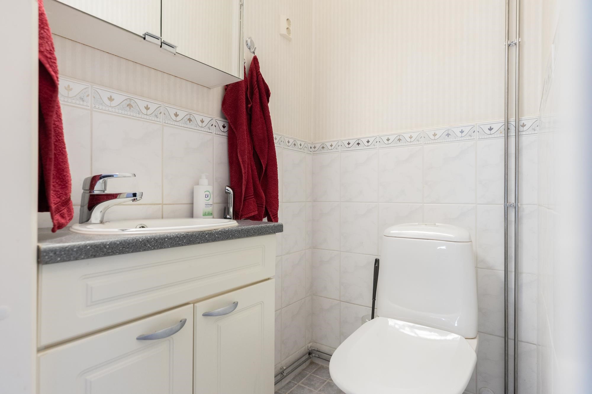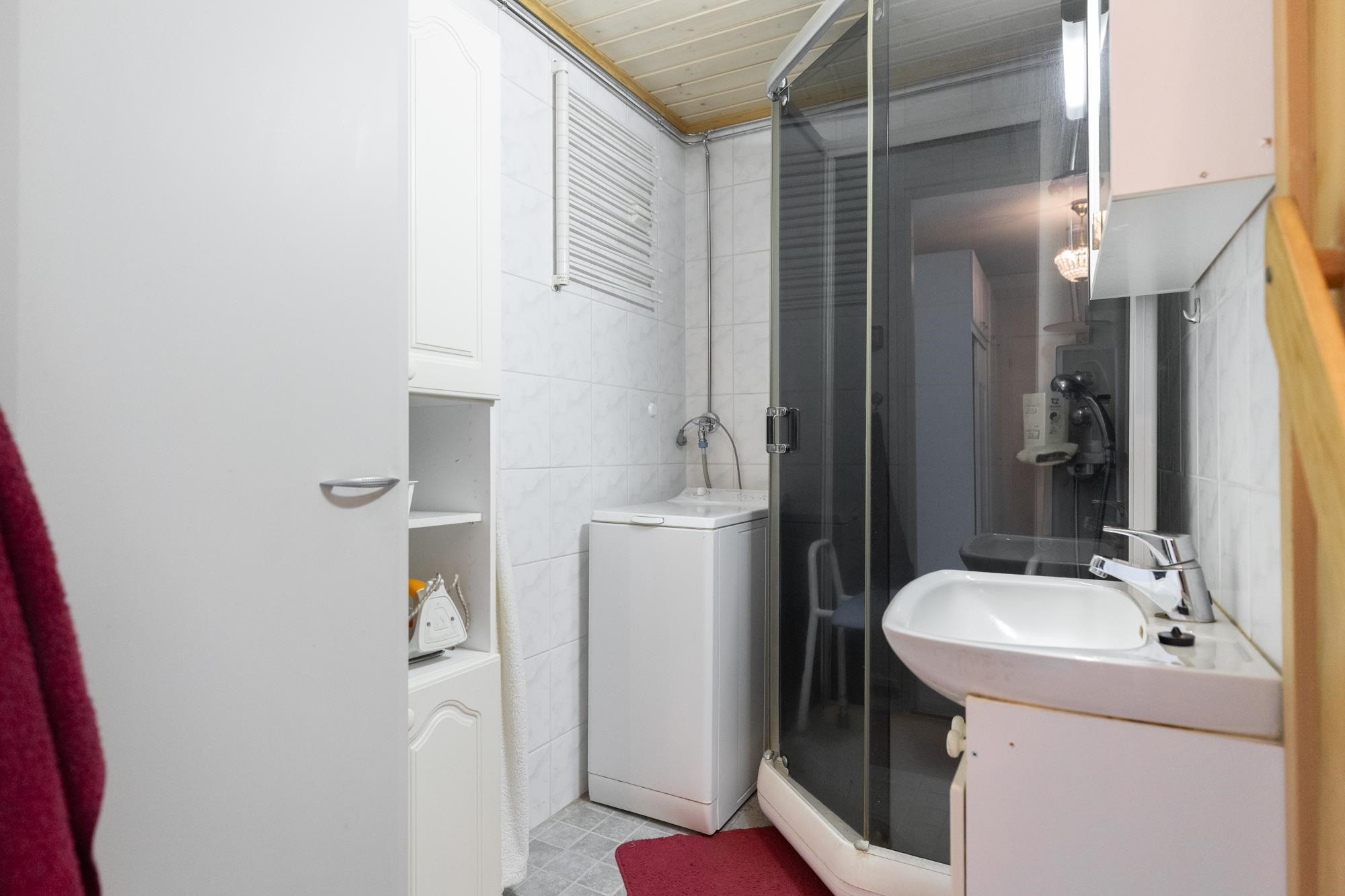 - Sauna, sähkökiuas, kylpyhuone, suihku, suihkukaappi, peilit, peilikaappi, kaapit, allaskaappi, pesukoneliitäntä, lattialämmitys, kiinteät valaisimet.