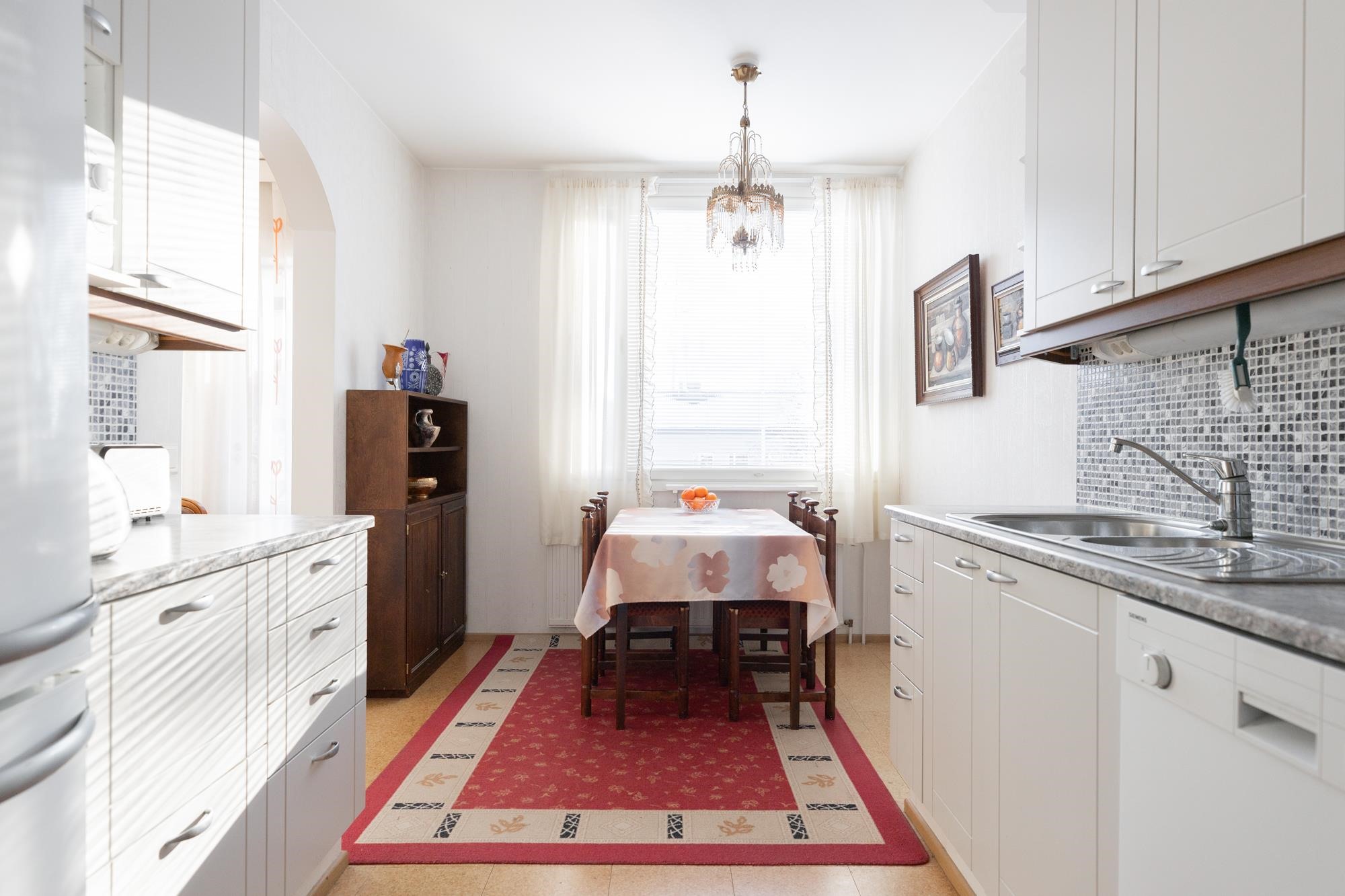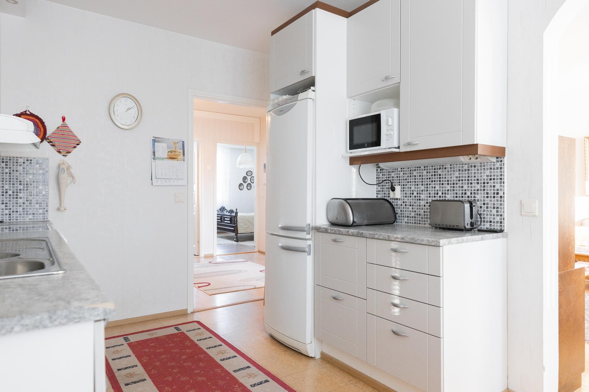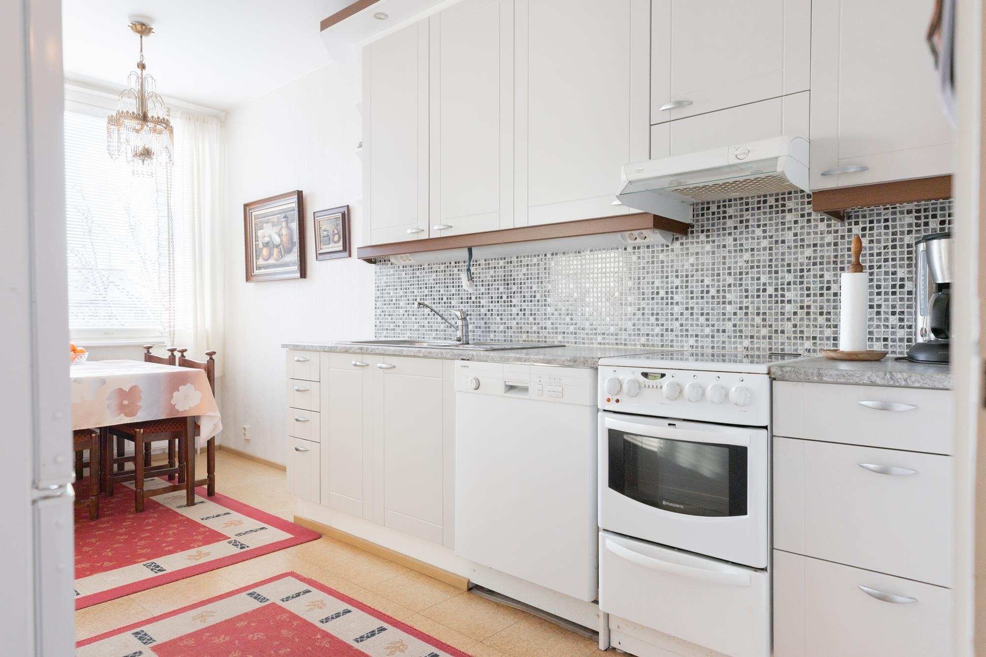 - Jääkaappipakastin, keraaminen liesi, liesituuletin, astianpesukone, kaapistot, kiinteät valaisimet.