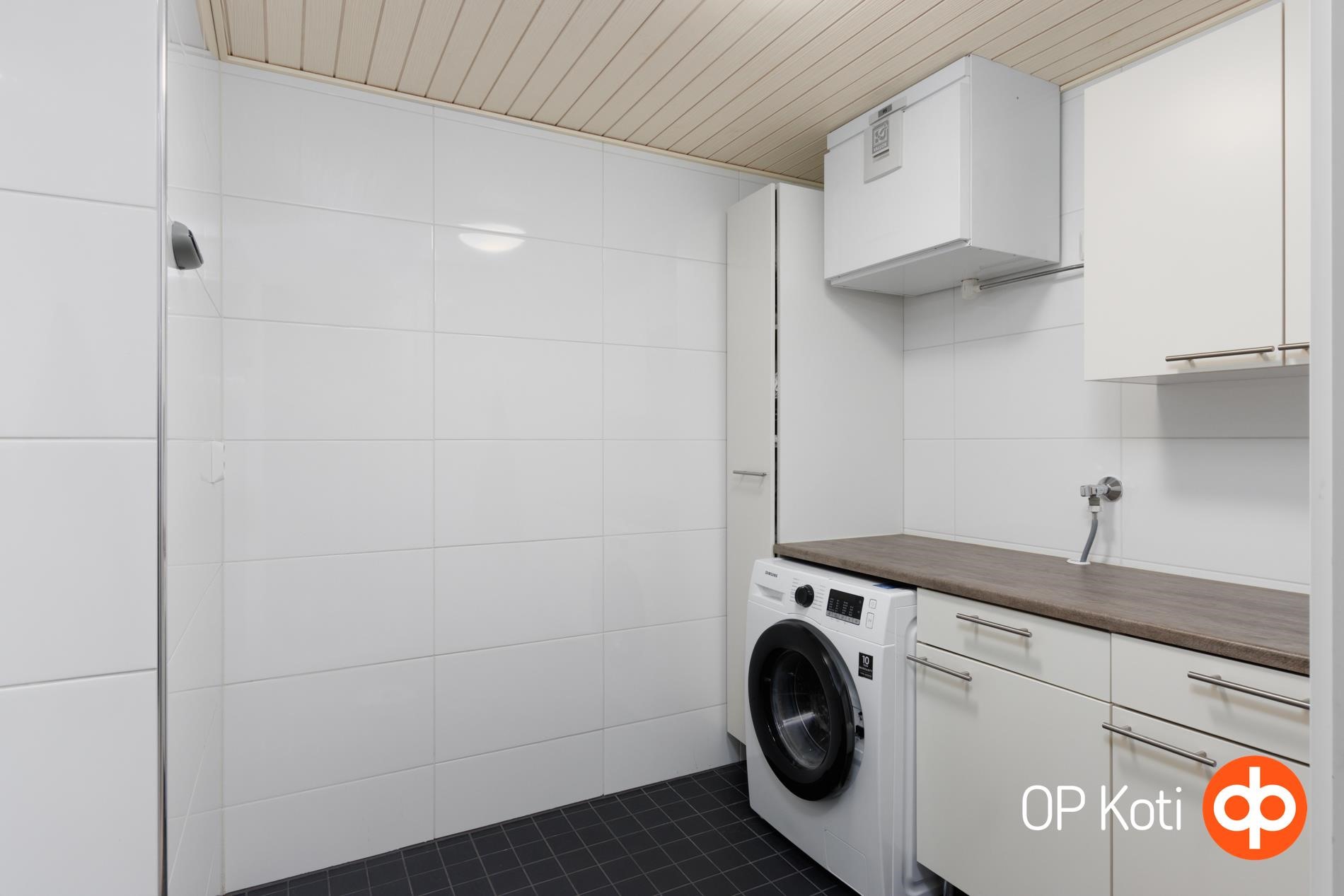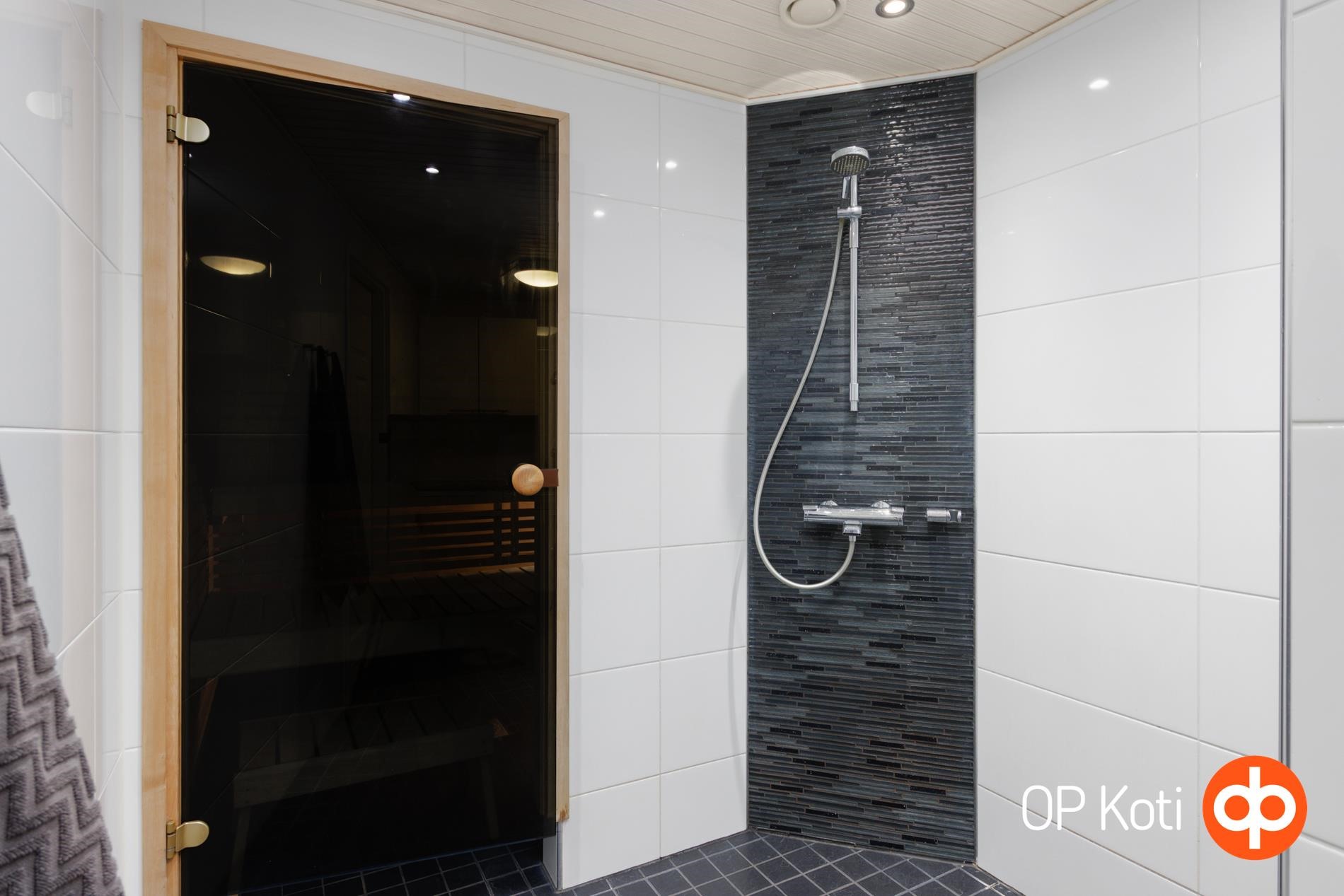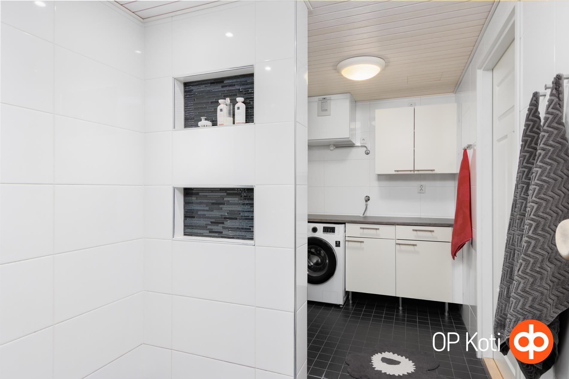 - Sauna, sähkökiuas, kylpyhuone, erillinen wc, suihku, peilit, kaapit, allaskaappi, pesukoneliitäntä kodinhoitohuoneessa, lattialämmitys, kiinteät valaisimet.