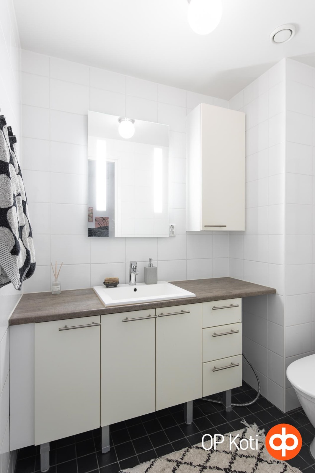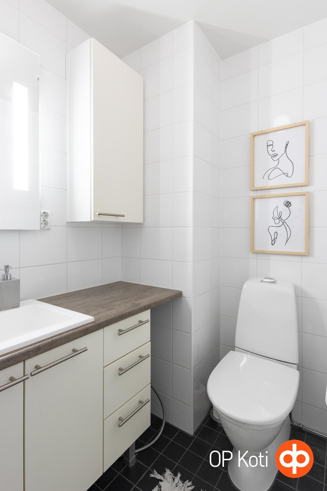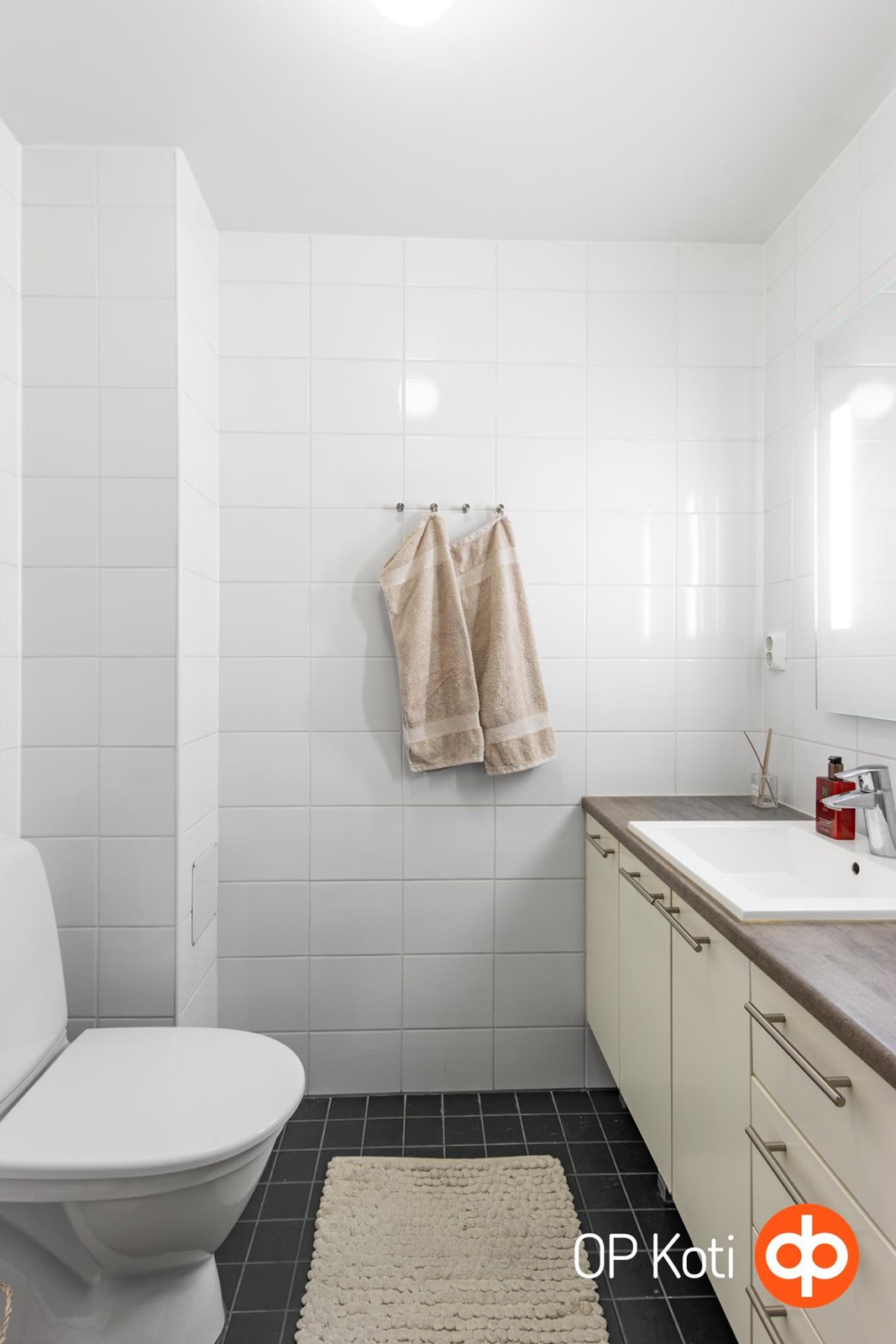 - Sauna, sähkökiuas, kylpyhuone, erillinen wc, suihku, peilit, kaapit, allaskaappi, pesukoneliitäntä kodinhoitohuoneessa, lattialämmitys, kiinteät valaisimet.