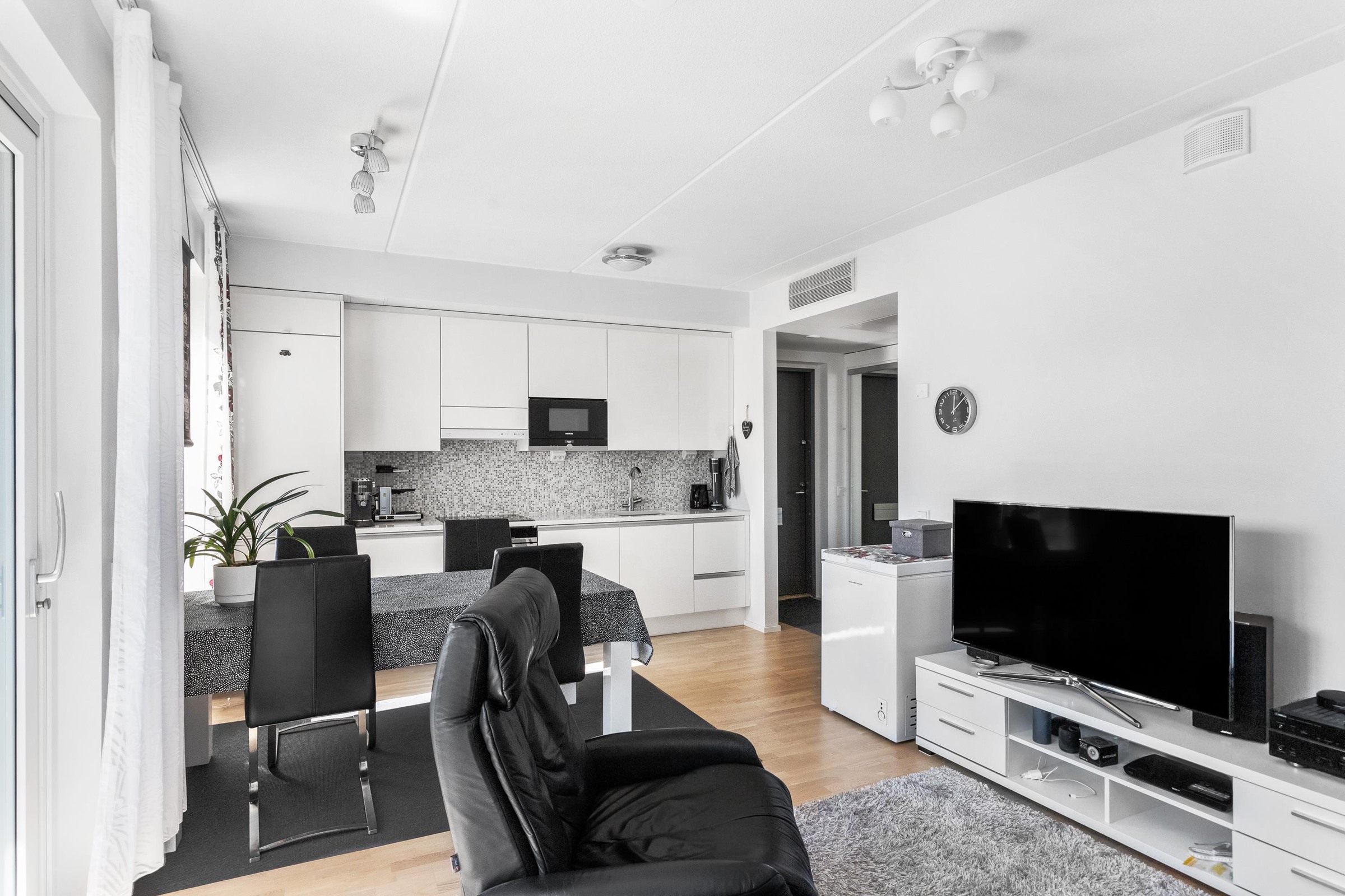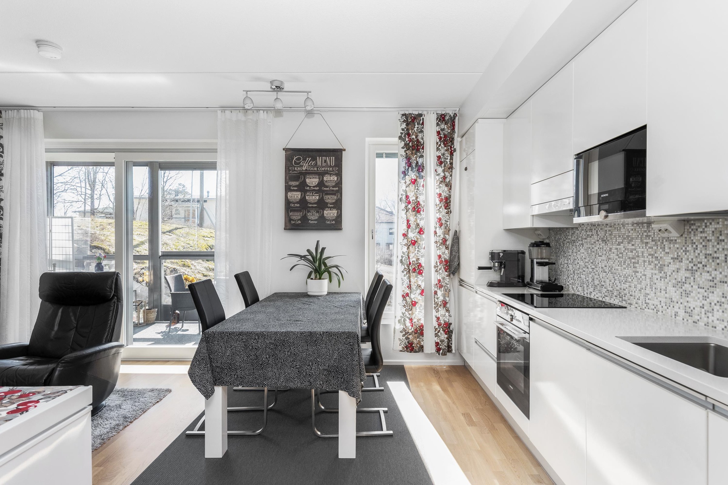 - Jääkaappipakastin Siemens integroitu kalustepeitteinen, erillisuuni Siemens teräs, liesitaso Siemens induktio fasettireunainen, liesituuletin Siemens, mikroaaltouuni Siemens upotettu, astianpesukone Siemens integroitu kalustepeitteinen. Keittiön seinäkaapistot: Kiiltävä valkoinen laakaovi vetimetön. Keittiön pöytäkaapistot: Kiiltävä valkoinen laakaovi alumiinikouru- vetimillä. Keittiön tasot: Kvartsikivi- taso (Natural White). Kaapistojen välitila: Välitilan laatoitus on mosaiikkilaatta (Welnesse Pool), led-valaistus. Keittiön hana: Hansgohe design- hana Talis S2 Keittiön allas: Yksialtainen ruostumaton terasallas Blanco Aldano 500U.