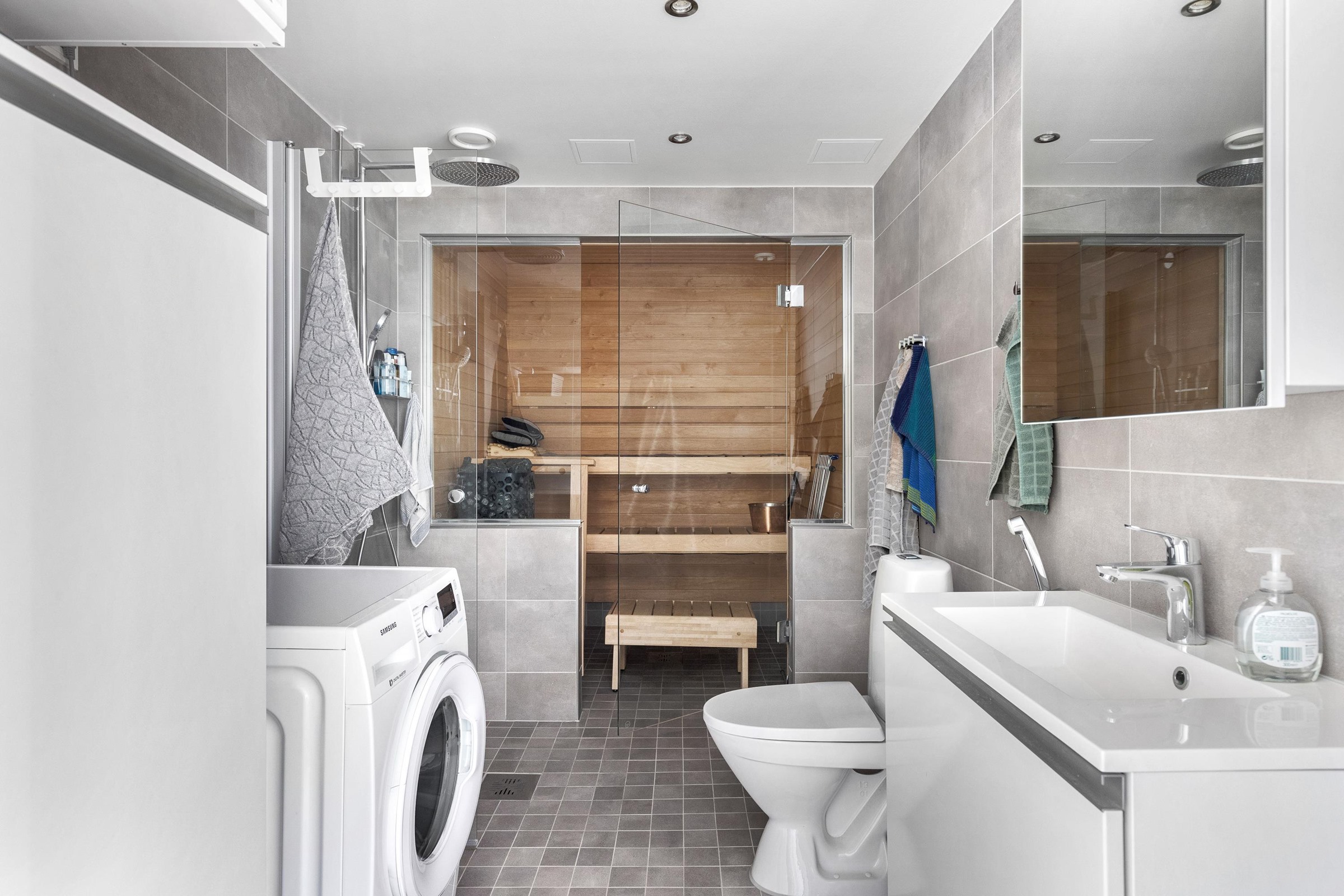 - Sauna: Helo- kiuas Himalaya musta, midi- ohjauskeskuksella, kuituvalot erillisen suunitelman mukaan. Kylpyhuone: Tasoallas, alalaatikosto, peilikaappi, allaskaappi, allashana Hansgrohe Focus 100 bide- suihkulla, pesukoneliitäntä, lattialämmitys, pyyhekoukustot, wc istuin IDO kovalla Soff Close kannella. Suihku: Hansgrohe Select 300 yläsuihku, käsisuihku ja sekoittajalla.
