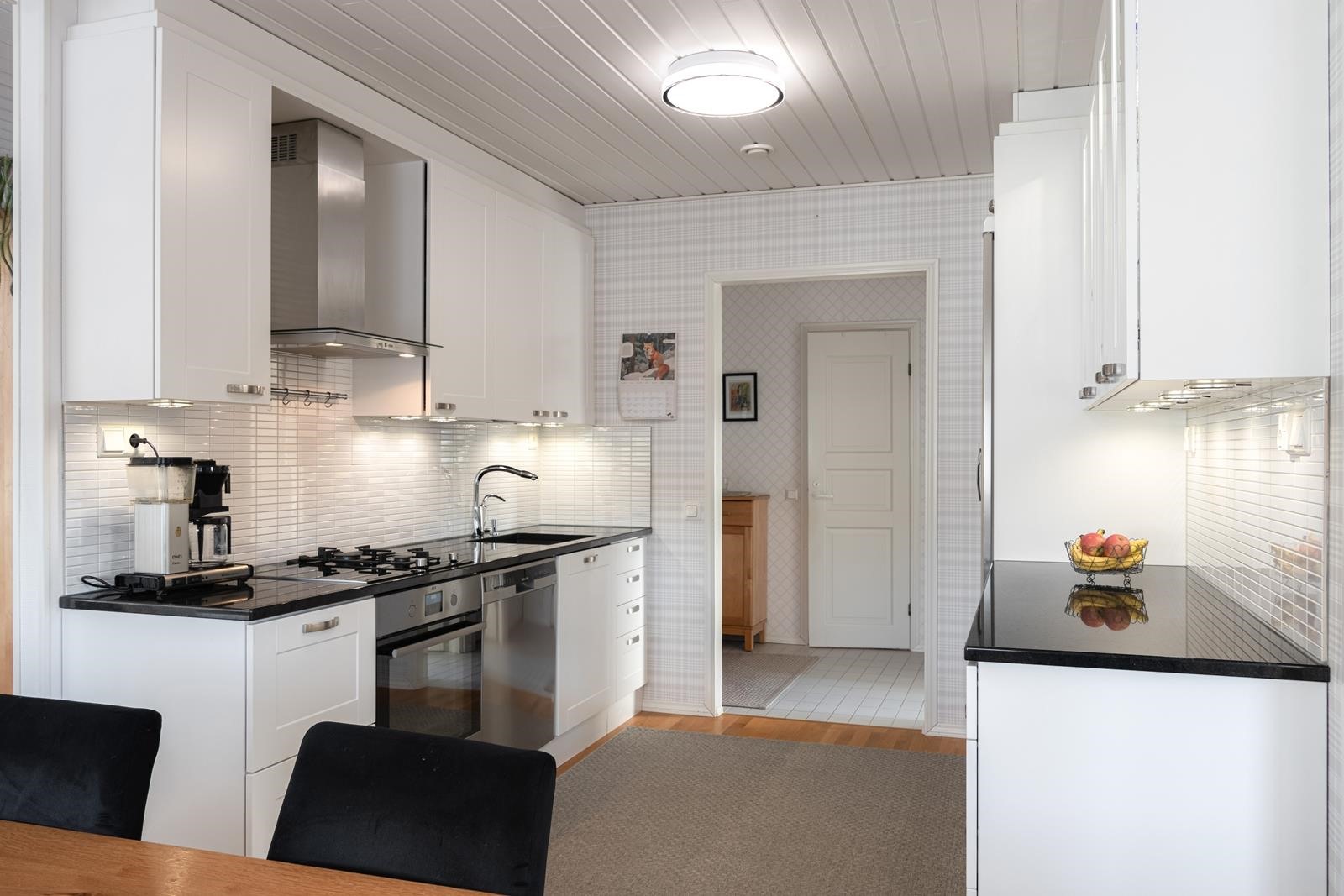 - Jääkaappipakastin, erillisuuni 2023, induktioliesi, kaasuliesi (poistettu käytöstä putket olemassa), astianpesukone 2024, jääkaappi, kaapistot, pöytätasojen materiaali kivitasot; Ylämaan graniitti. Keittiö (A La Carte) uusittu 2012. Komposiitti altaassa halkeama.