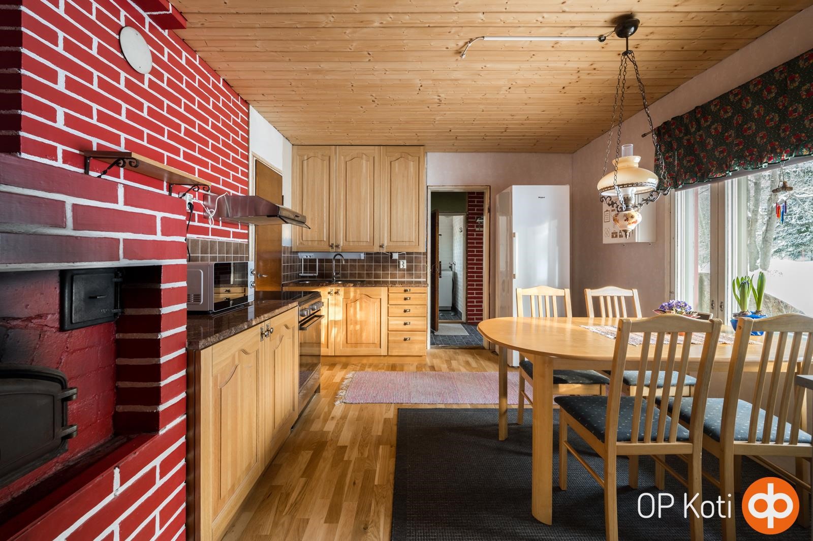 - Jääkaappi, induktioliesi, liesituuletin aktiivihiilisuodatin, leivinuuni nuohoukset tehty kerran vuodessa, kaapistot puusepän tekemät rungot ja täyspuuovet, kiinteät valaisimet, pöytätasojen materiaali Kivitasot.