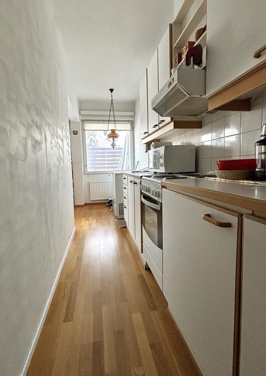 - Keittiössä on pieni jääkaappi ja arkkupakastin, sähköliesi, liesituuletin sekä kaapissa pikkuruinen pyykinpesukone. Keittiön kaapistot on uusittu ehkä 1980-luvulla.