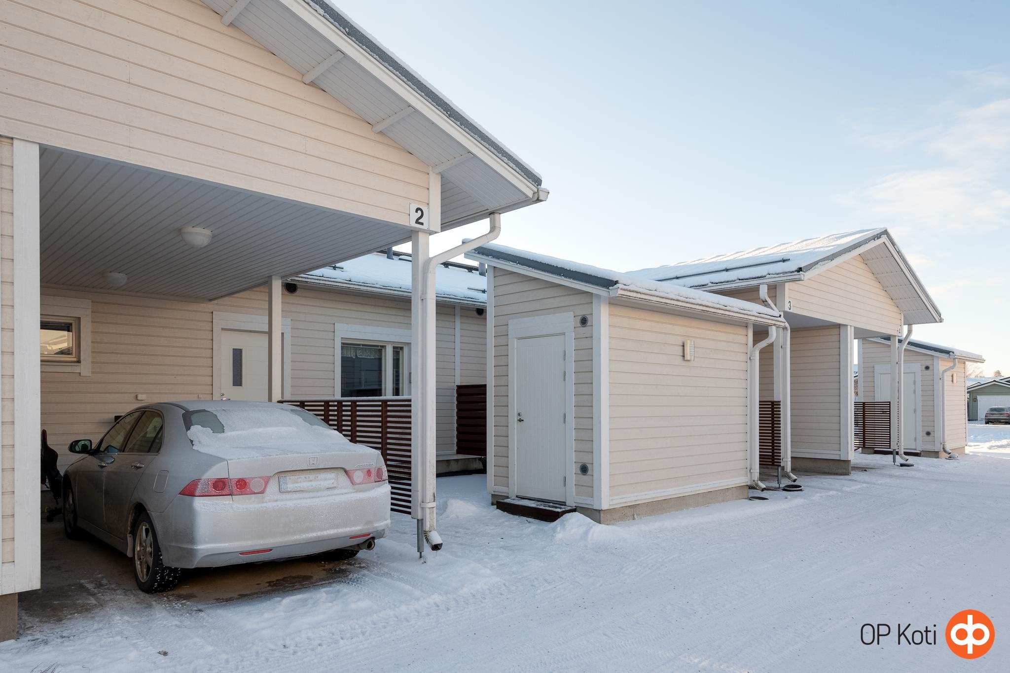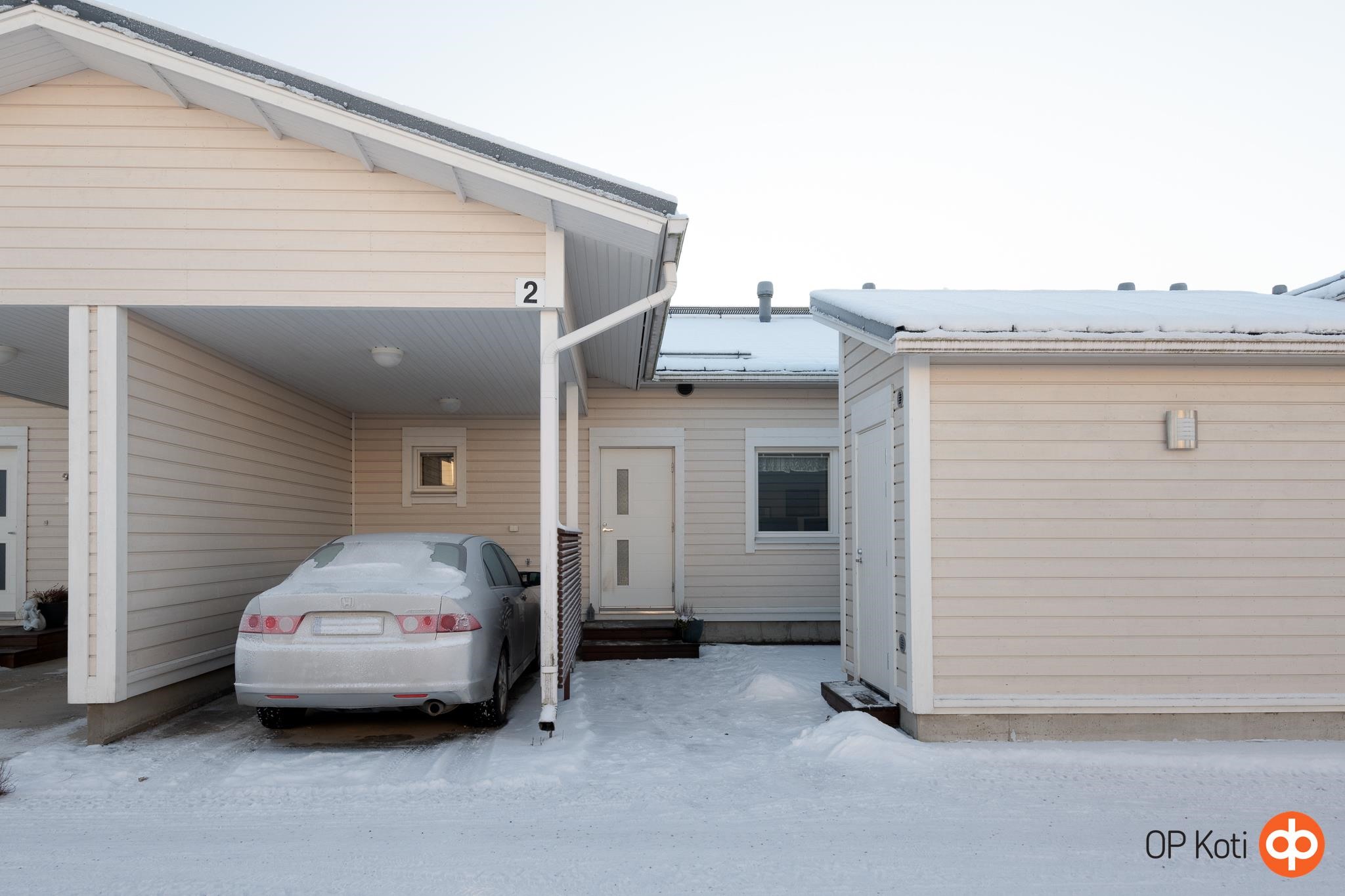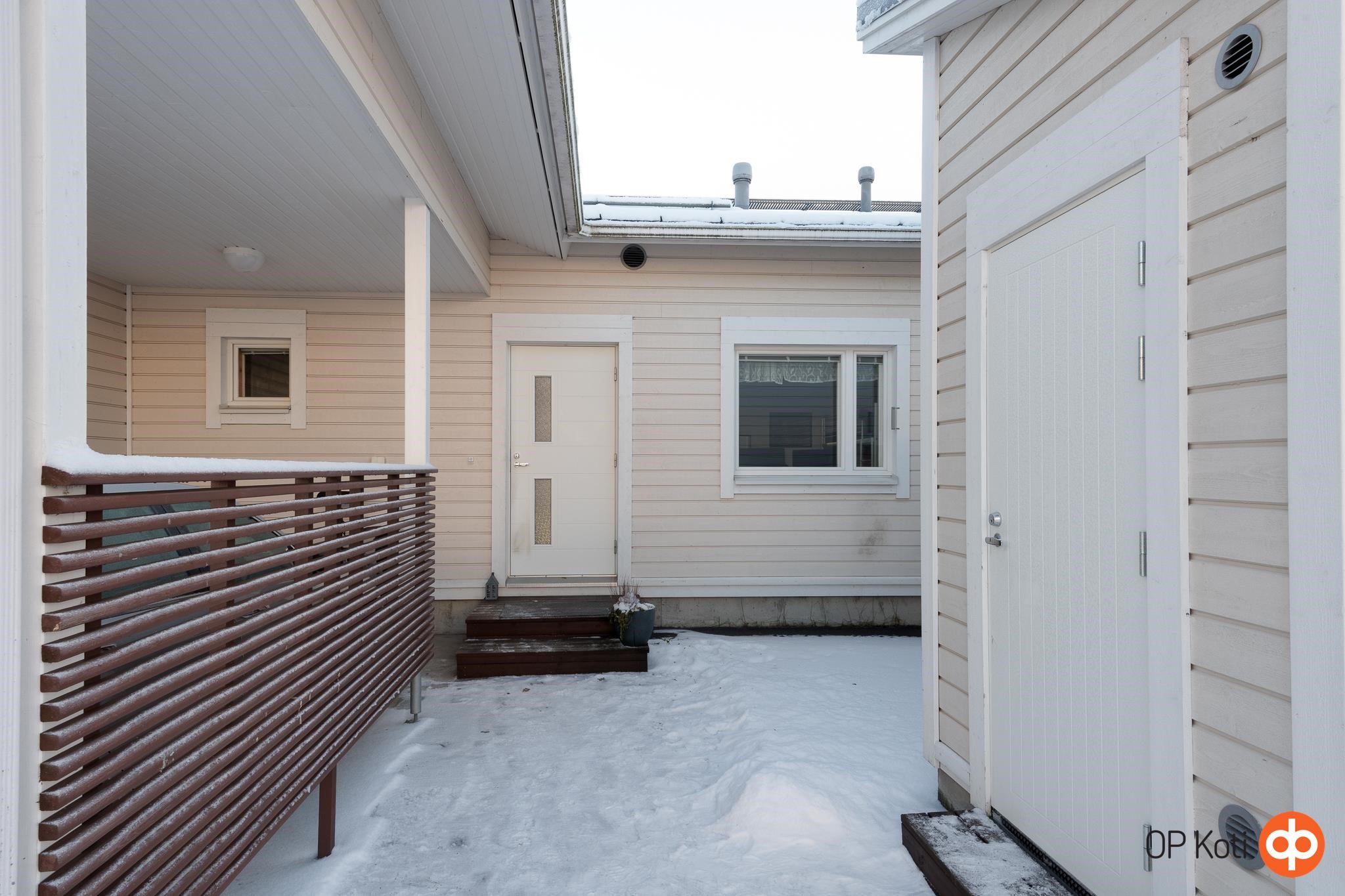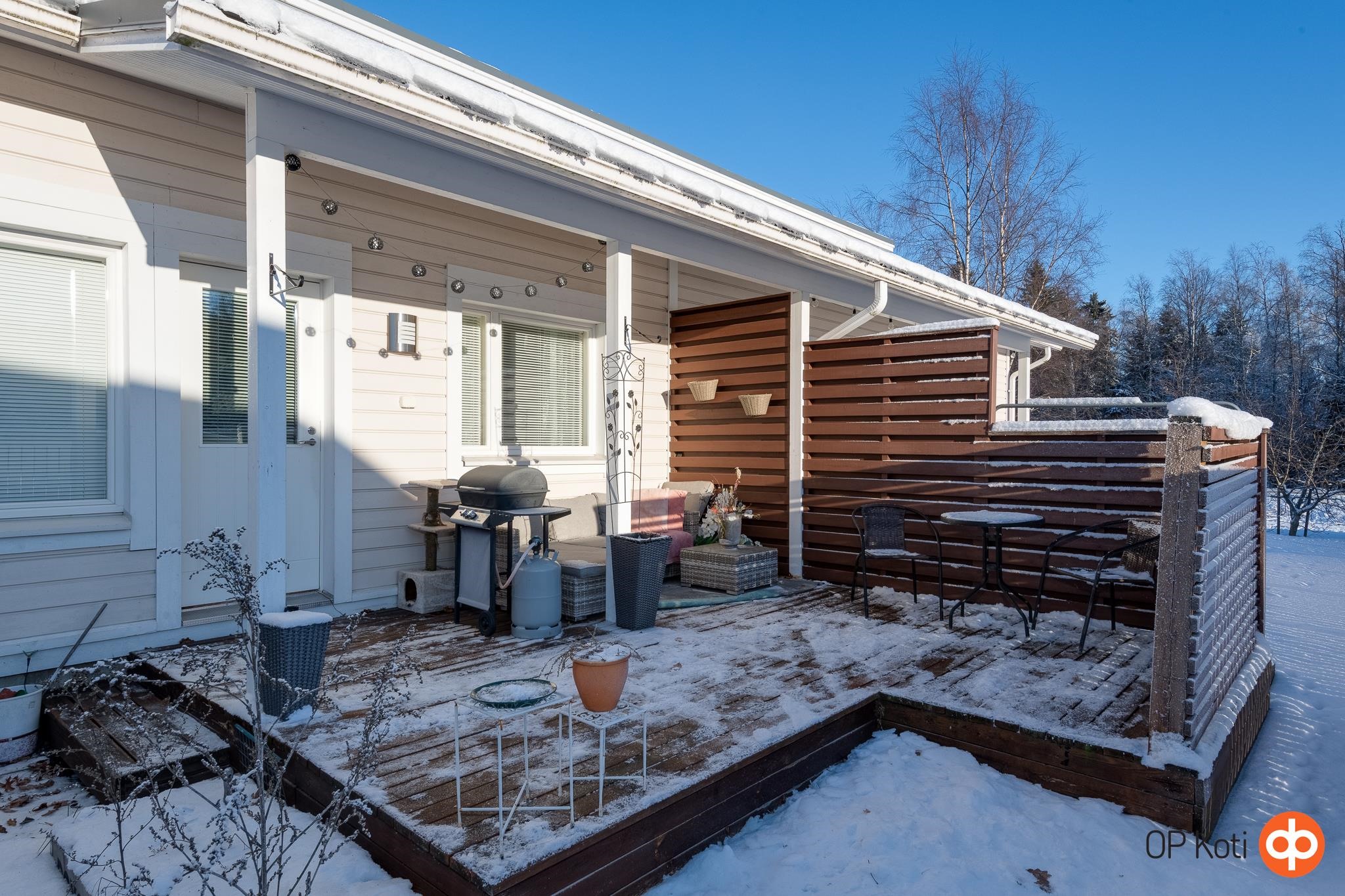 Takapihalla on mukavasti tilaa nauttia omasta pihasta ja istutuksista, ja katettu terassi kutsuu päiväkahville. Asunnolle kuuluu myös hyvän kokoinen ulkovarasto aivan sisäänkäynnin vieressä sekä autokatos.