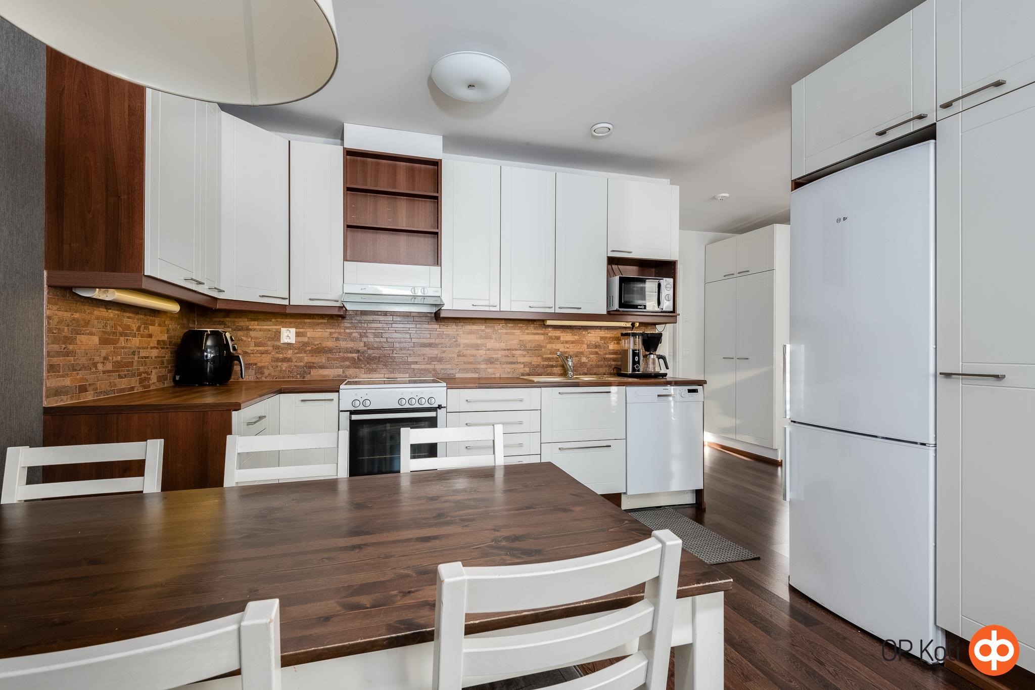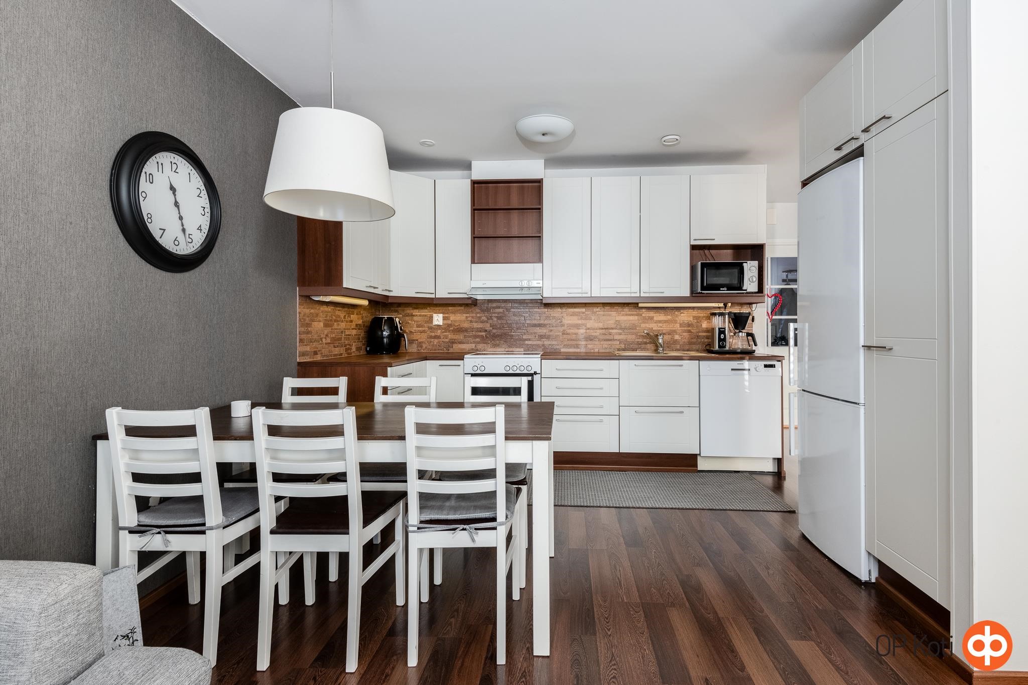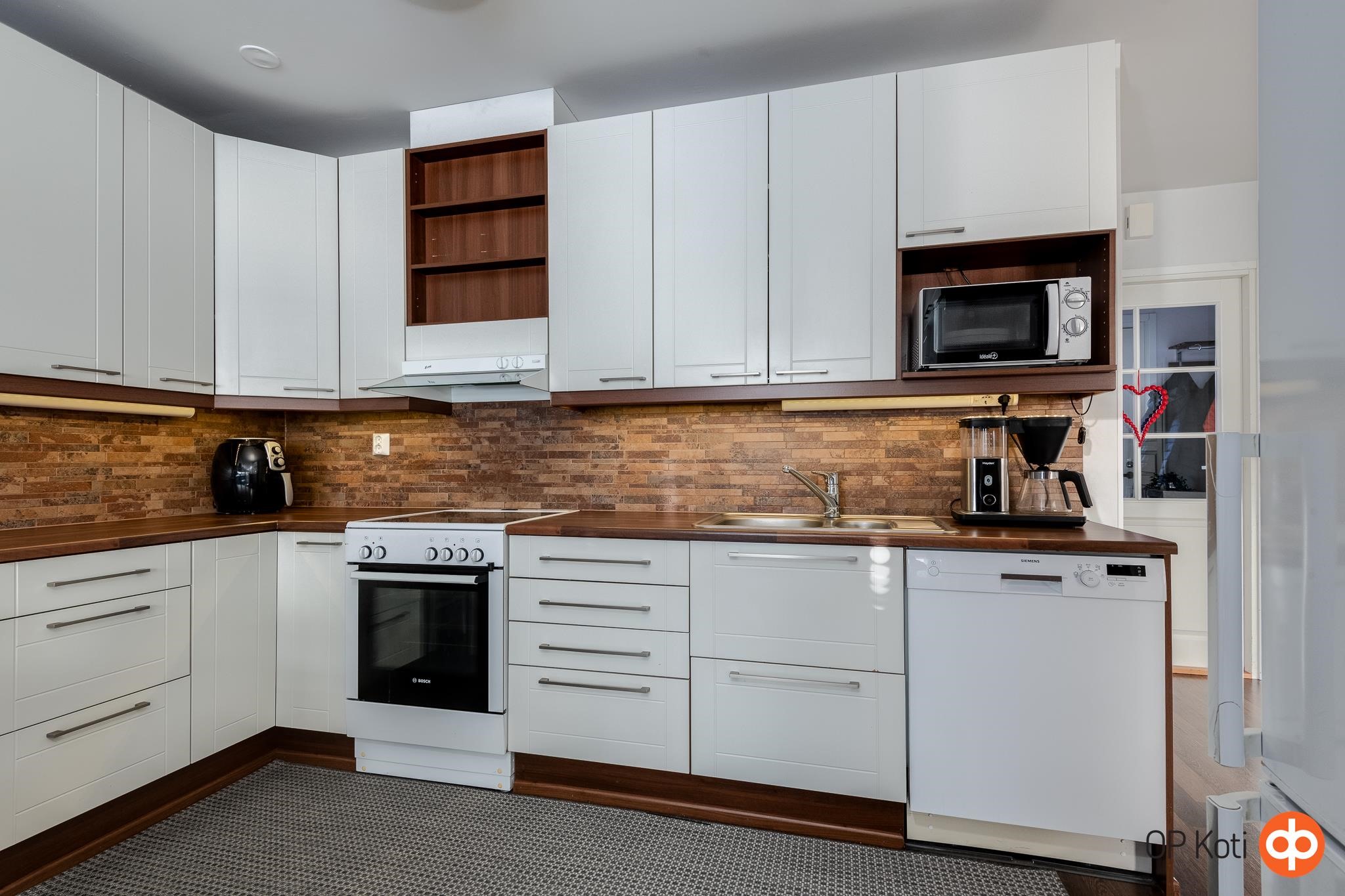 - Jääkaappi, pakastekaappi, keraaminen liesi, liesituuletin, astianpesukone, kaapistot, kiinteät valaisimet.