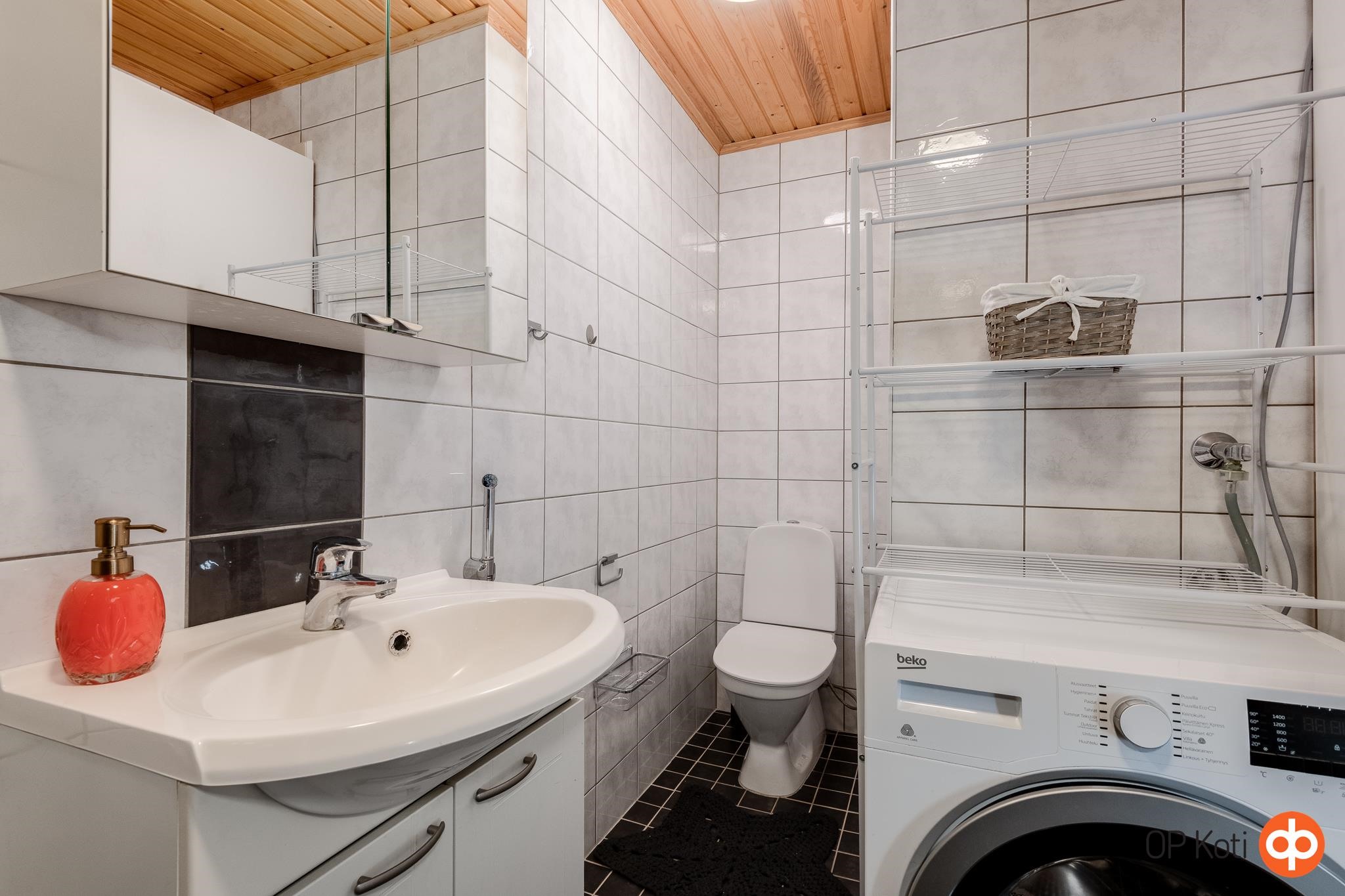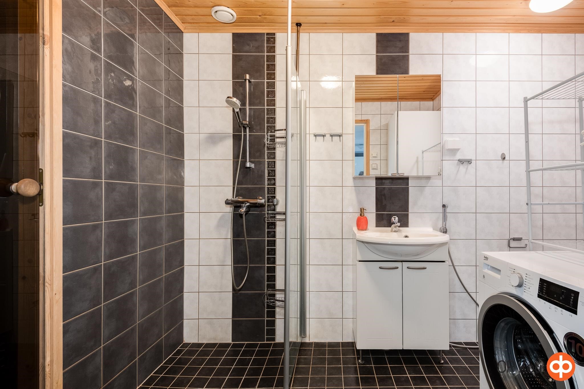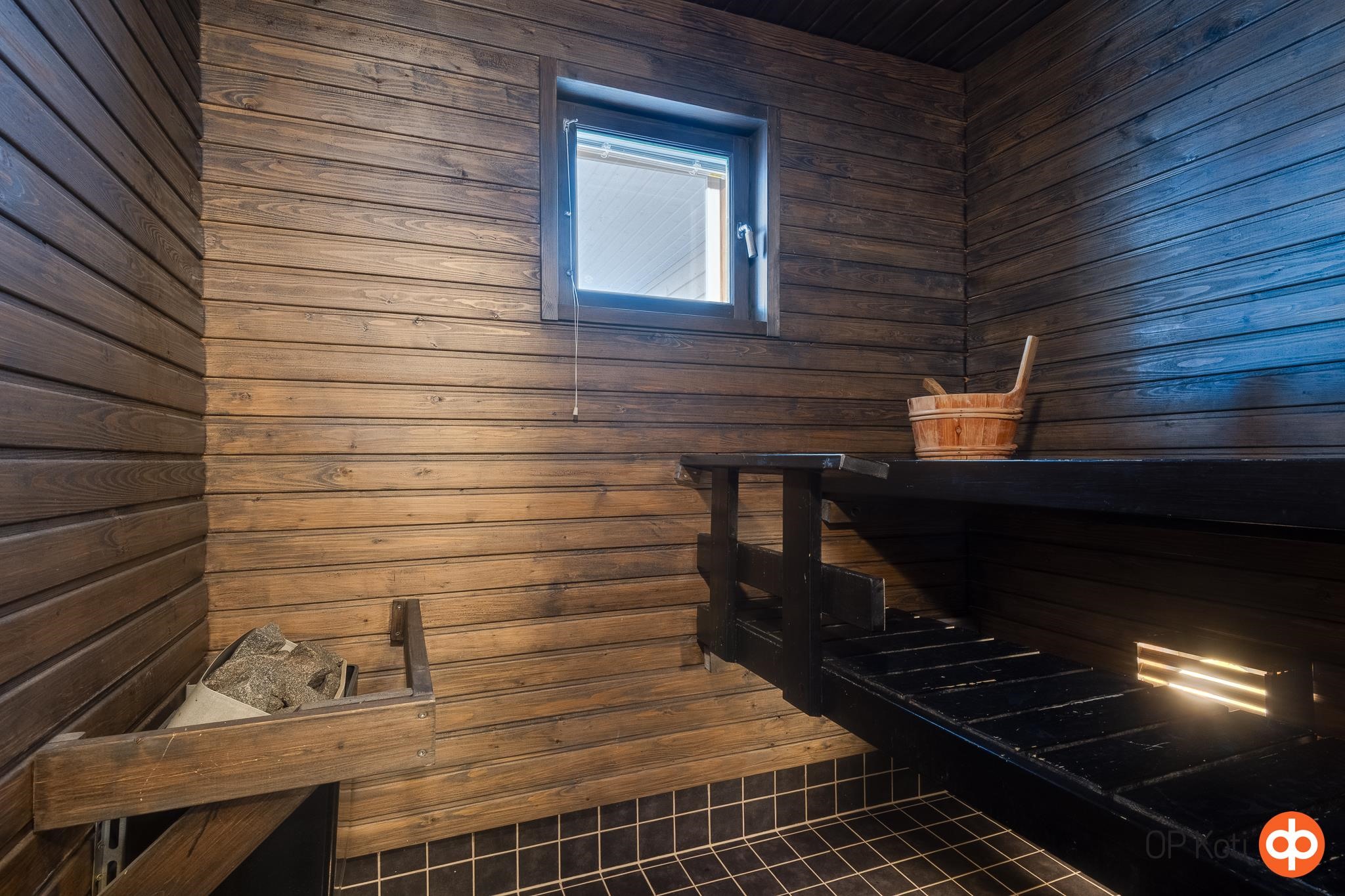 - Sauna, sähkökiuas, kylpyhuone, suihku, suihkuseinä, peilikaappi, kaapit, allaskaappi, pesukoneliitäntä, lattialämmitys, kiinteät valaisimet.
