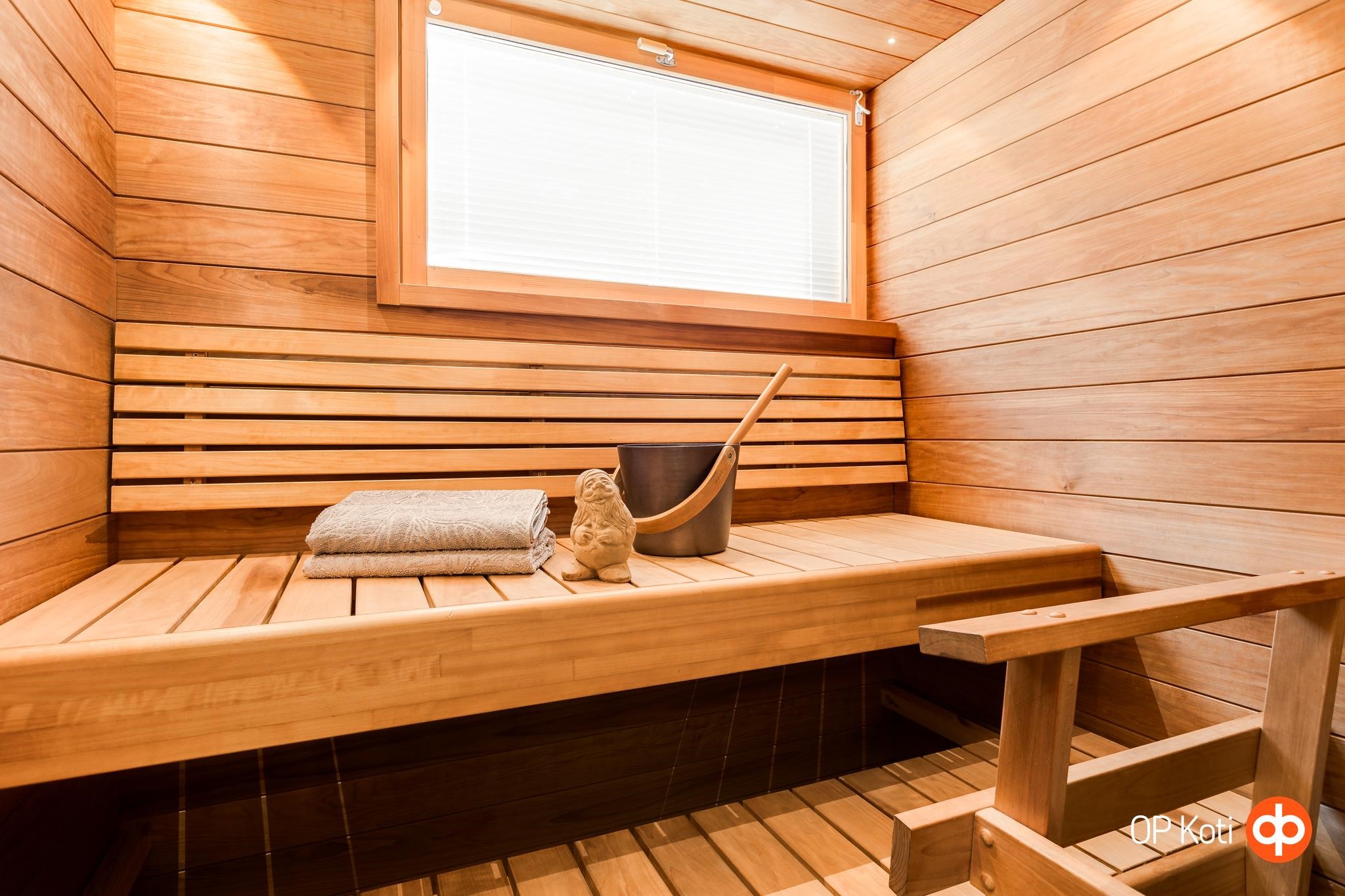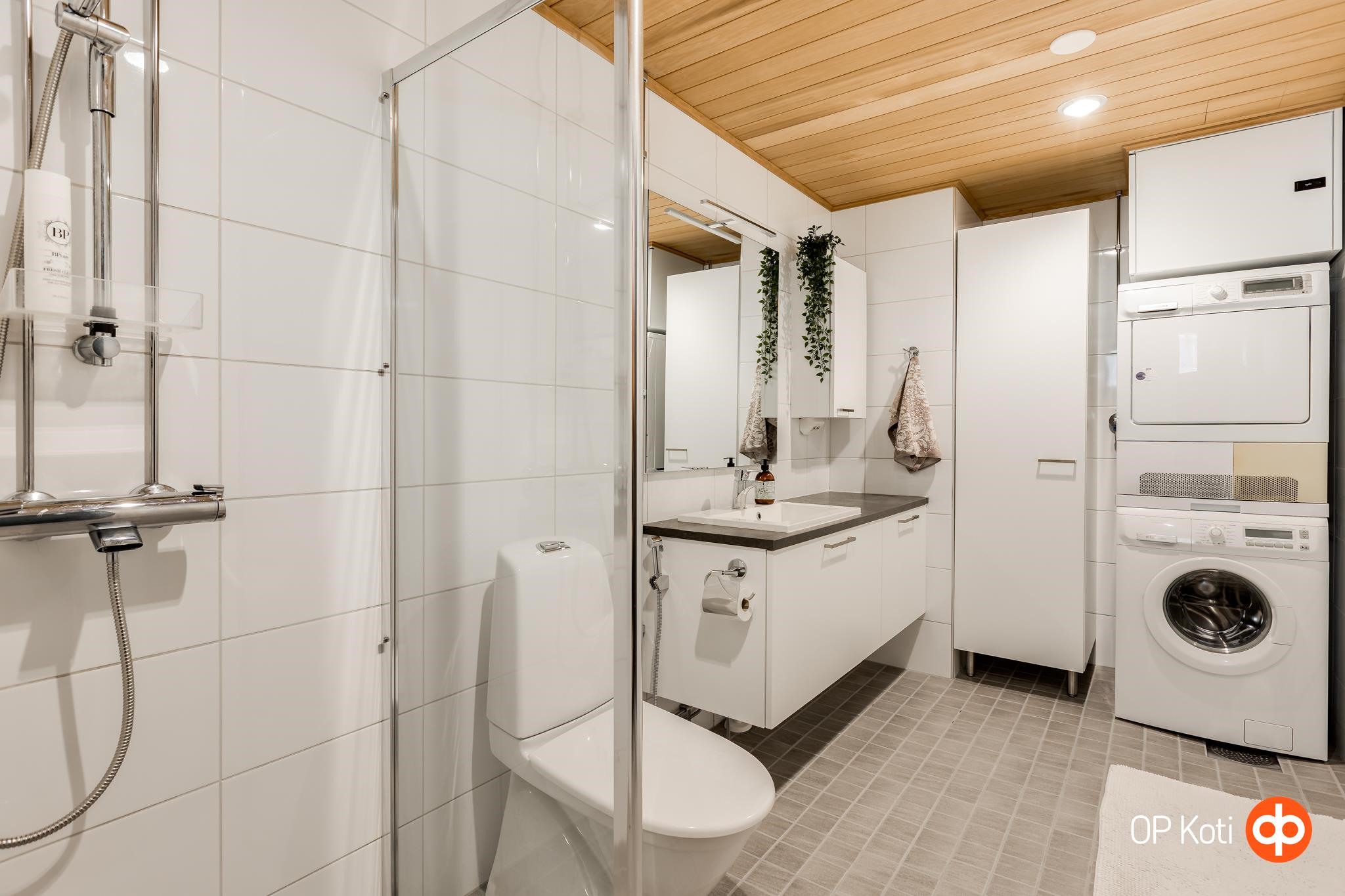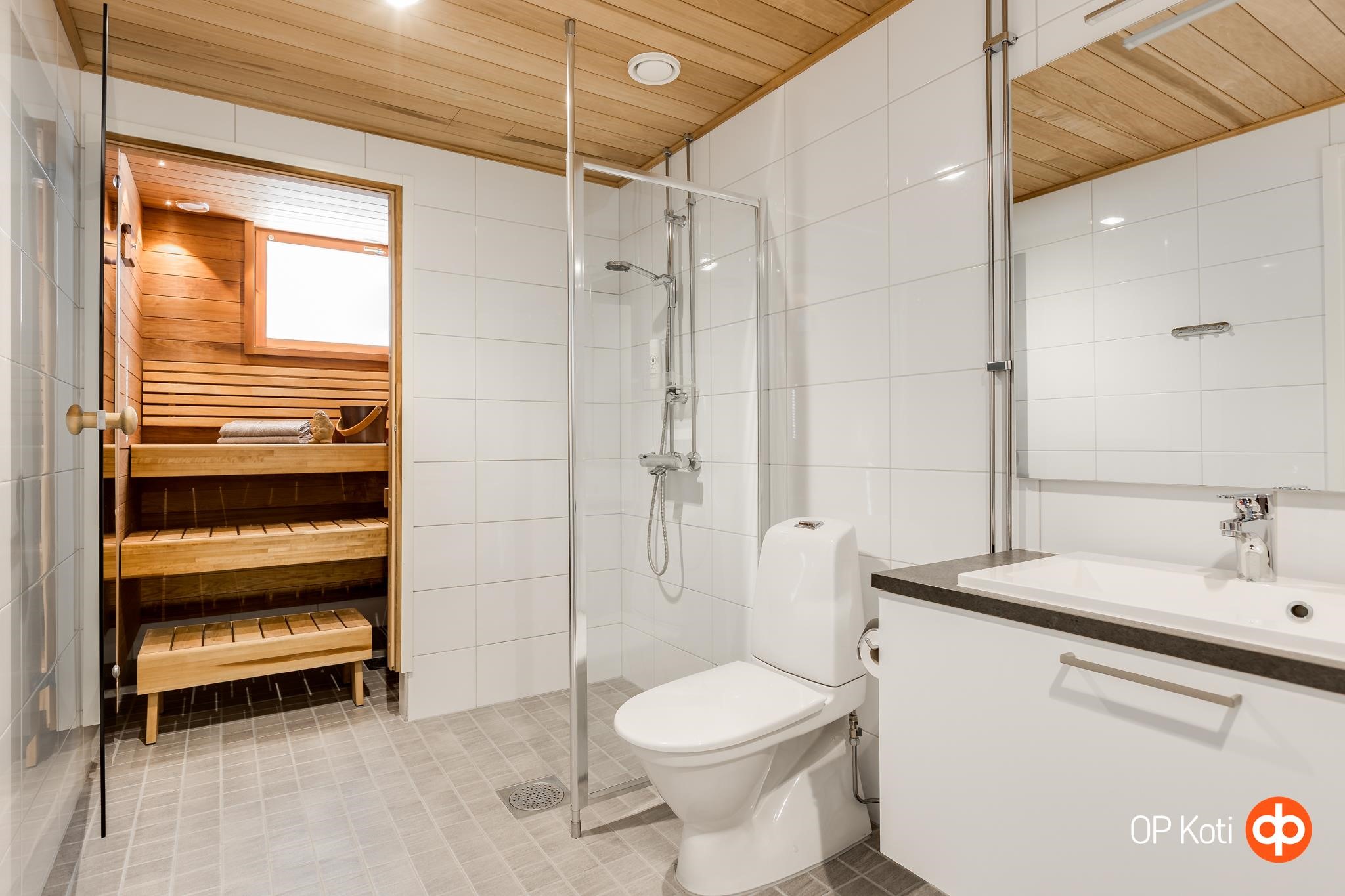 - Sauna, sähkökiuas, kylpyhuone, erillinen wc, suihku, suihkuseinä, peilit, peilikaappi, kaapit, allaskaappi, pesukoneliitäntä, lattialämmitys, kiinteät valaisimet.