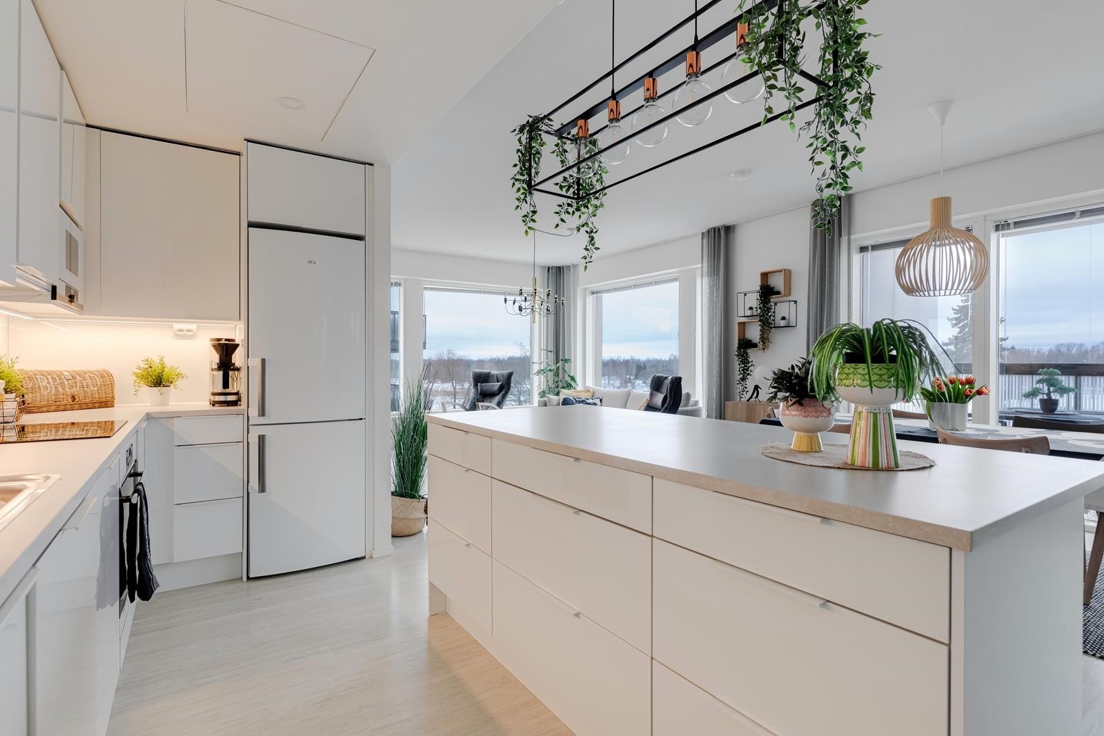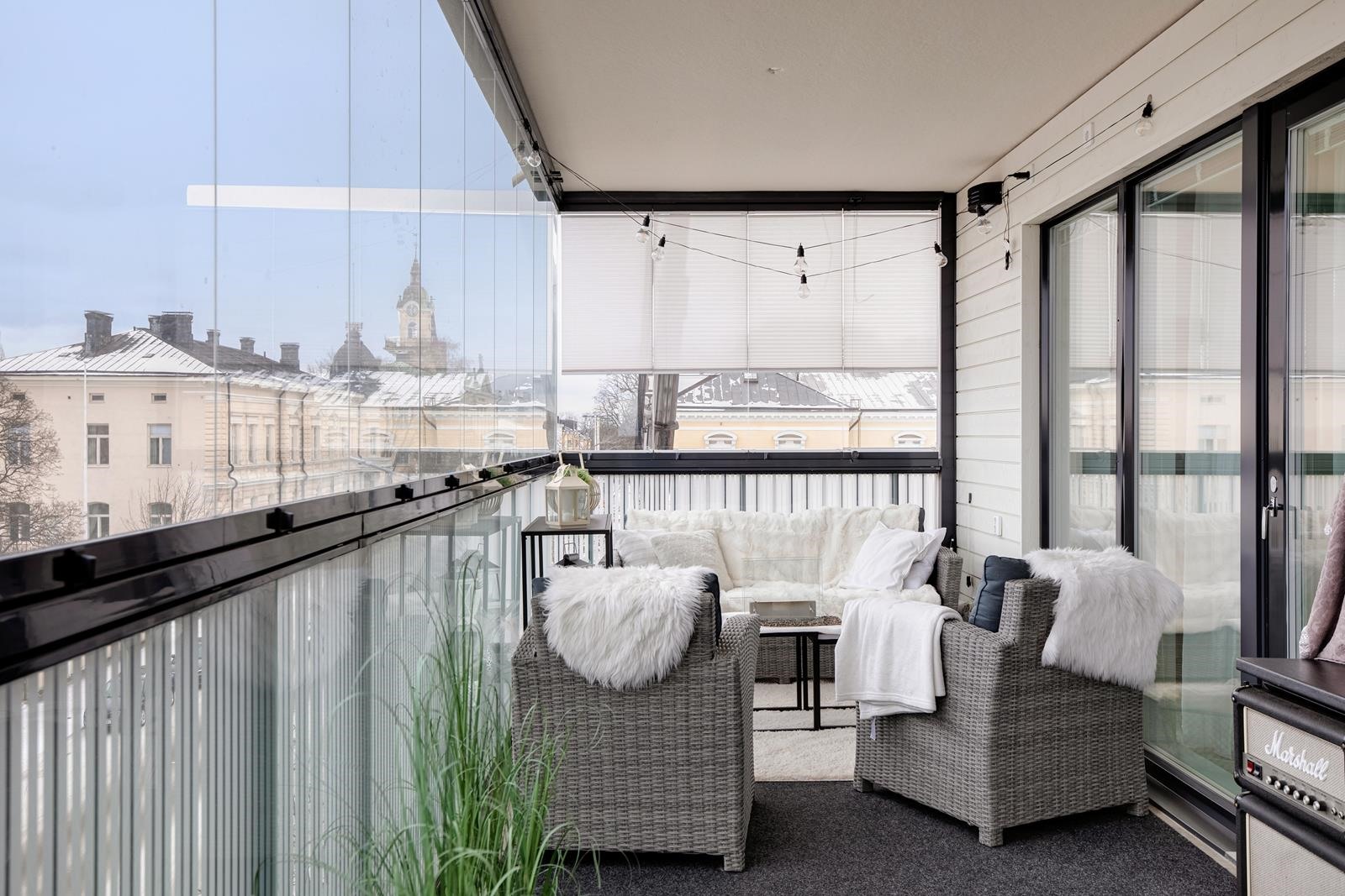 Tämän kulmahuoneiston suuret ikkunapinnat korostavat tilan tuntua ja luonnonvaloa. Täällä voit ihastella Kirvatsin neljää vuoden aikaa sisältä, mutta myös upealta lasitetulta terassilta. Myynnissä myös samasta yhtiöstä autopaikka (mh.23 593 €) jossa sähköauton latausmahdollisuus!