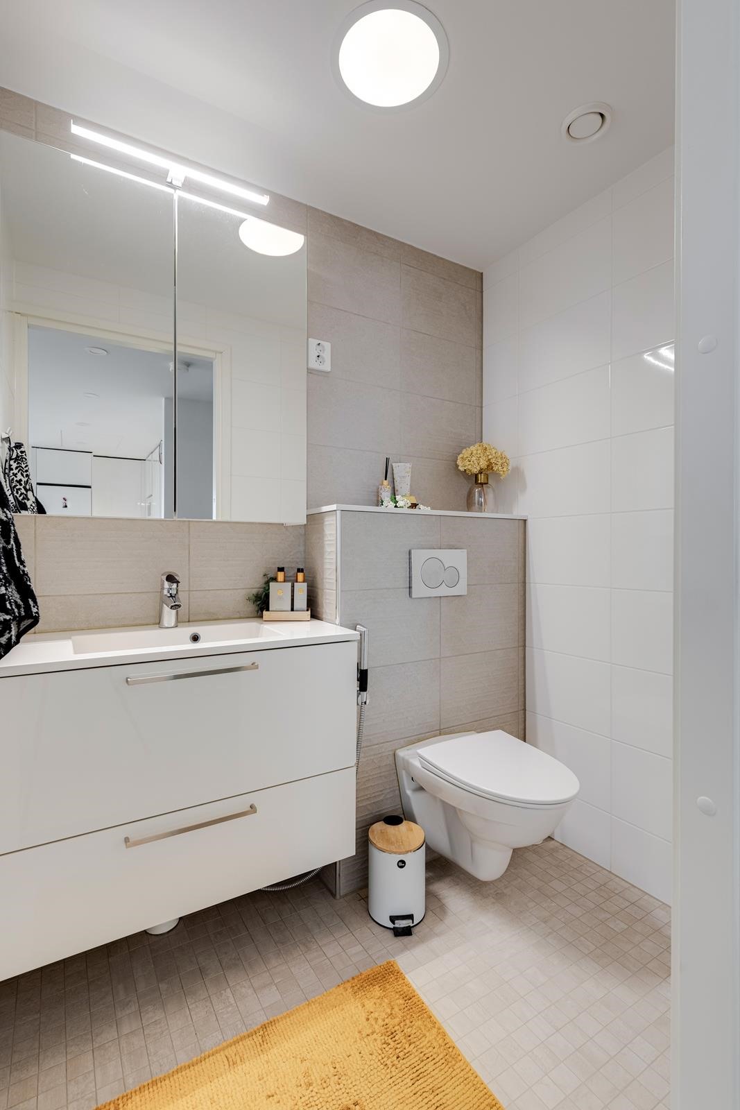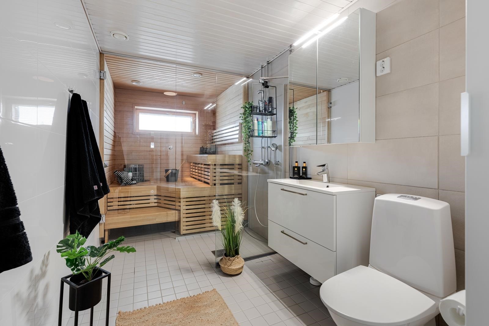 - Sauna, sähkökiuas (Harvia), kylpyhuone, suihku, suihkuseinä, peilit, peilikaappi, kaapit, allaskaappi, pesukoneliitäntä, lattialämmitys, kiinteät valaisimet.