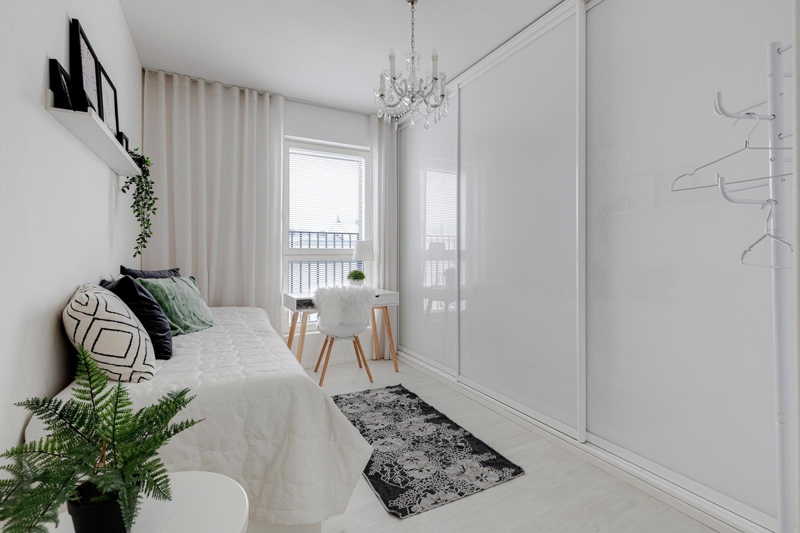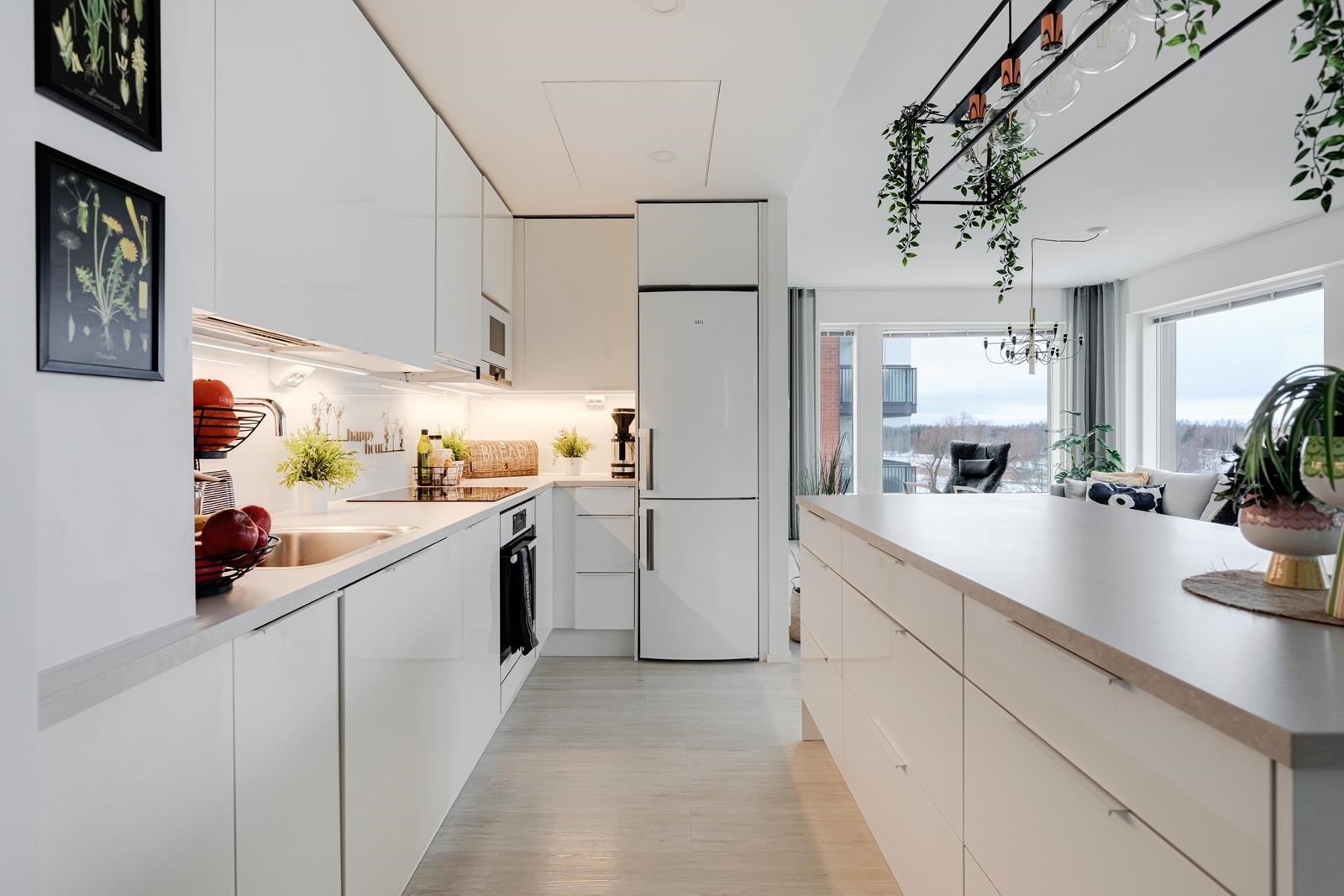 Olohuone ja keittiö muodostavat avaran ja harkitun kokonaisuuden. Asunnossa on peräti kolme makuuhuonetta, kylpyhuone modernilla saunalla, erillinen wc ja poikkeuksellisen tilava oma kodinhoitohuone!