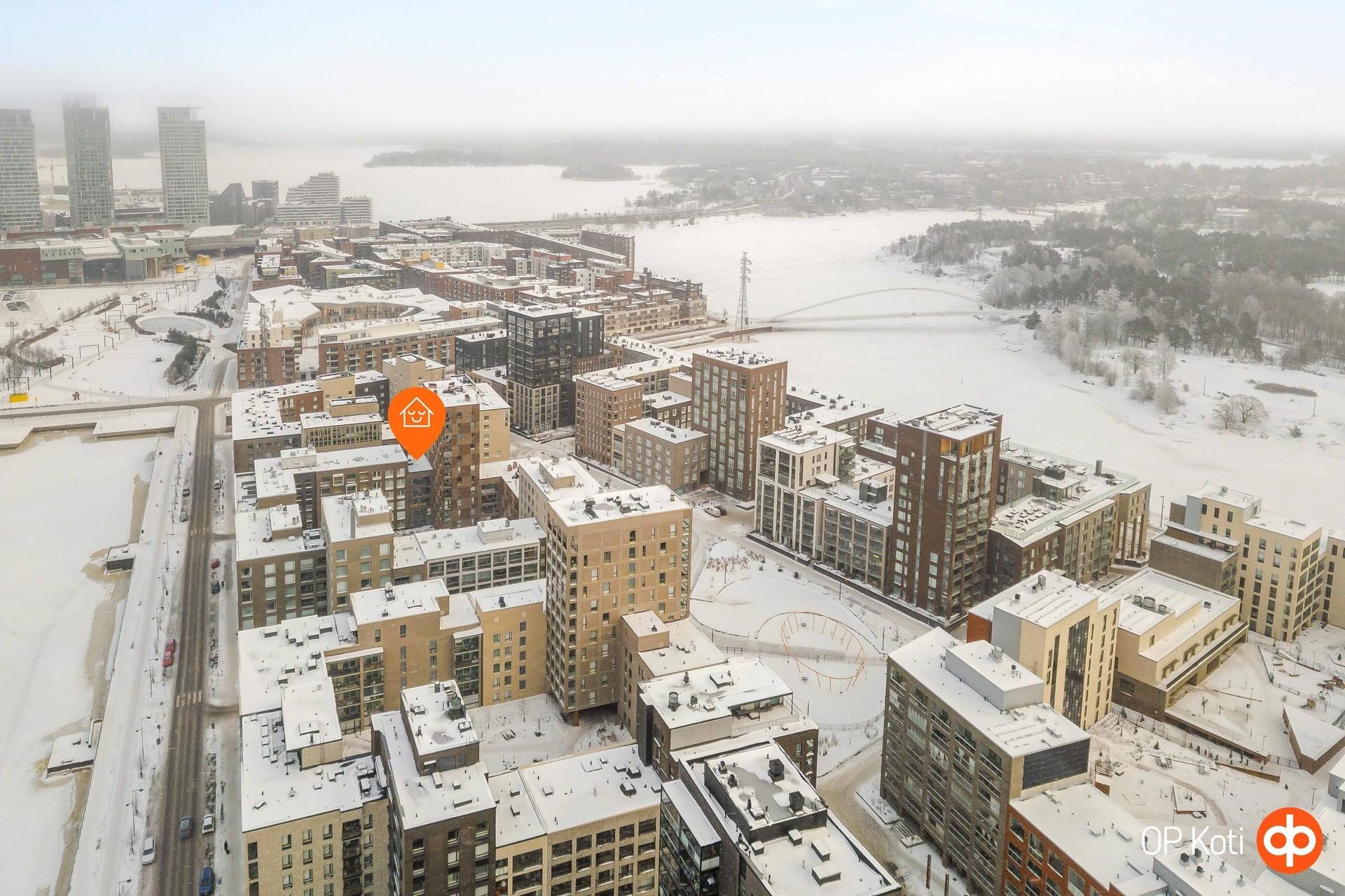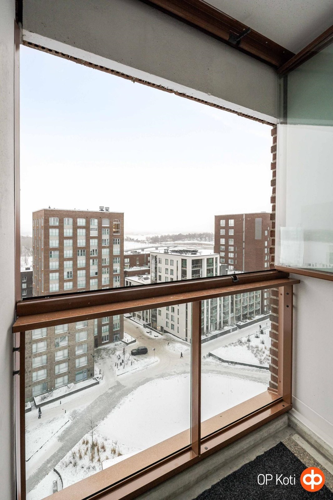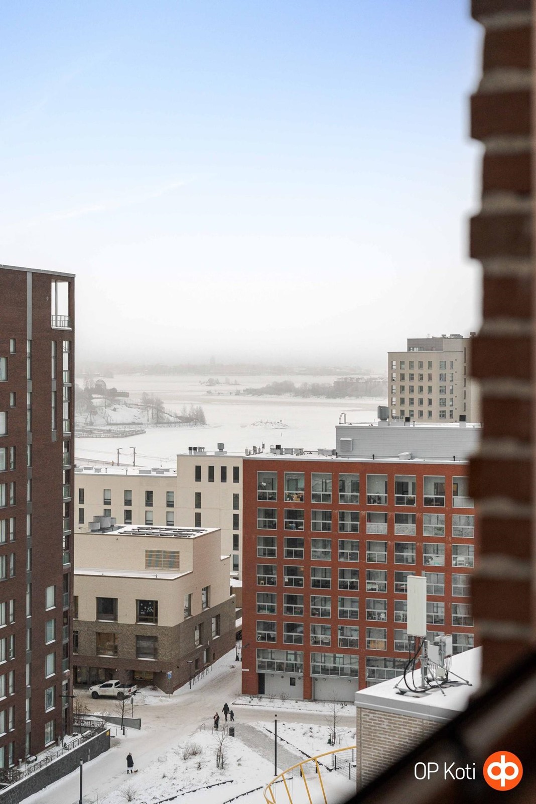 Taloyhtiössä arki käy kevyesti: säilytystilat ovat käytännölliset, autohalliin kuljet suoraan hissillä, ja 12. kerroksen saunatiloista avautuvat hulppeat näkymät horisonttiin.