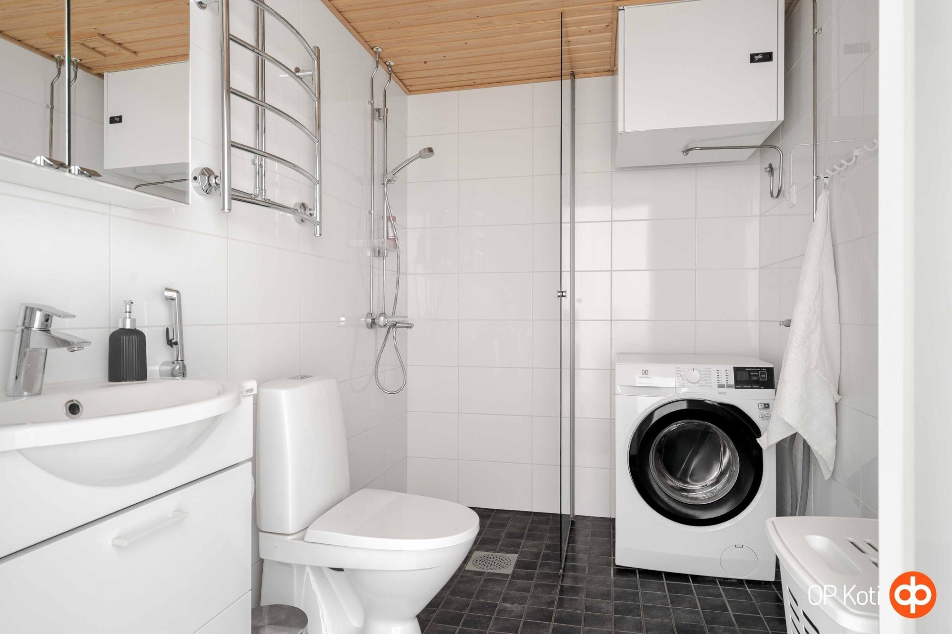 - Suihku, suihkuseinä, peilikaappi, kaapit, allaskaappi, pesukoneliitäntä, lattialämmitys kylpyhuoneen vesikiertoinen lattialämmitys, kiinteät valaisimet.