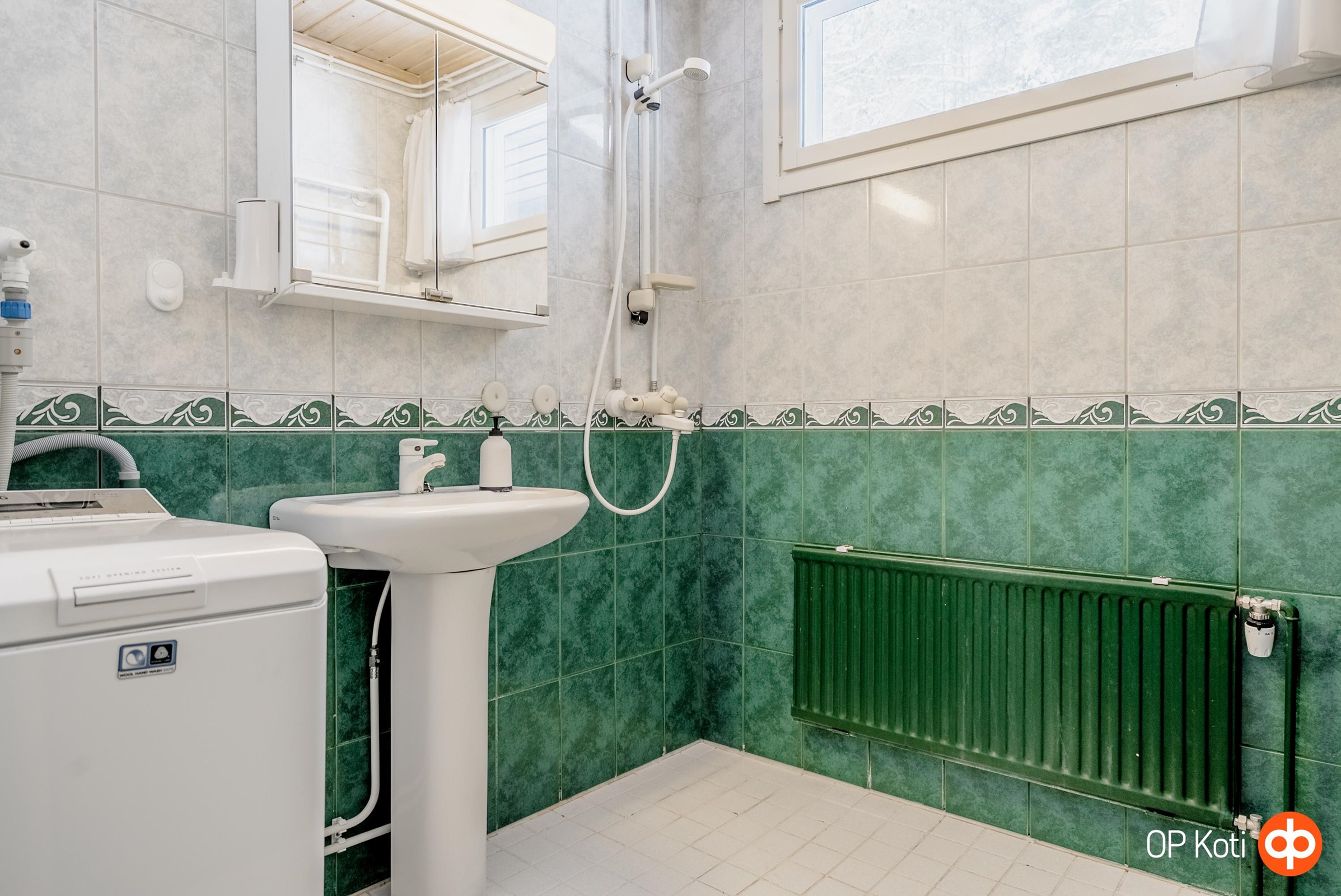 - Sauna, sähkökiuas, kylpyhuone, suihku, suihkuseinä, peilit, peilikaappi, kaapit, allaskaappi, pesukoneliitäntä, kiinteät valaisimet.