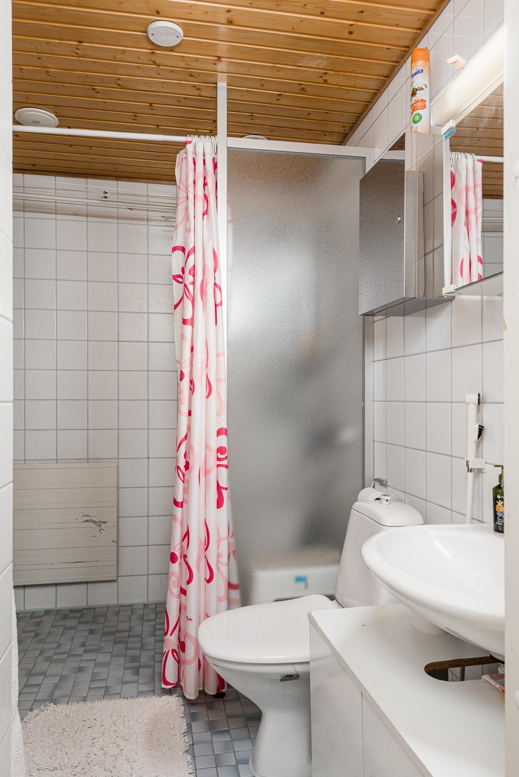 - Sauna, sähkökiuas, kylpyhuone, suihku, suihkuseinä, peilikaappi, allaskaappi, kiinteät valaisimet.