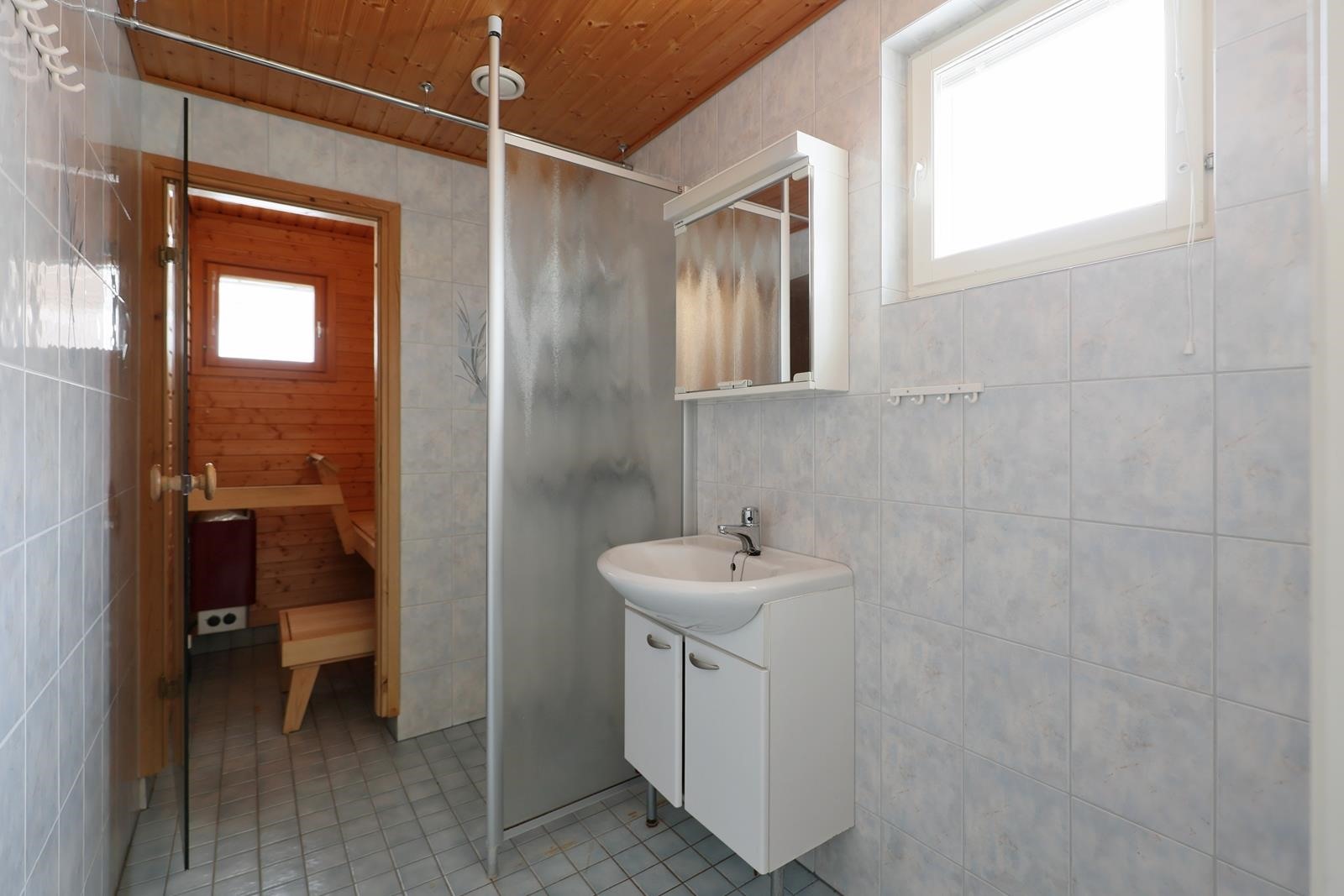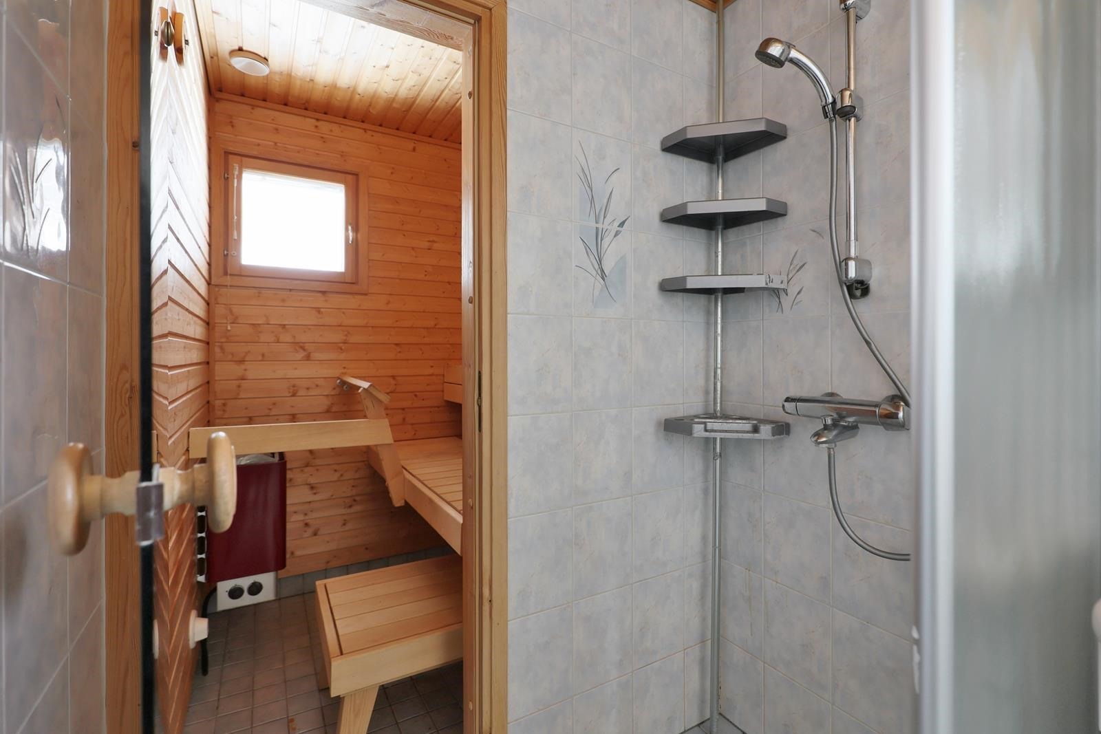 - Sauna, sähkökiuas, kylpyhuone, erillinen wc, suihku, suihkuseinä, peilit, peilikaappi, allaskaappi, pesukoneliitäntä, lattialämmitys, kiinteät valaisimet. Lattialämmityksen termostaatti uusittu 1/2026.