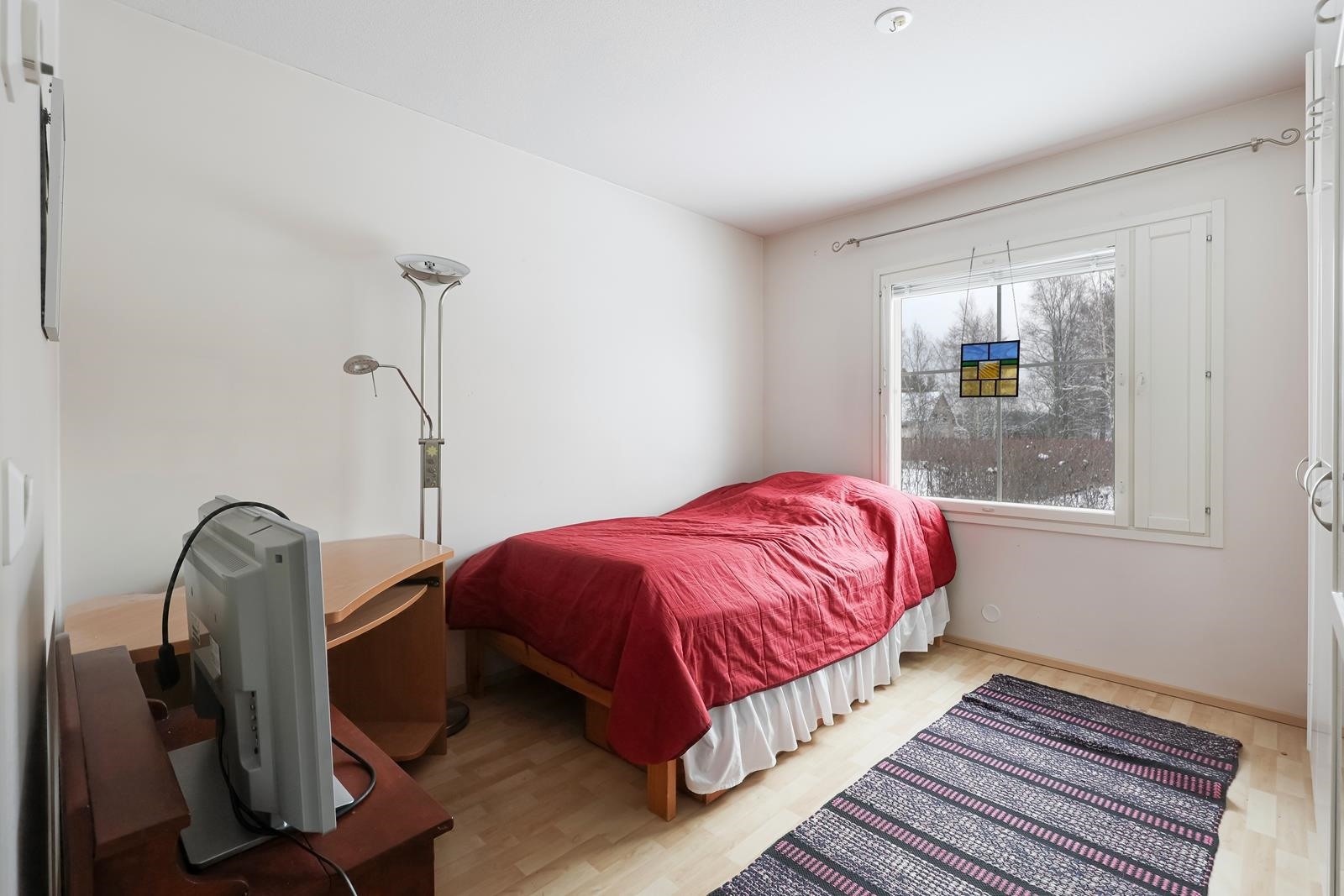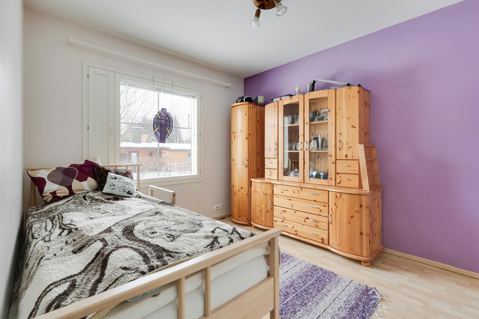 Keittiö: parketti, maalatut seinät. Olohuone: parketti, maalatut seinät. Makuuhuone 1: muovimatto, maalatut seinät. Makuuhuone 2: muovimatto, maalatut seinät. Kodinhoitohuone: laattalattia, maalatut seinät. Sauna: puupaneeli, laattalattia. Kylpyhuone: laattalattia, laatta seinissä. Eteinen: laattalattia, maalatut seinät. Wc: laatta/maali, laattalattia.
