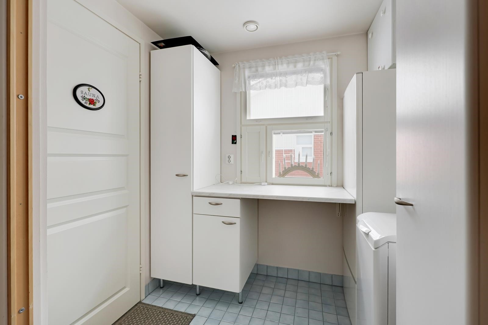 Kodin arkea helpottavat erillinen kodinhoitotila, erillinen wc sekä reilunkokoinen pesuhuone ja oma sauna. Säilytystilaa on runsaasti kaapistojen ja vaatehuoneen lisäksi autokatoksen yhteydessä olevassa kylmässä varastossa. Huoneistolle kuuluu oma autokatospaikka.