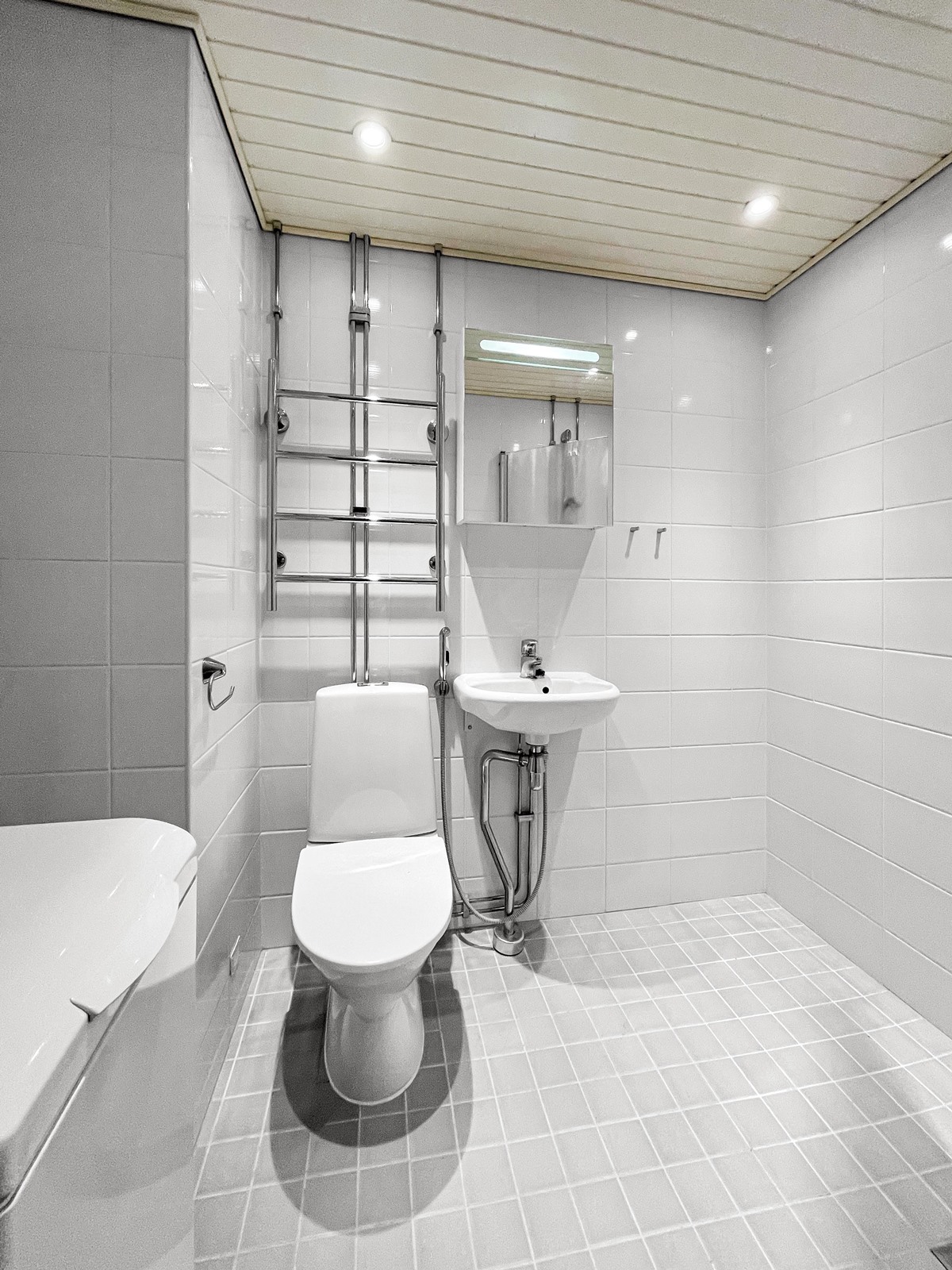 - Kylpyhuone, suihku, suihkuseinä, peilikaappi, pesukoneliitäntä, kiinteät valaisimet. pyyhekuivain, pyykinpesukone voi jäädä asuntoon