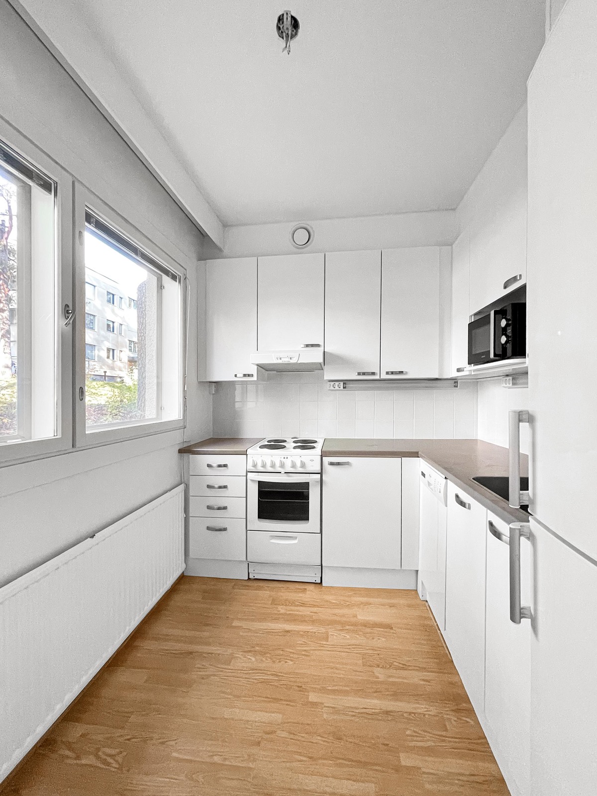 - Jääkaappipakastin, sähköliesi, liesituuletin, astianpesukone, kaapistot, kiinteät valaisimet.