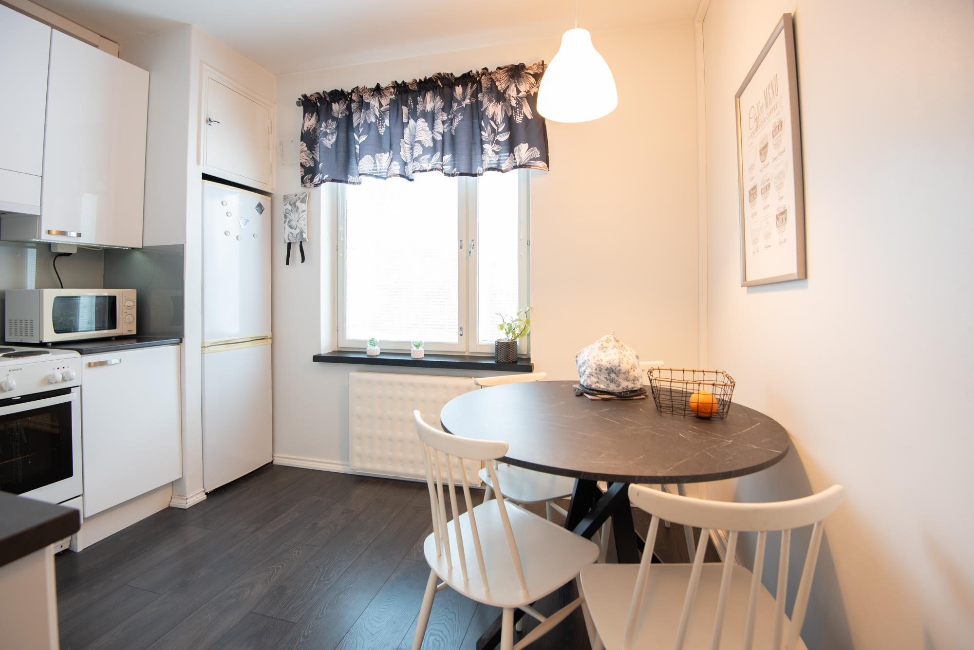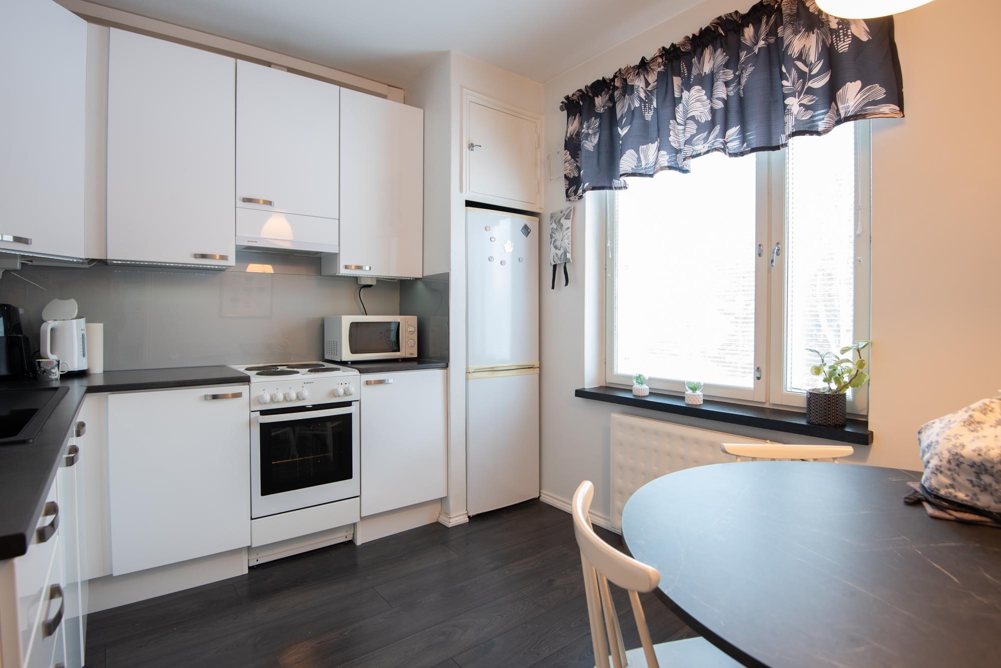 - Jääkaappipakastin, lattialiesi, liesituuletin, kaapistot, kiinteät valaisimet.