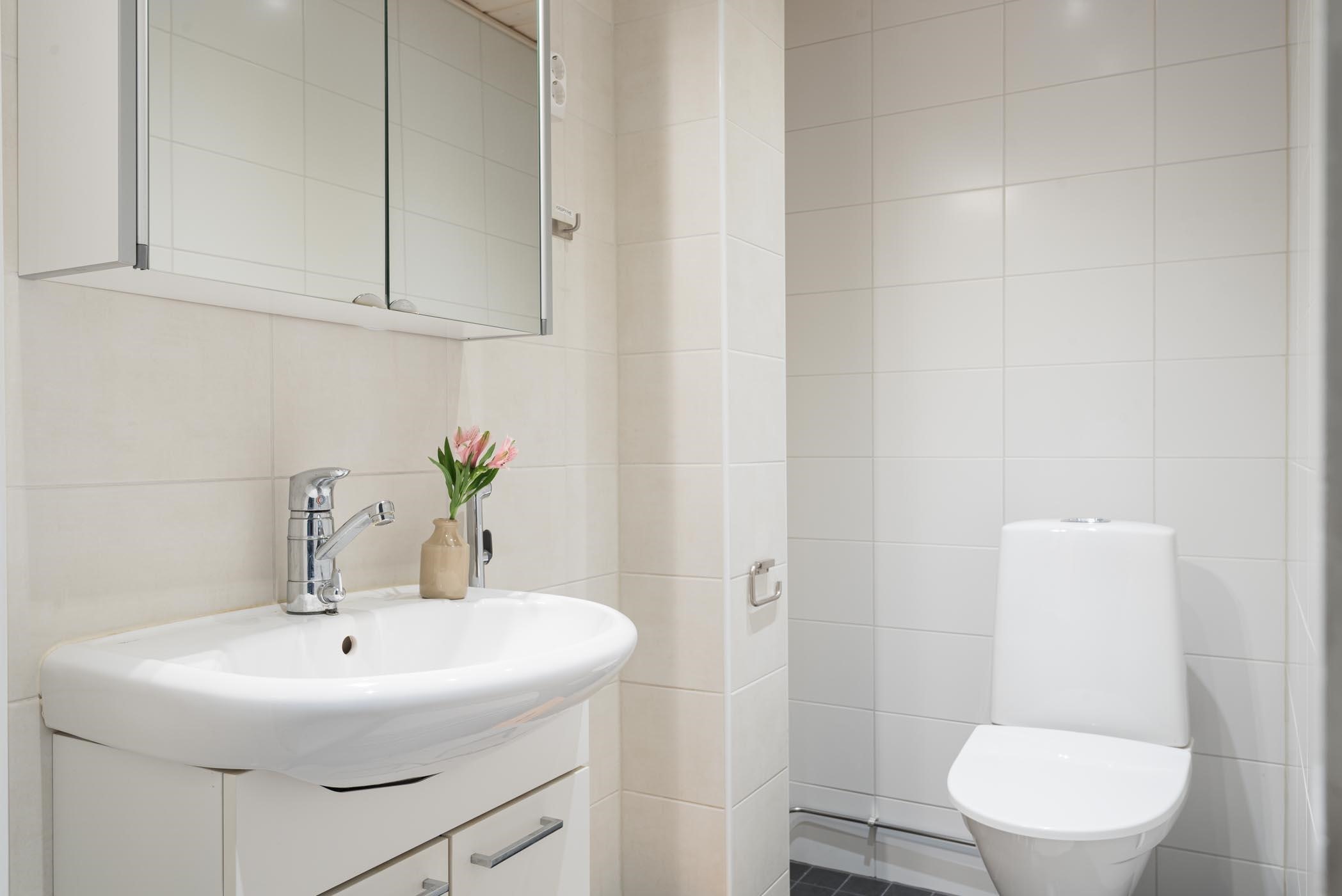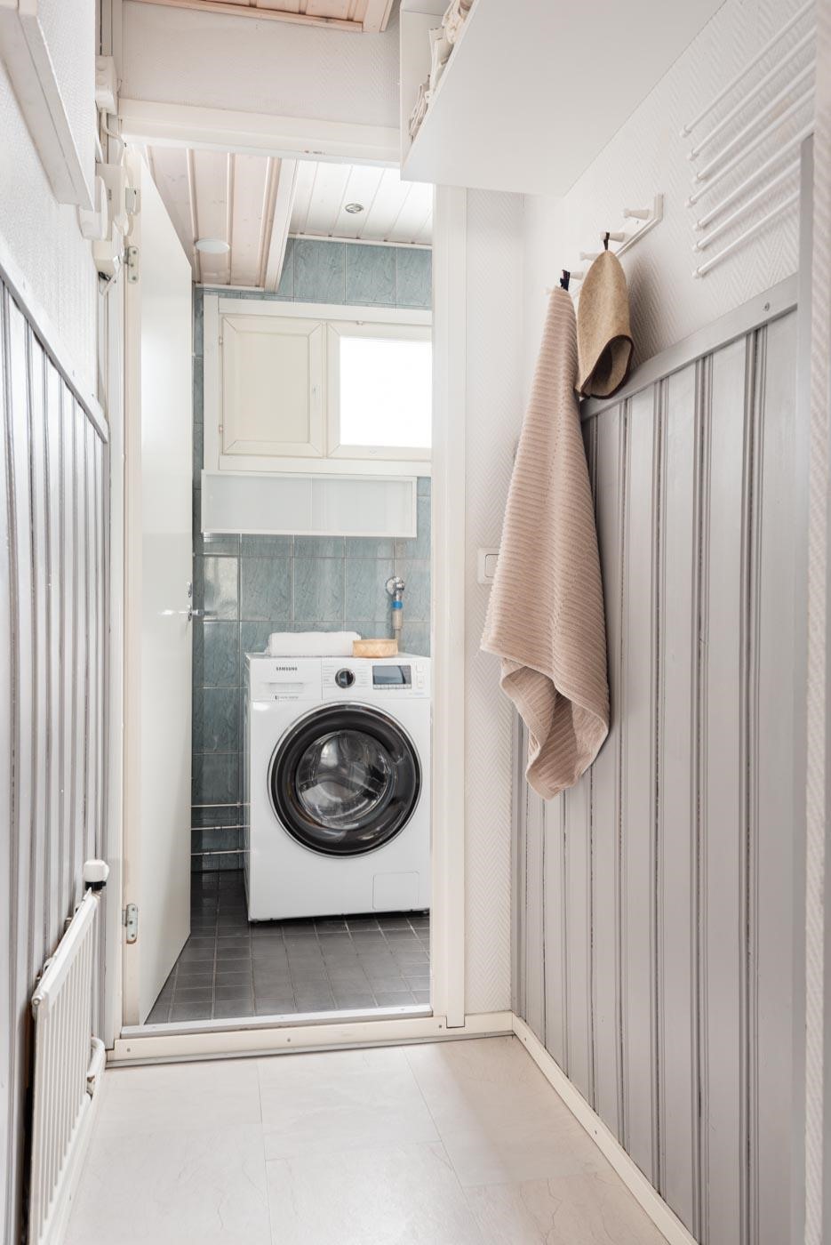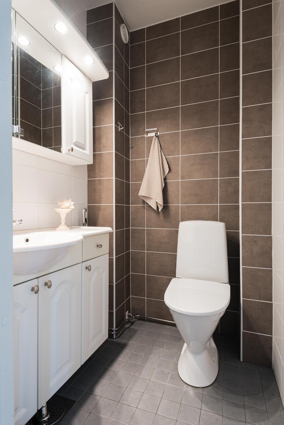 - Sauna, sähkökiuas, kylpyhuone, erillinen wc (2 kpl), suihku, suihkukaappi (höyrysuihkukaappi, radio ym.), peilikaappi (ala- ja yläkerran wc), kaapit, allaskaappi (ala- ja yläkerran wc), pesukoneliitäntä (kph), lattialämmitys (kph), kiinteät valaisimet. Kylpyhuone on remontoitu edellisen omistajan aikana