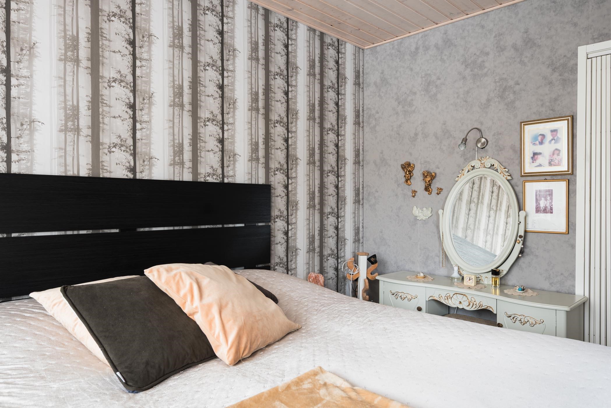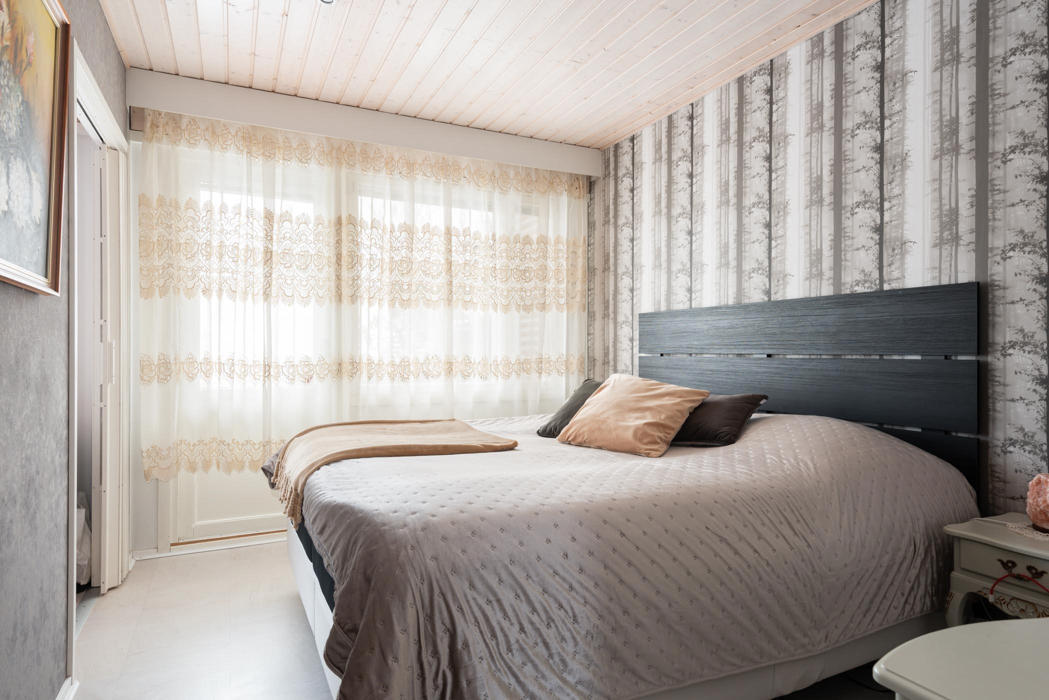Keittiö: maali, vinyyli. Olohuone: maali/tapetti, laminaatti. Makuuhuone 1: maali/tapetti, laminaatti. Makuuhuone 2: maali/tapetti, laminaatti. Sauna: paneeli, laatta. Kylpyhuone: laatta, laatta. Eteinen: paneeli/maali, laminaatti. Wc: laatta, laatta ja laatta, laatta.