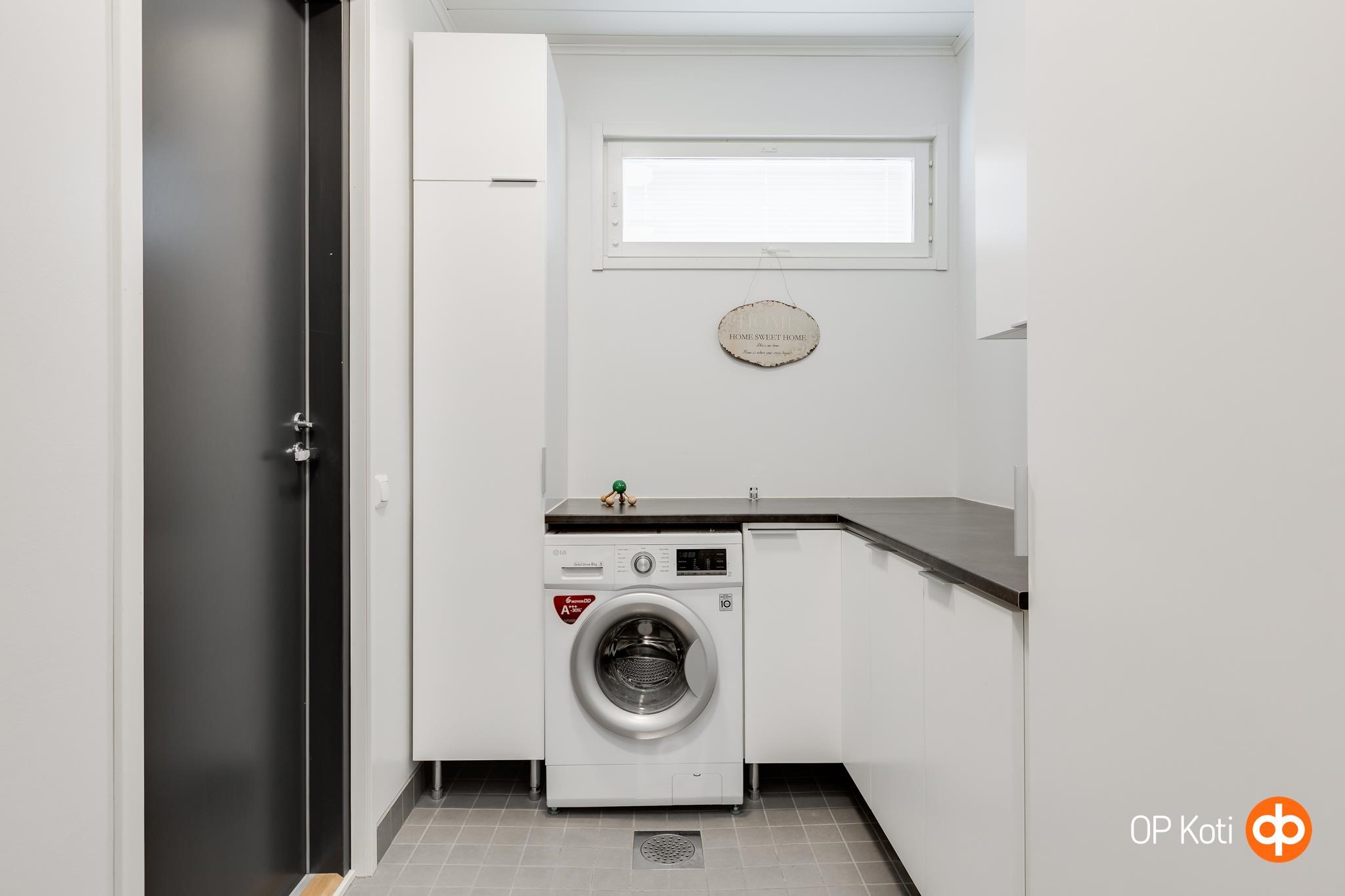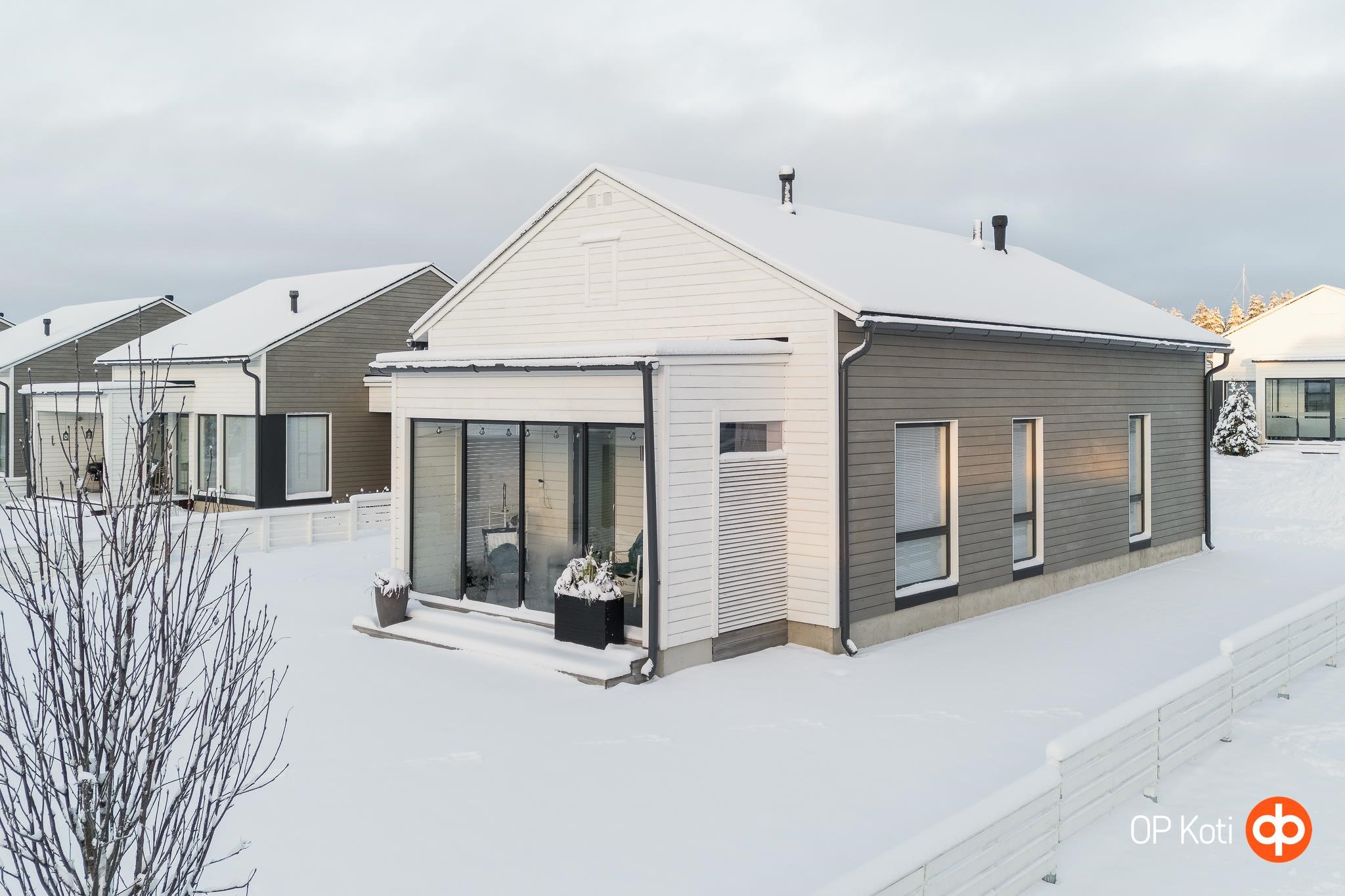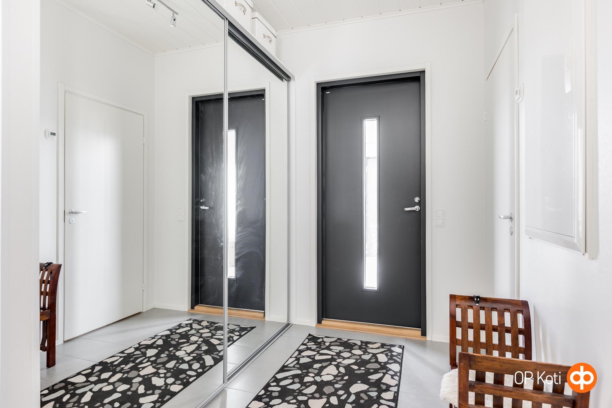 Kodin sydän on tilava olohuone, joka jatkuu saumattomasti lasitetulle terassille, täydellinen paikka rentoutumiseen säällä kuin säällä. Kodin toiminnallisuus on hiottu huippuunsa: tilava varasto sekä erillinen vaatehuone tarjoavat runsaasti säilytystilaa. Kodinhoitohuoneeseen on kätevä erillinen sisäänkäynti, mikä helpottaa arkea ja tuo lisää käytännöllisyyttä. Myös etupihan lasitettu terassi suojaa tuulelta ja tarjoaa mukavan oleskelupaikan.