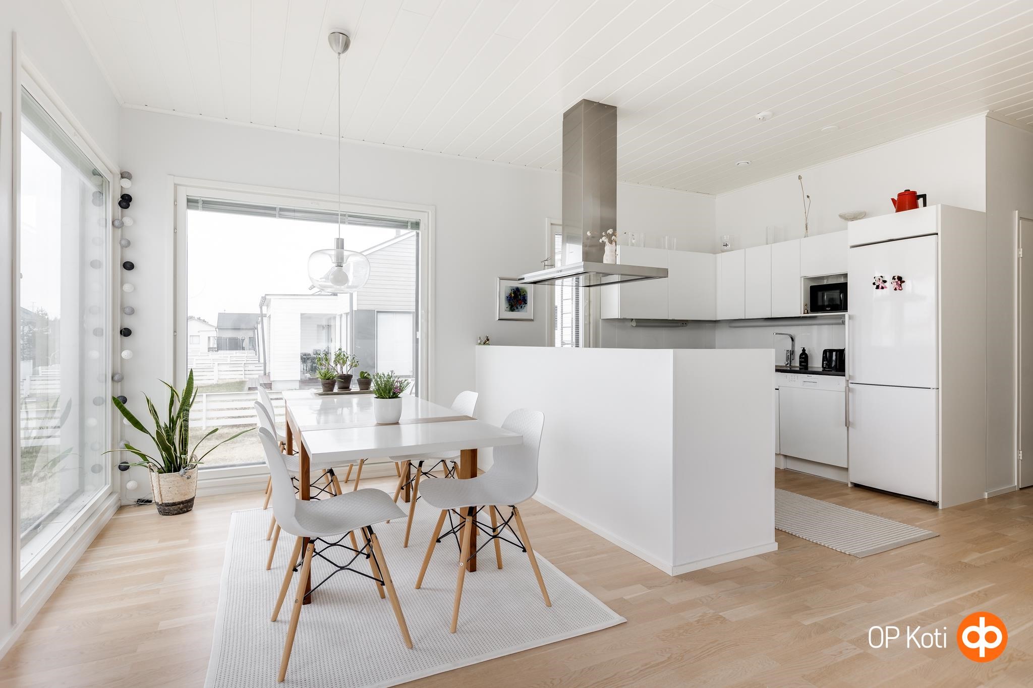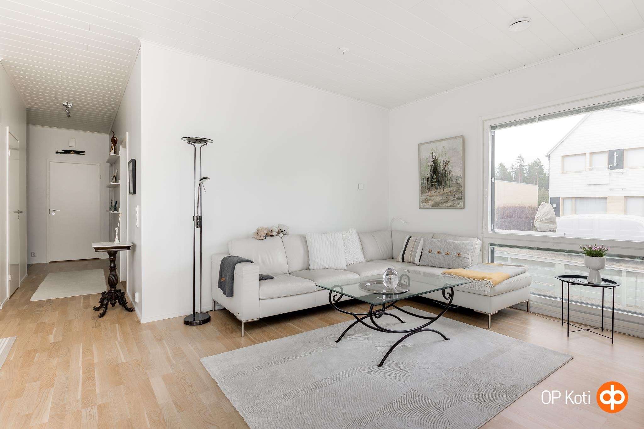 Vaalea ja tyylikäs sisustus, suuret ikkunat ja avarat oleskelutilat luovat valoisan ja viihtyisän tunnelman.