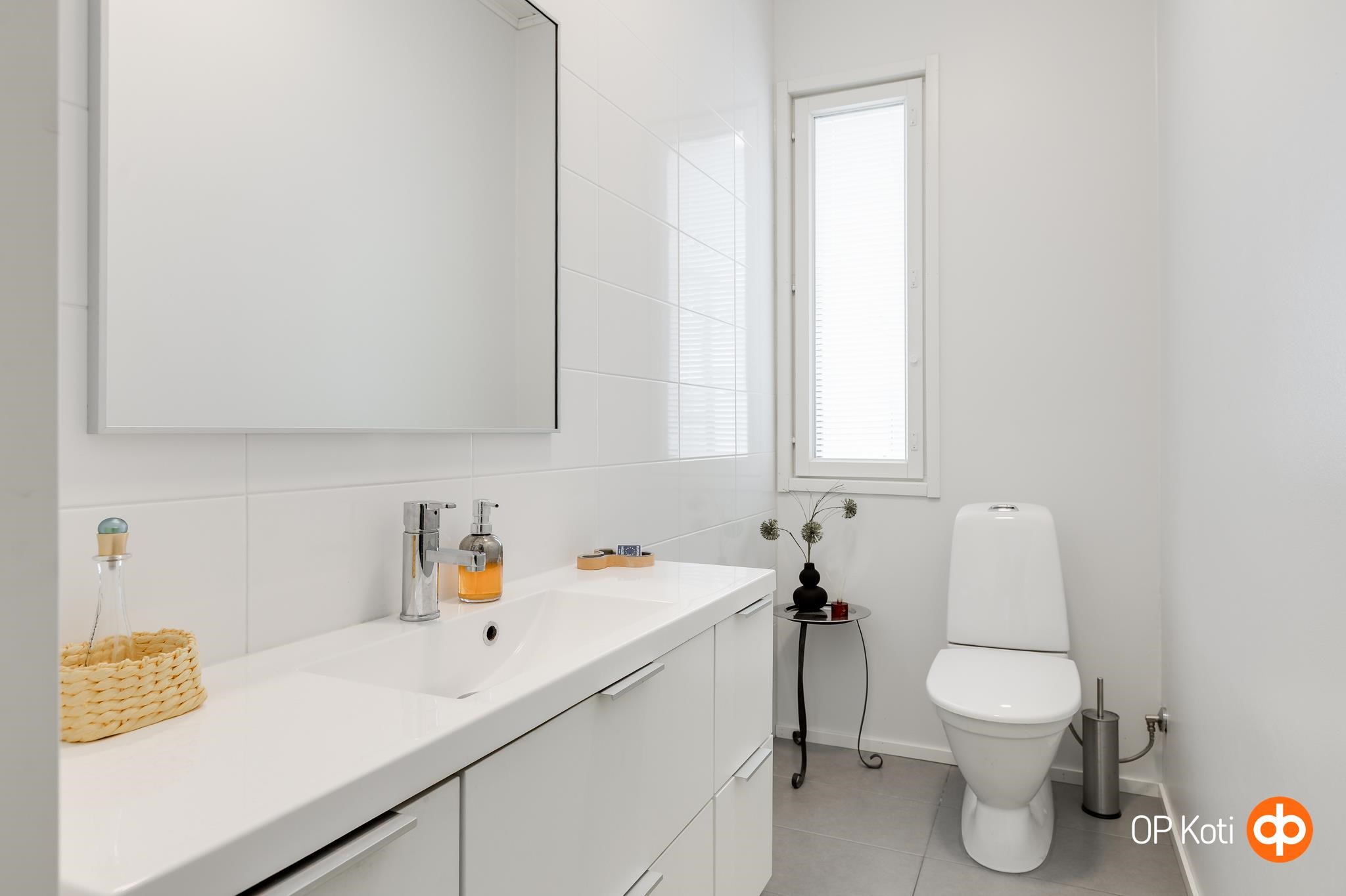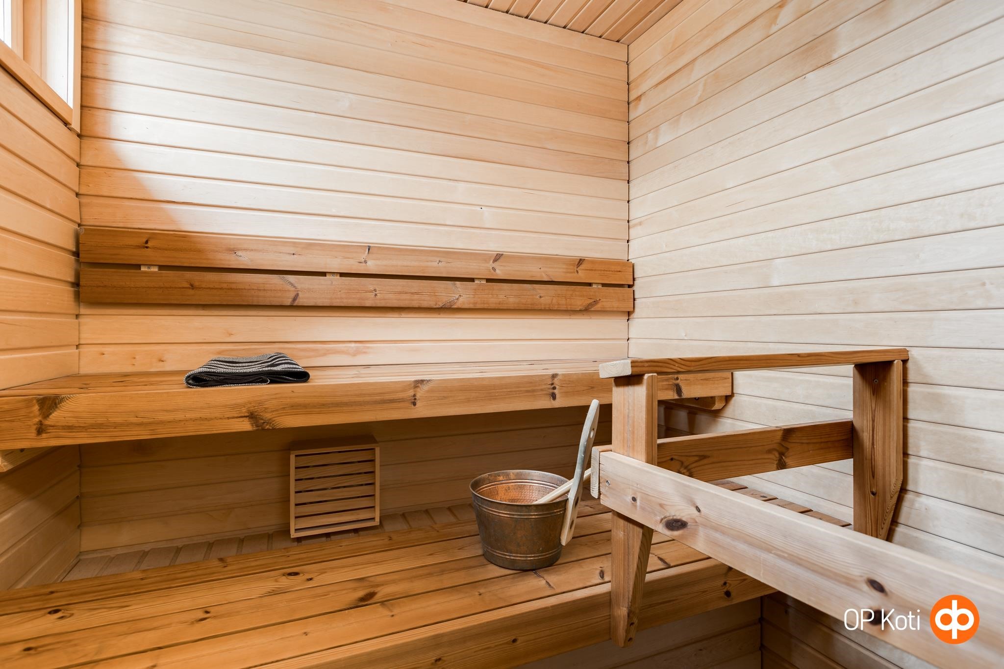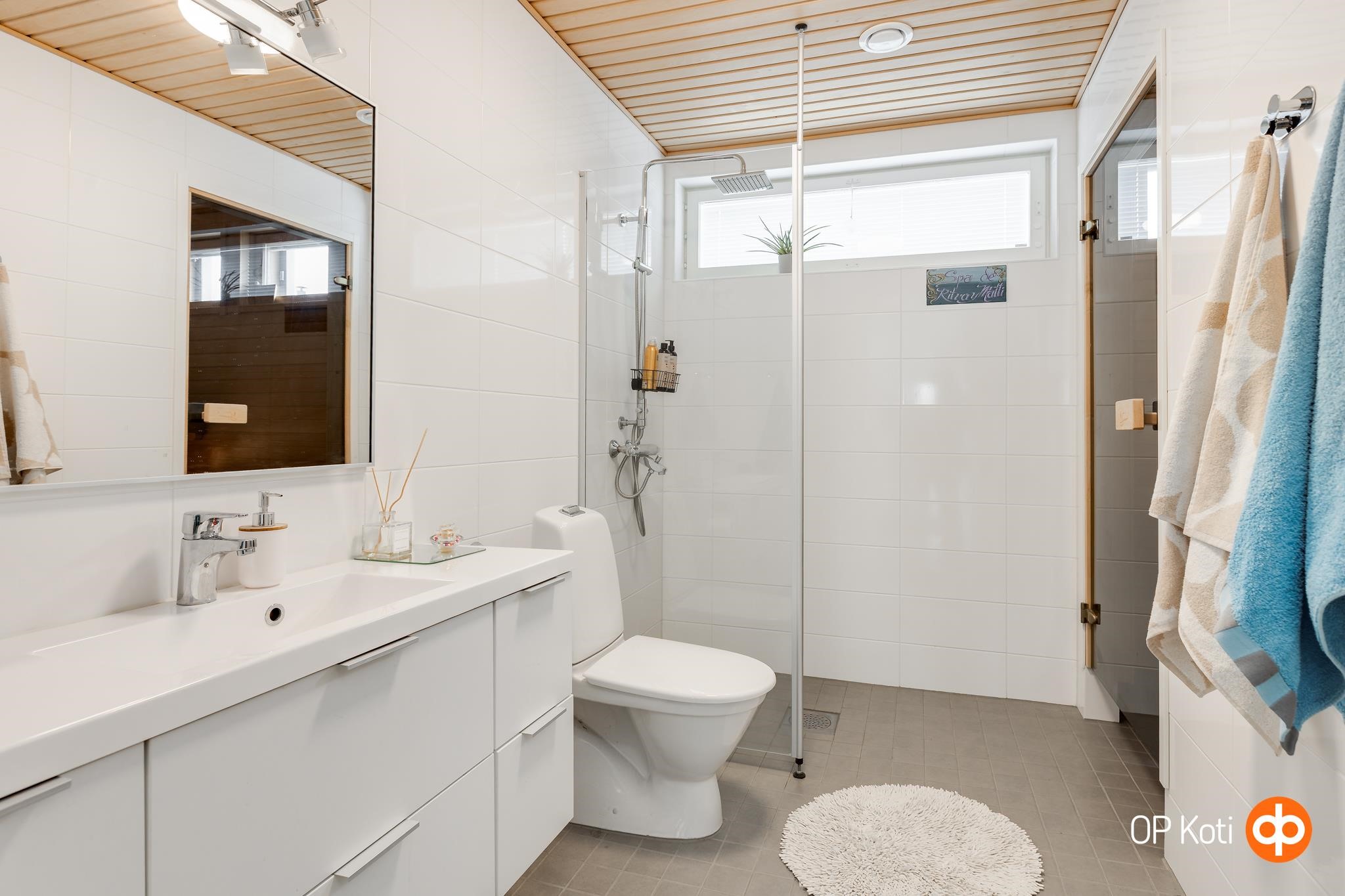 - Sauna, sähkökiuas, kylpyhuone, erillinen wc, suihku, suihkuseinä, peilit, peilikaappi, kaapit, allaskaappi, pesukoneliitäntä, lattialämmitys, kiinteät valaisimet.