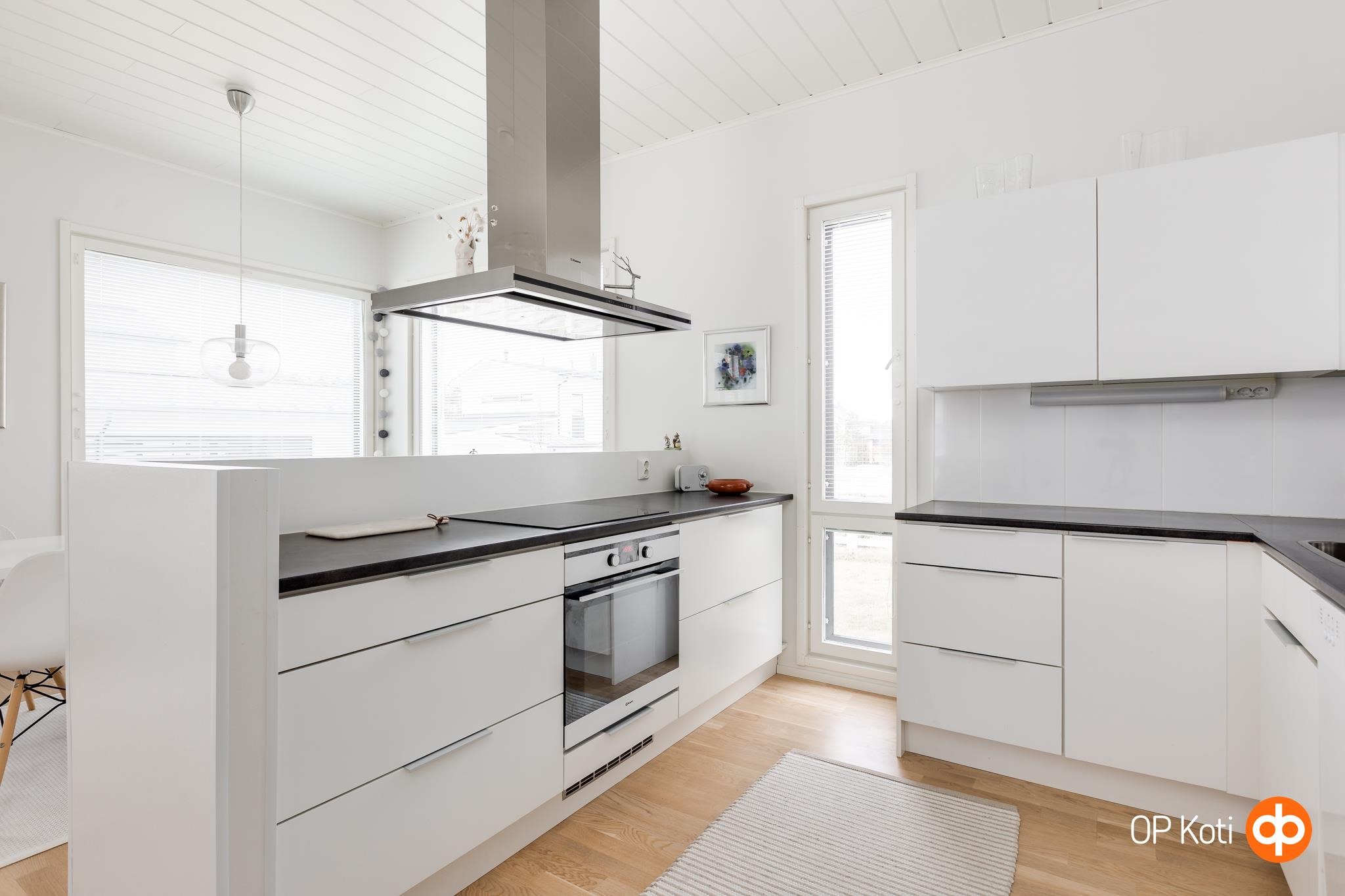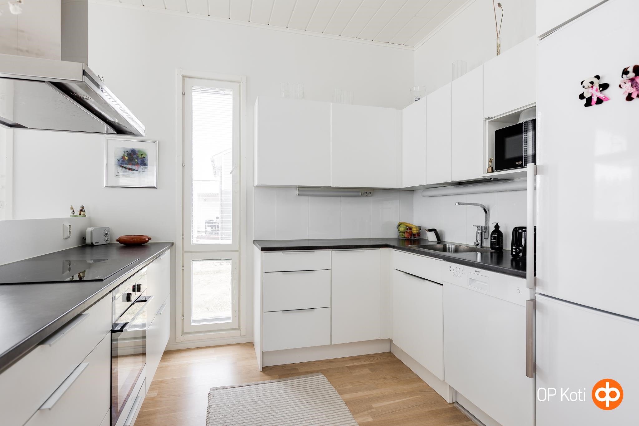 - Jääkaappipakastin, erillisuuni, liesitaso induktio, liesituuletin, astianpesukone, kaapistot, kiinteät valaisimet.