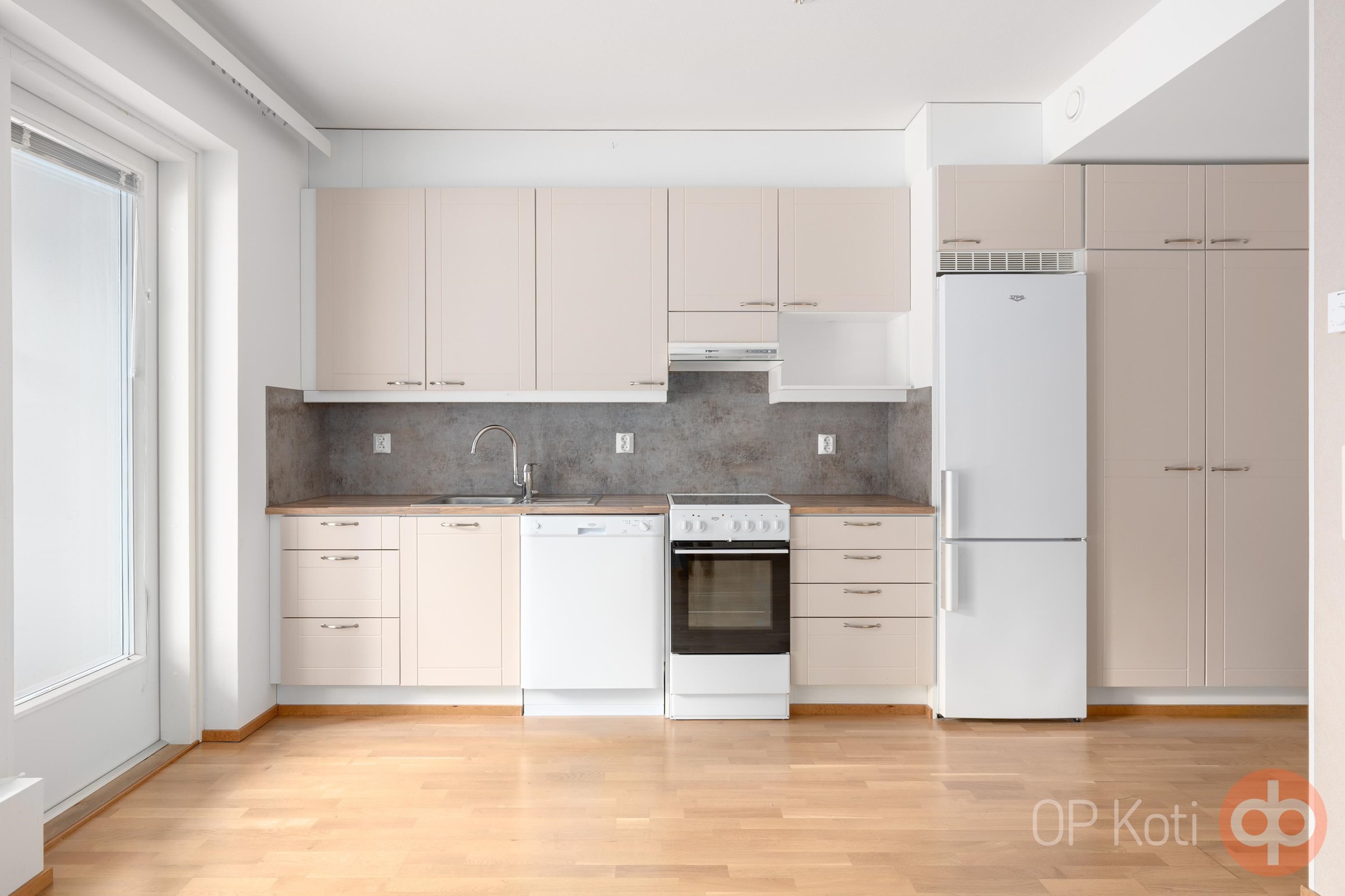 - Jääkaappipakastin, induktioliesi, liesituuletin, astianpesukone, kaapistot, kiinteät valaisimet.