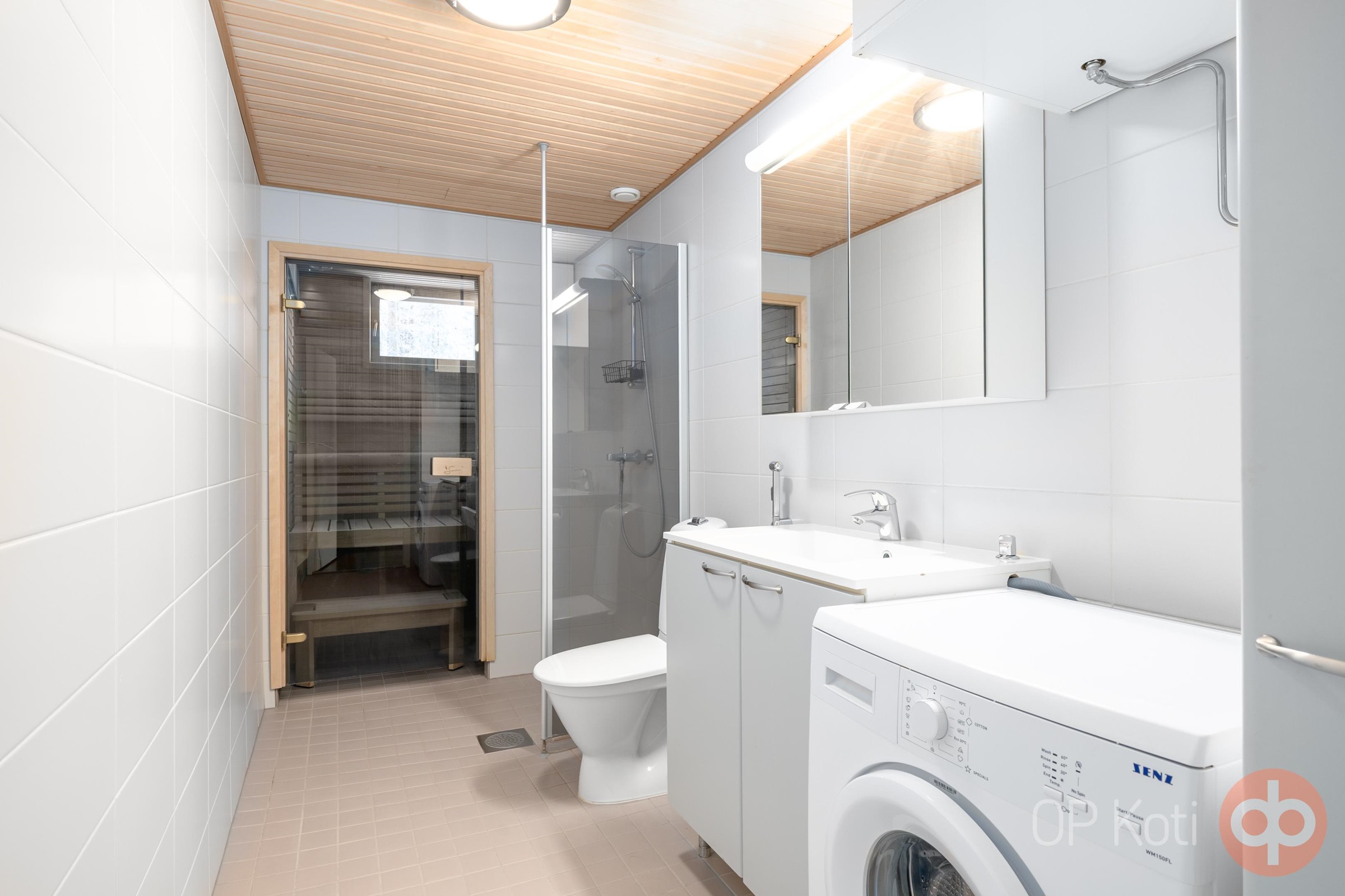 - Sauna, sähkökiuas, suihku, suihkuseinä, peilikaappi, allaskaappi, pesukoneliitäntä, lattialämmitys, kiinteät valaisimet.