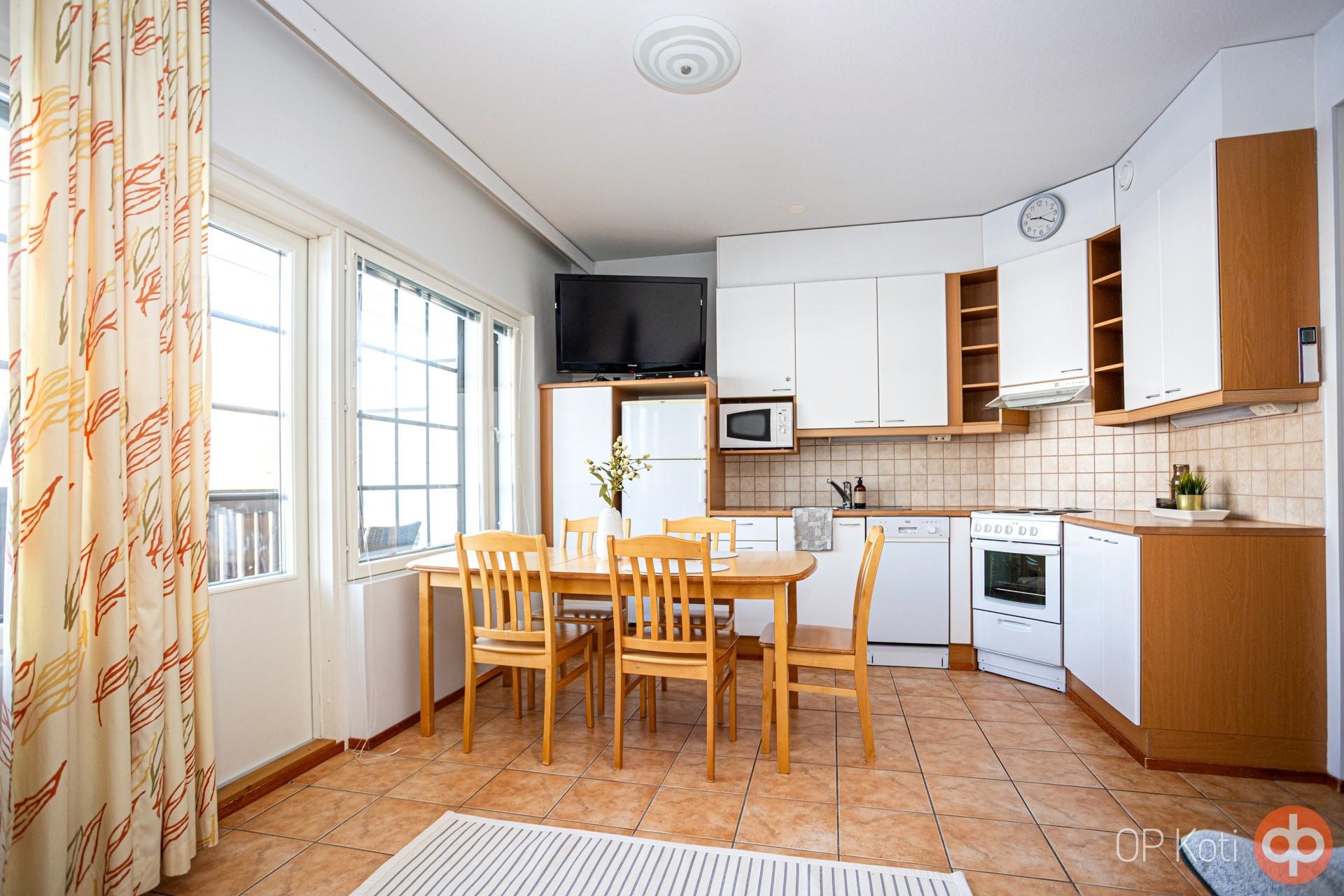 - Jenkkikaappi, sähköliesi, liesituuletin, mikroaaltouuni, astianpesukone, kaapistot, kiinteät valaisimet.