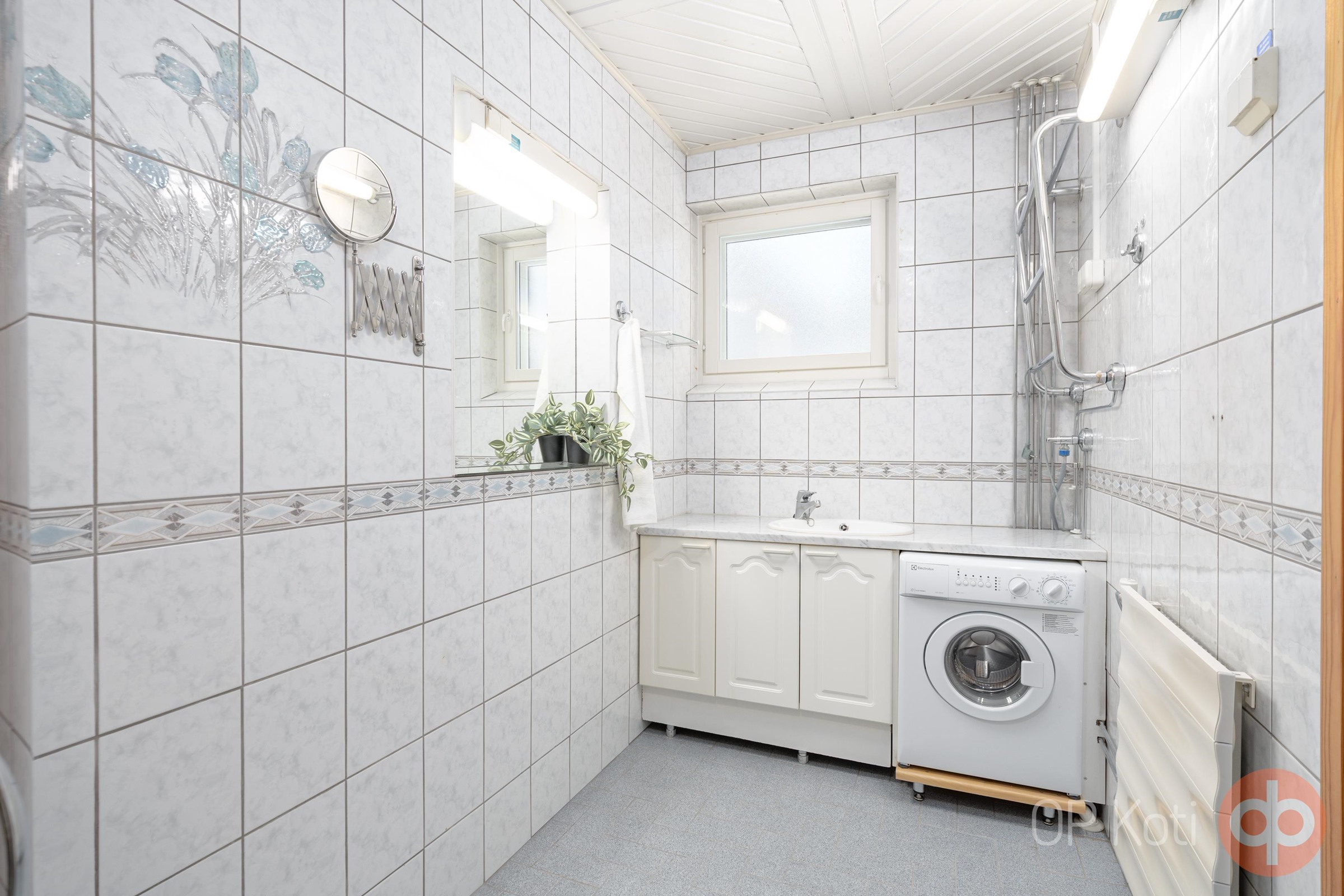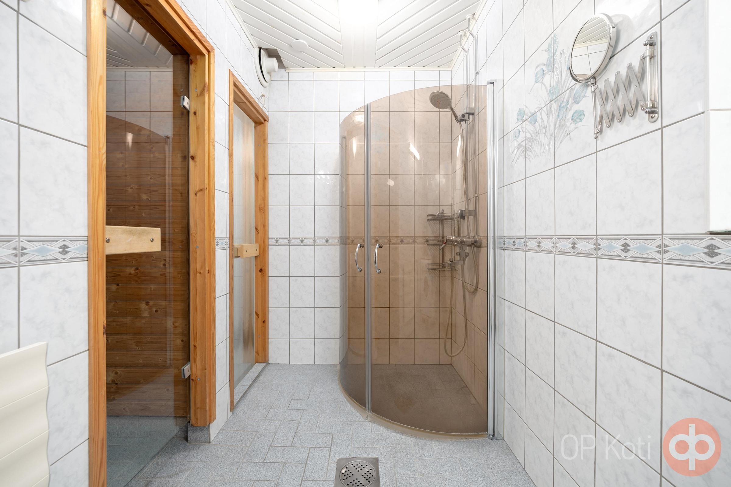- Sauna, sähkökiuas, suihku, suihkukaappi, suihkuseinä nurkassa avattavat lasiovet, peilit, peilikaappi, kaapit, allaskaappi, pesukoneliitäntä, kiinteät valaisimet.