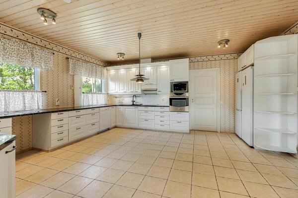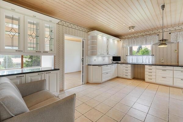 - Jääkaappi, pakastekaappi, erillisuuni, keraaminen liesi, liesituuletin, mikroaaltouuni, astianpesukone, kaapistot, kiinteät valaisimet, pöytätasojen materiaali Laminaatti.