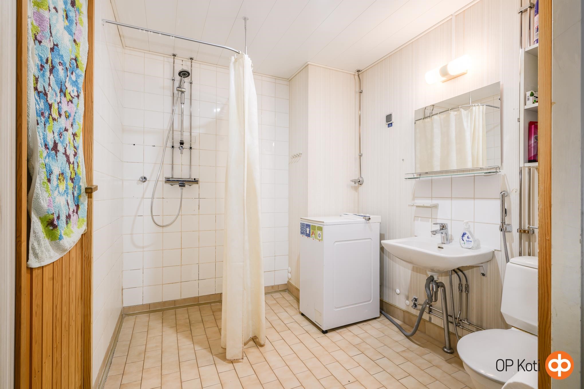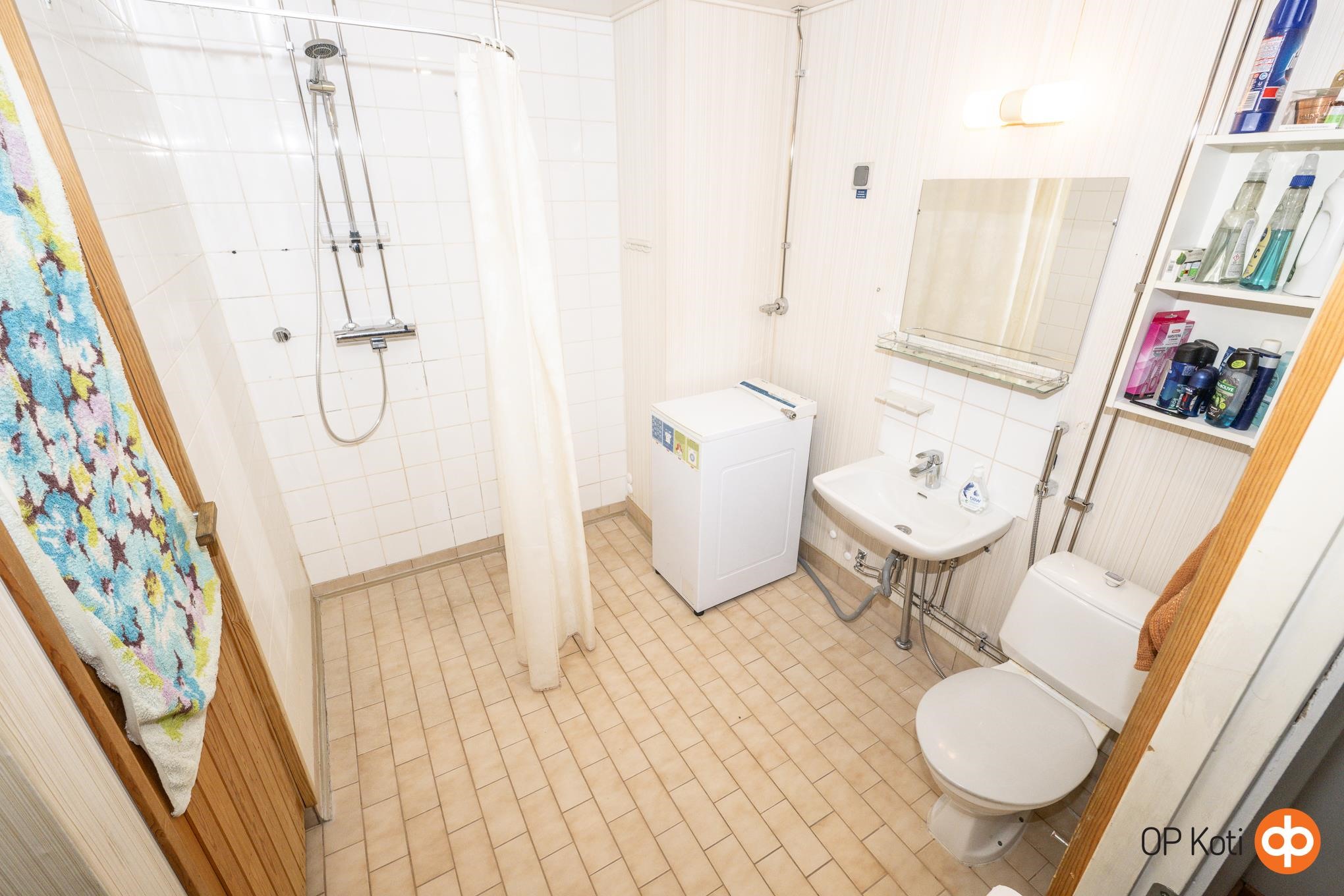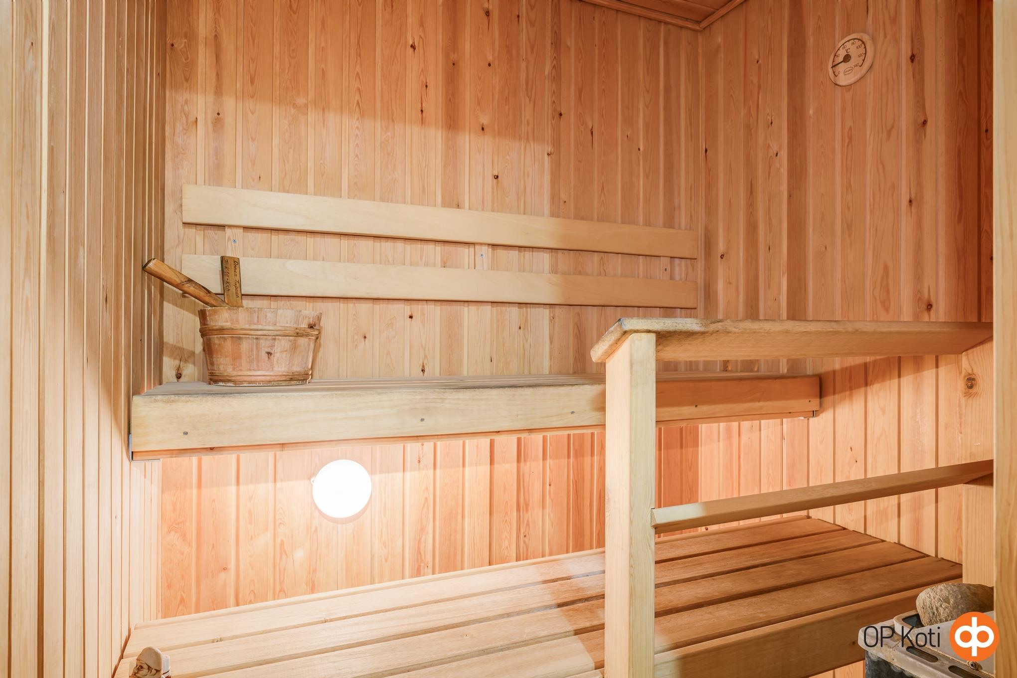 - Sauna, sähkökiuas, kylpyhuone, suihku, peilit, peilikaappi, pesukoneliitäntä, kiinteät valaisimet.