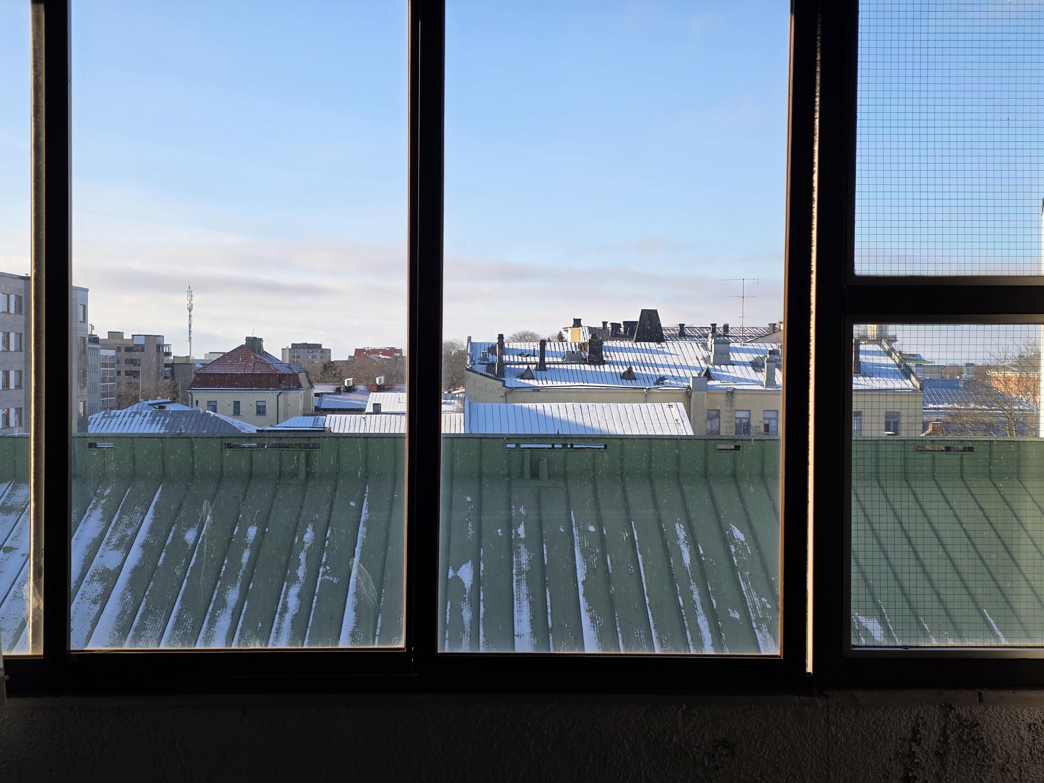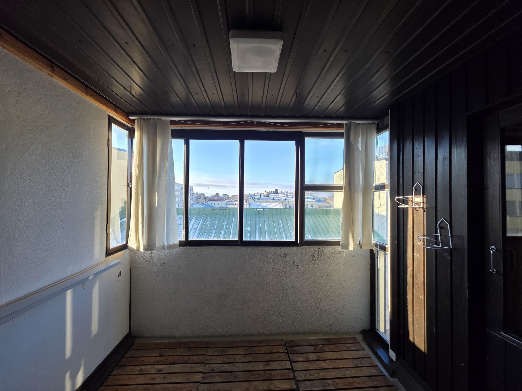 - Lasitettu parveke länteen, näkymä kattojen yli