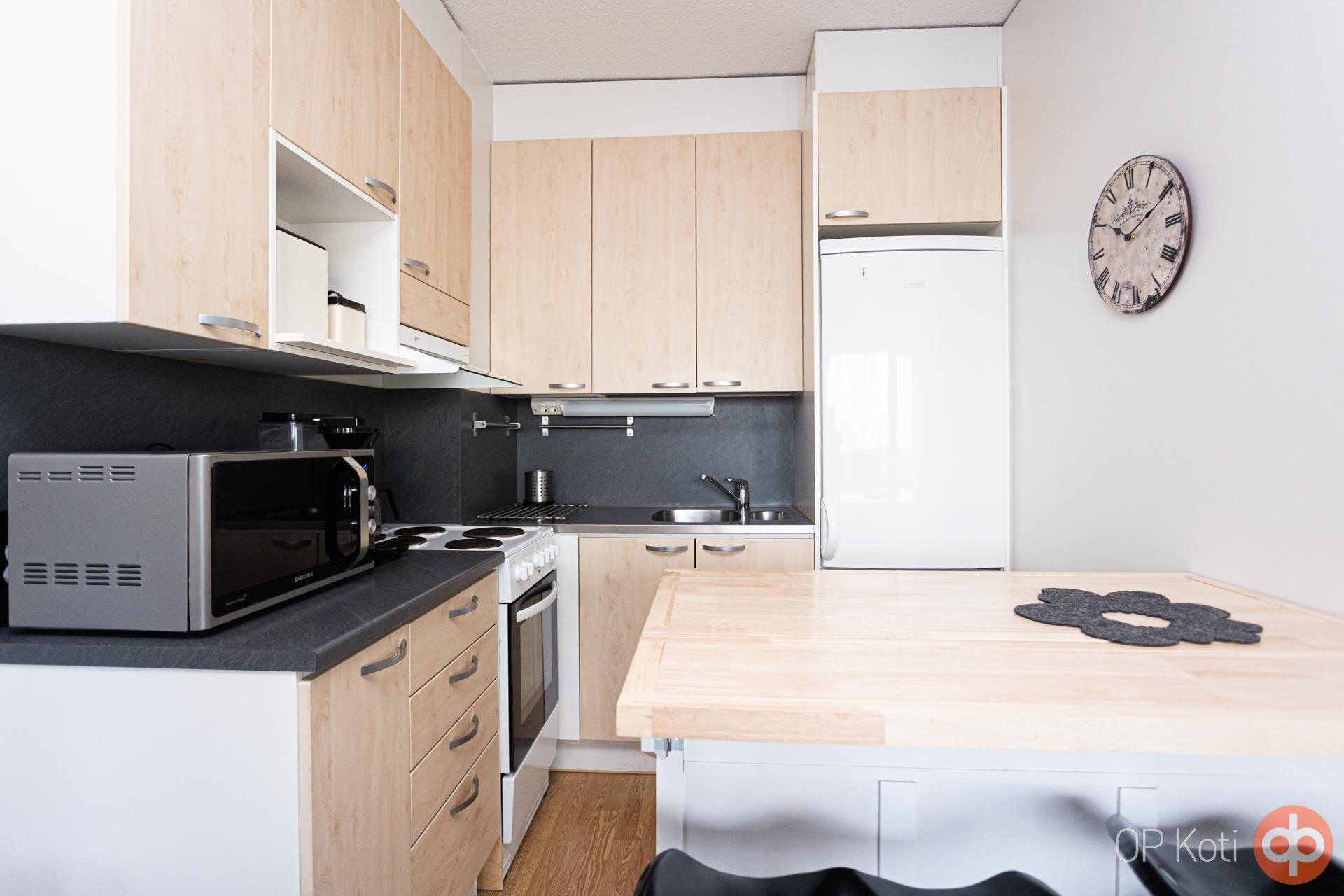 - Jääkaappipakastin, sähköliesi, liesituuletin, kaapistot Uusittu runkoineen 2010., kiinteät valaisimet.