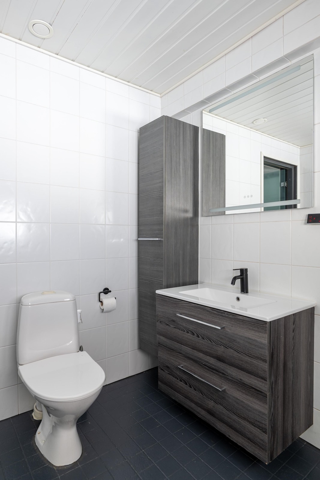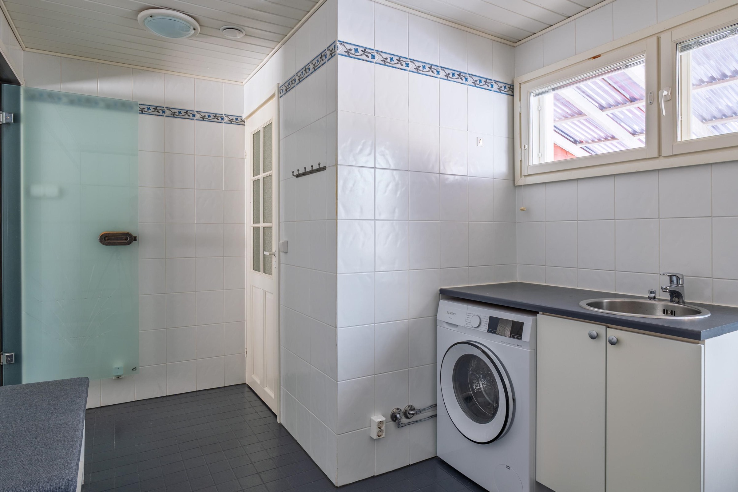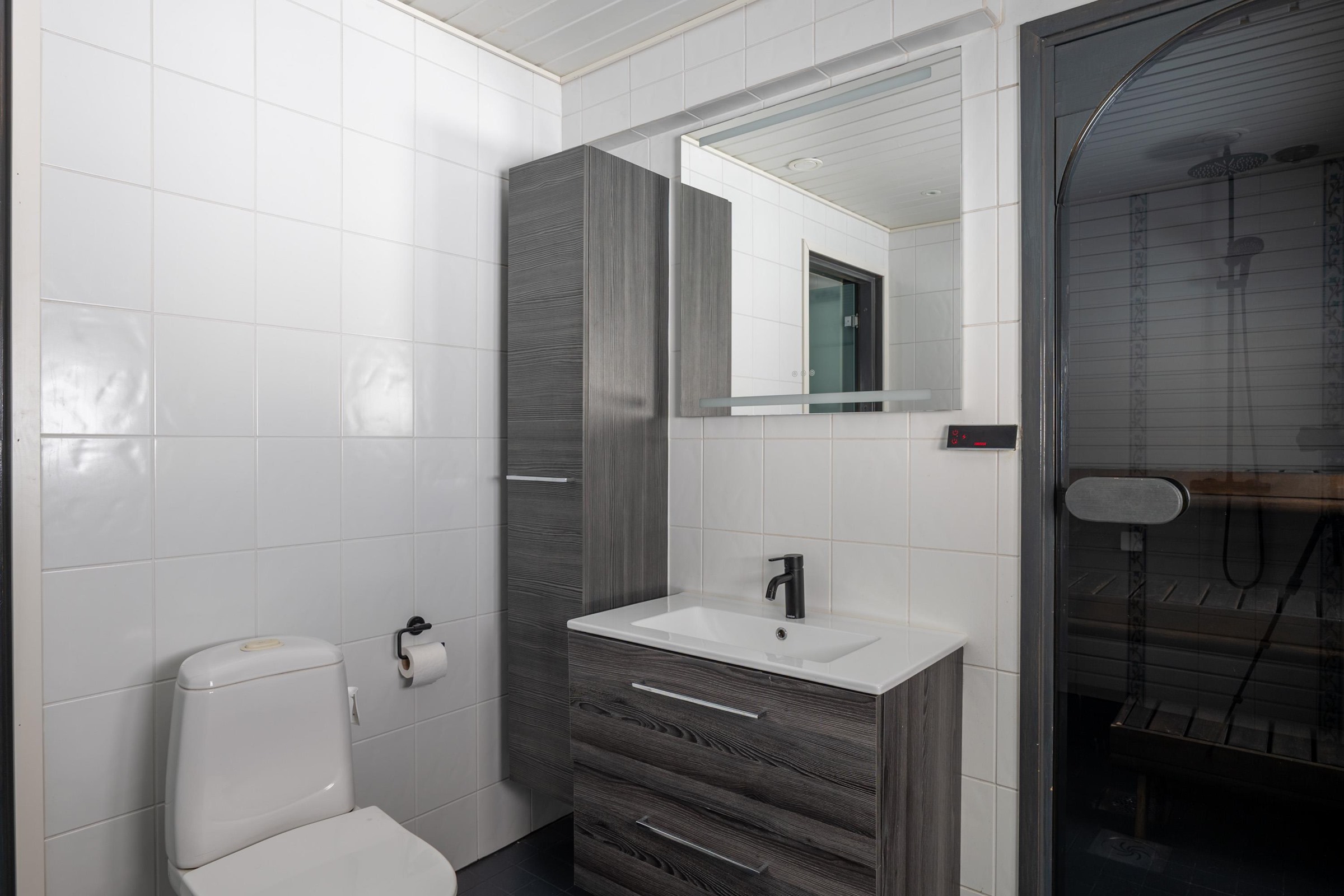 - Sauna: sähkökiuas. Kylpyhuone: wc, suihku, peili valolla, allaskaappi, pystykaappi. Kodinhoitohuone: pesukoneliitäntä, kaapistot. Wc: allaskaappi, peilikaappi.