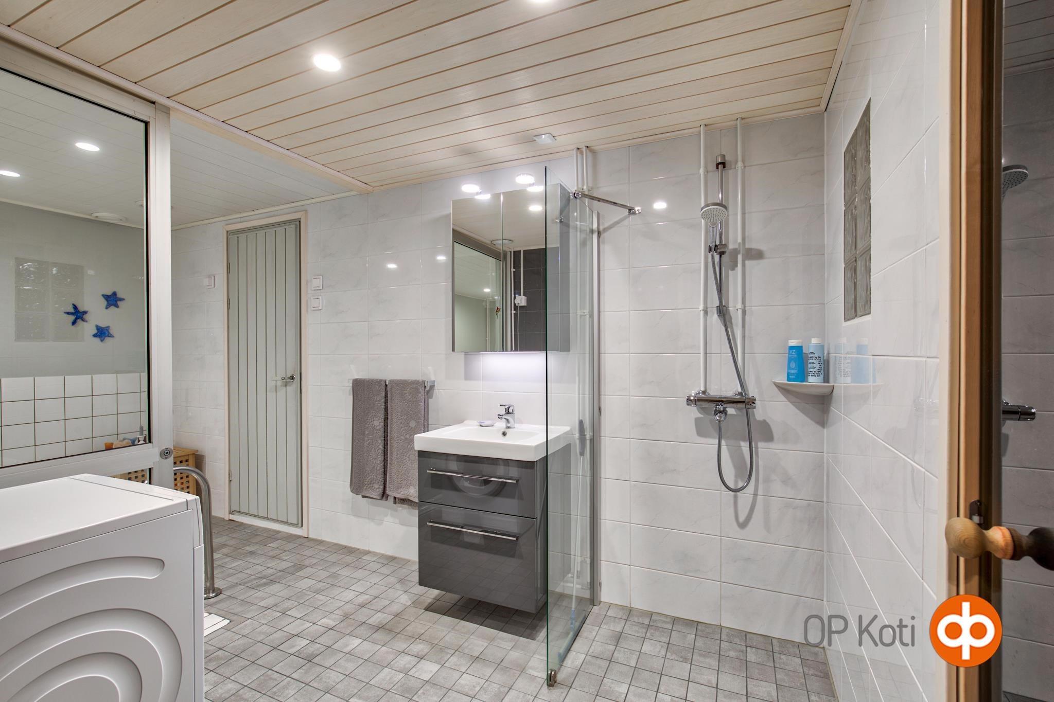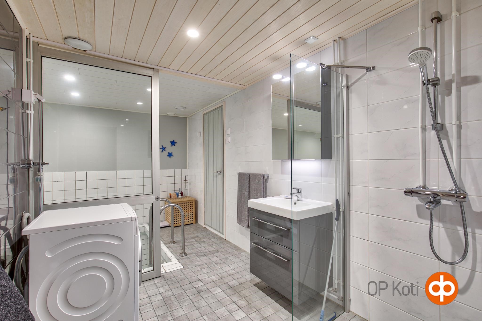 - Sähkökiuas, kylpyhuone, erillinen wc 2 kpl, suihku, peilikaappi, allaskaappi, pesukoneliitäntä, lattialämmitys Sähkövastus pesuhuoneessa ja saunassa., kiinteät valaisimet.