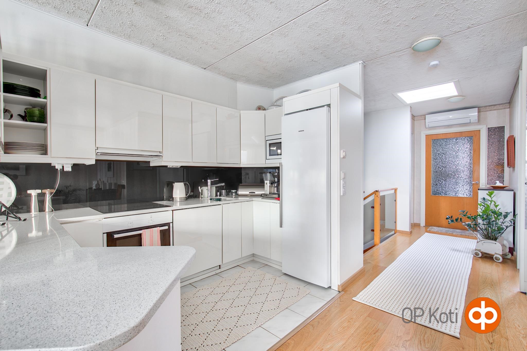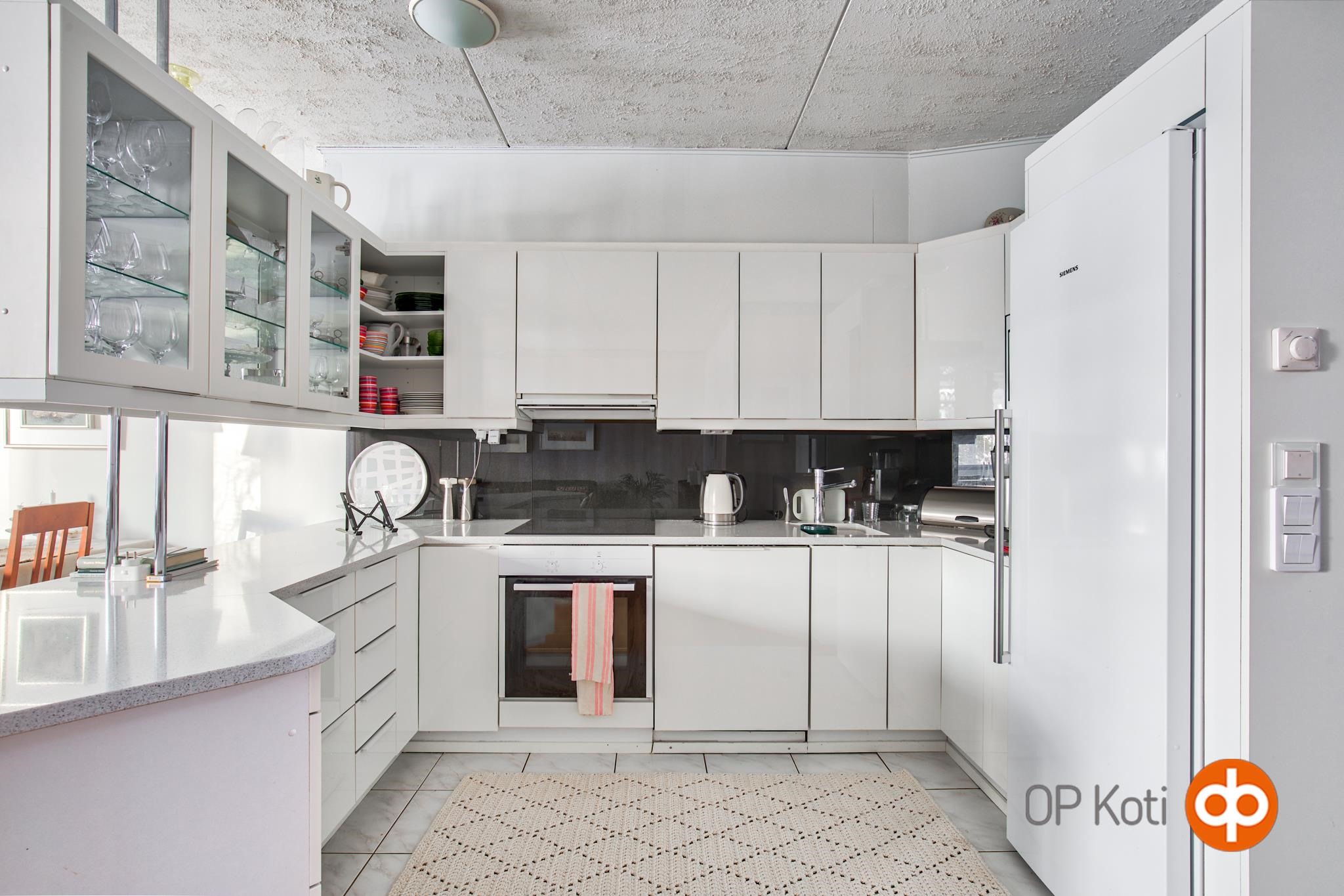 - Jääkaappi, erillisuuni, induktioliesi, liesituuletin, astianpesukone, kaapistot, kiinteät valaisimet, Kivitasot.